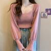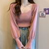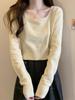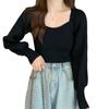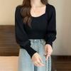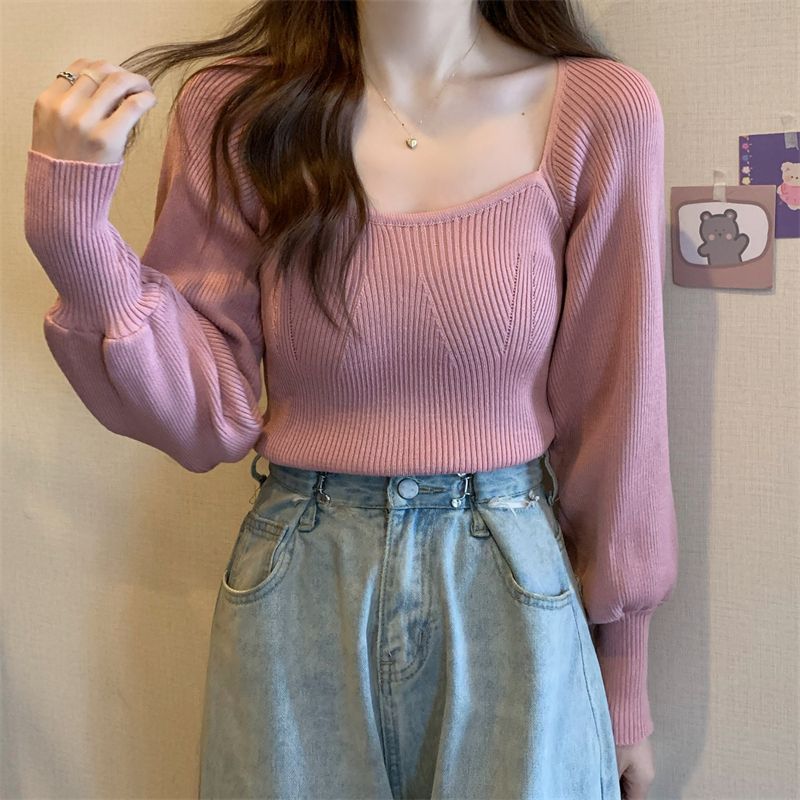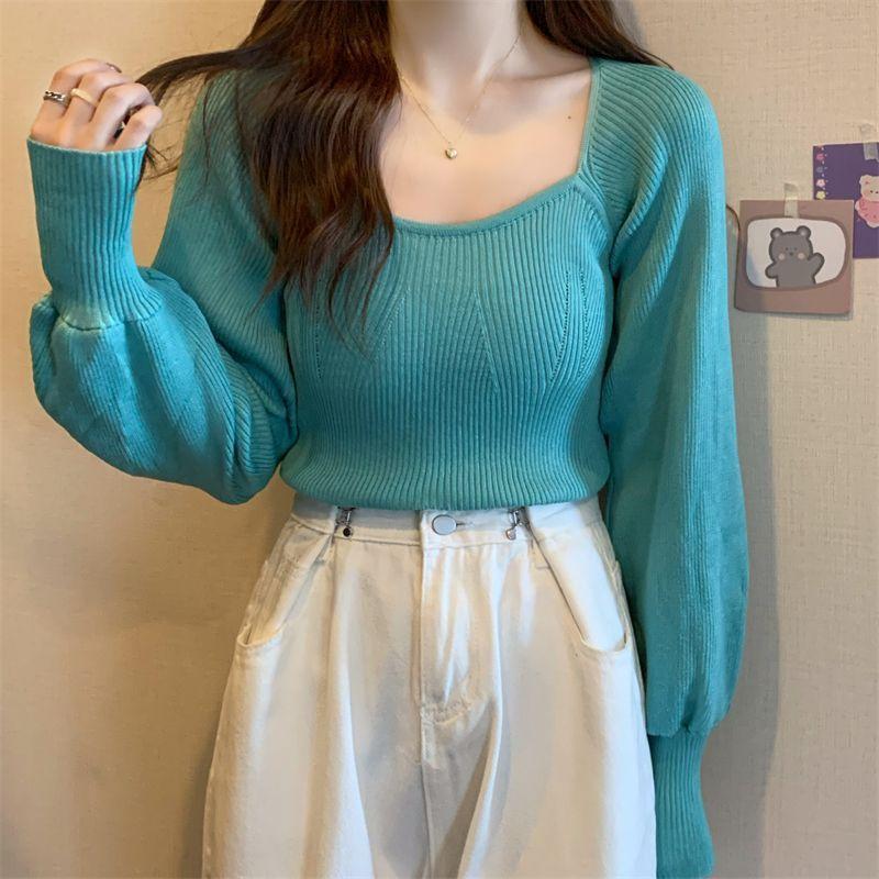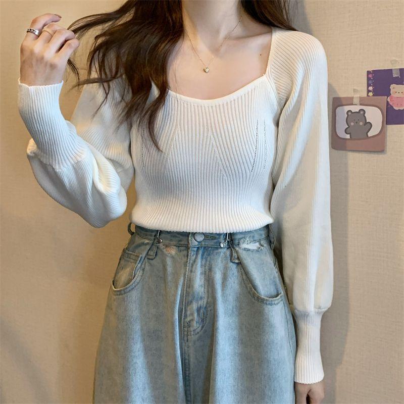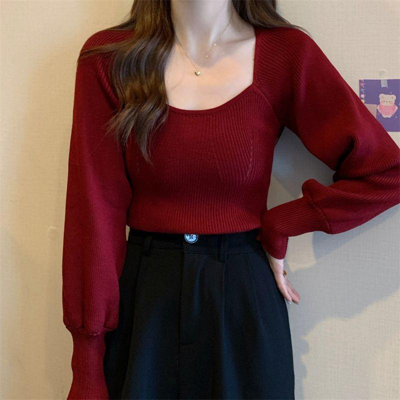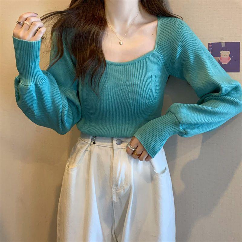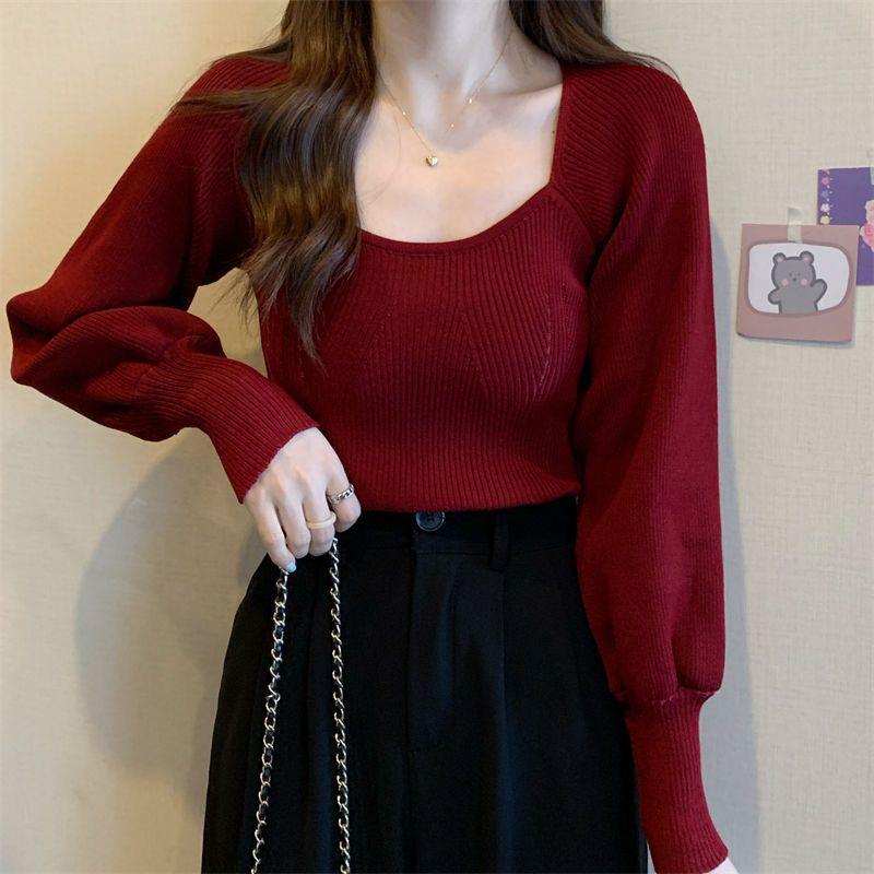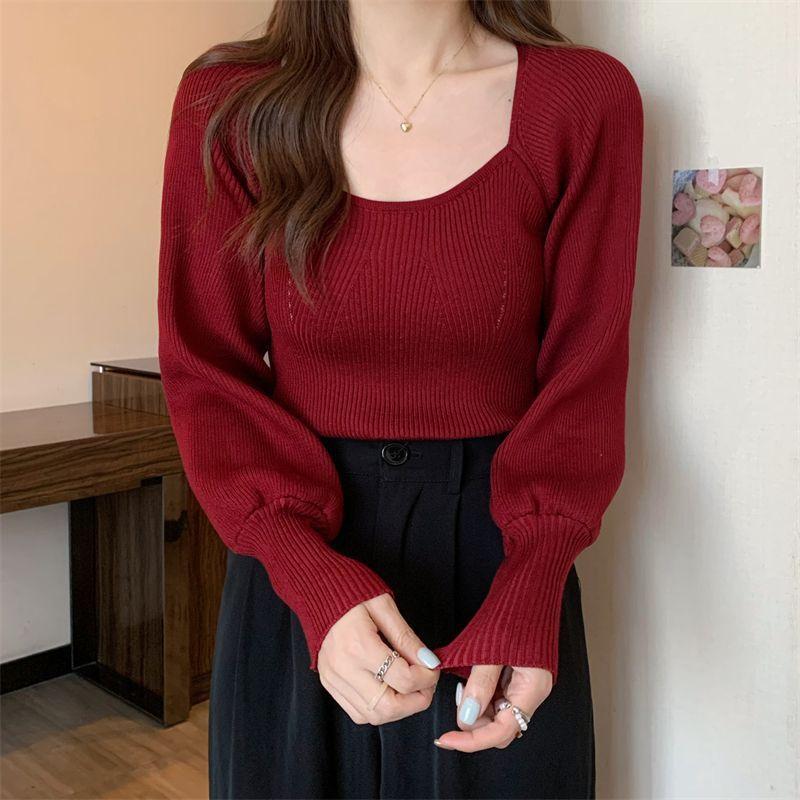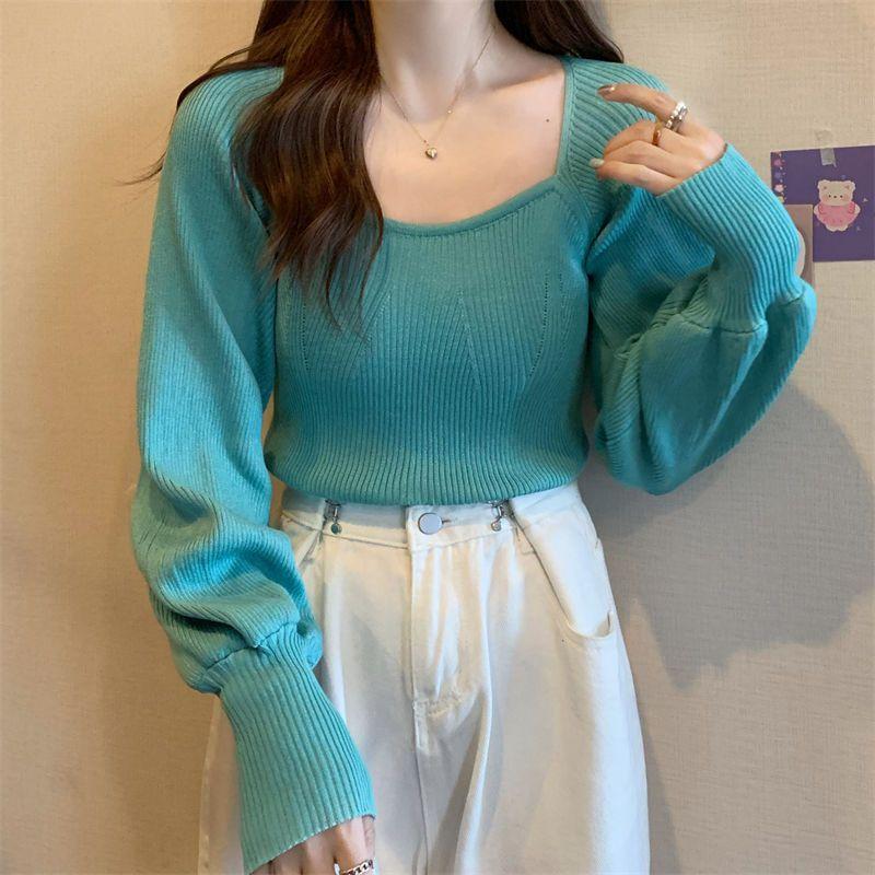 Suéter de cuello cuadrado Design Sense 2024 para mujer, suéter básico corto ajustado de primavera y otoño, moderno y versátil.