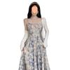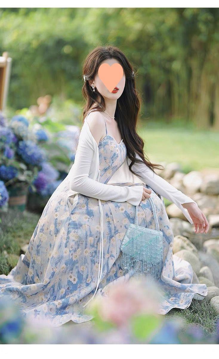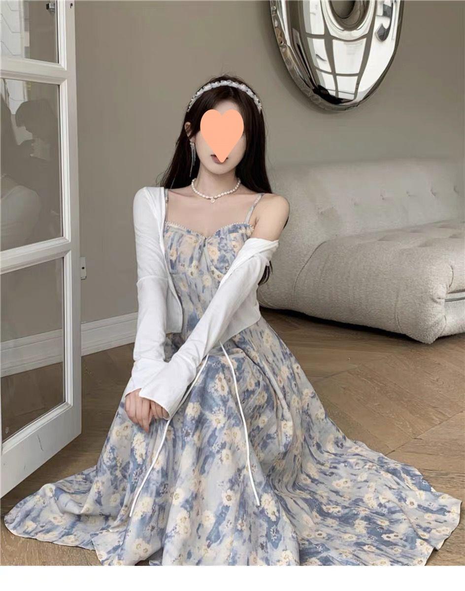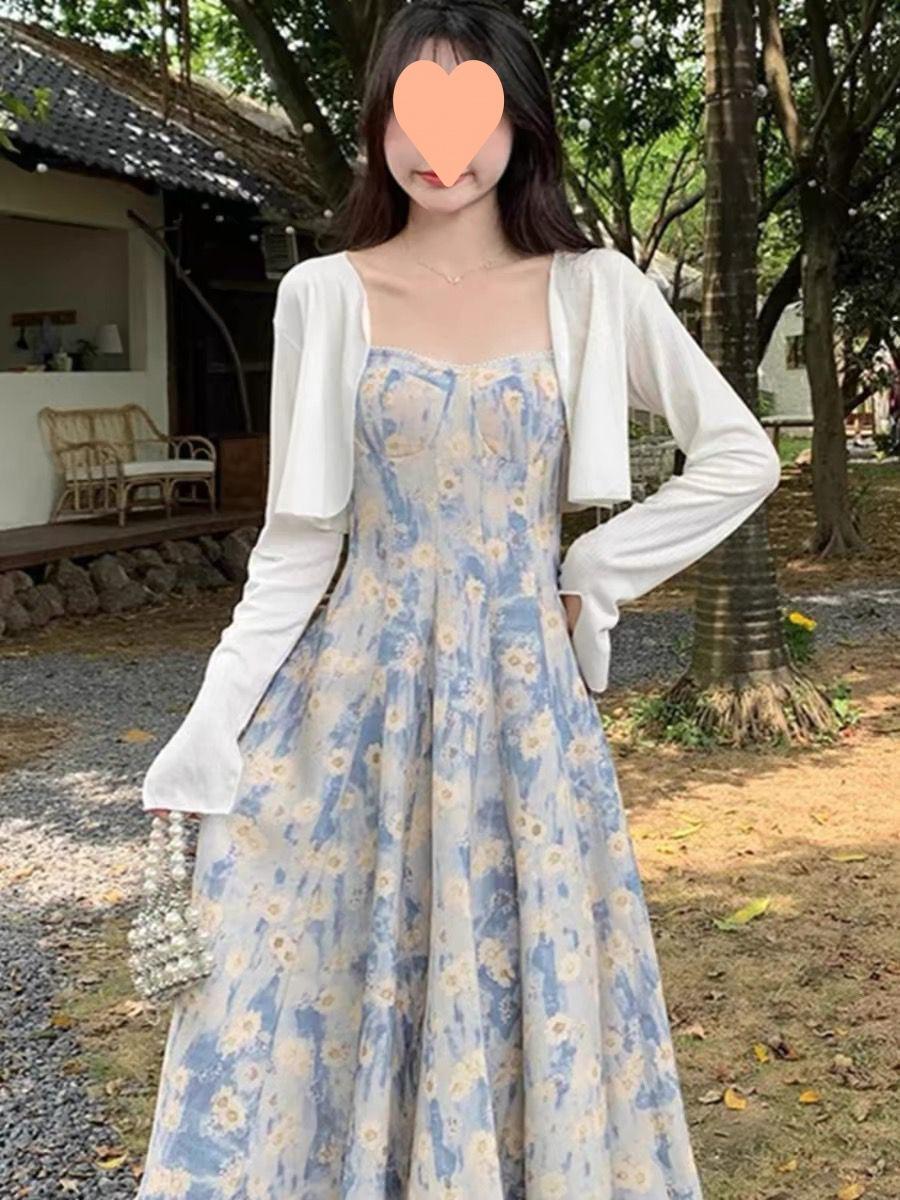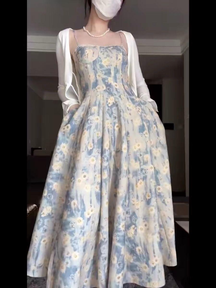 2025 Nuevo Conjunto de Dos Piezas Cárdigan con Falda Vestido de Tirantes Floral Azul Francés Falda Larga de Cintura para Mujer Primavera y Verano