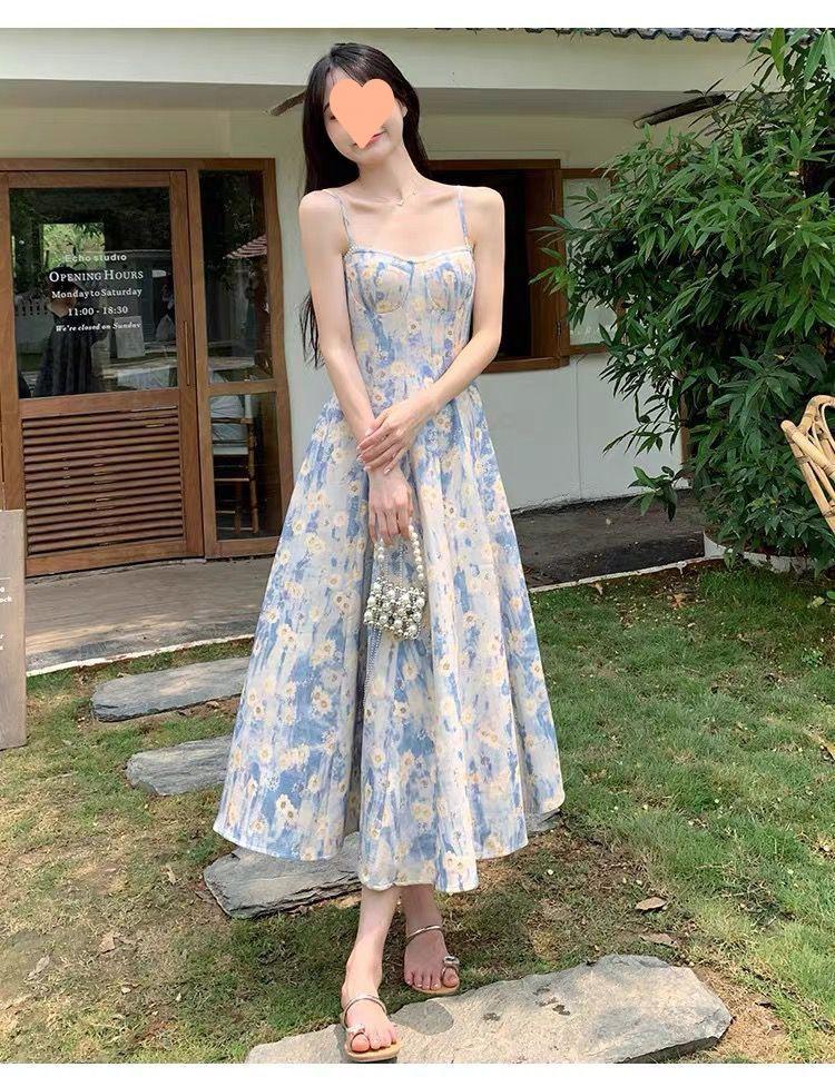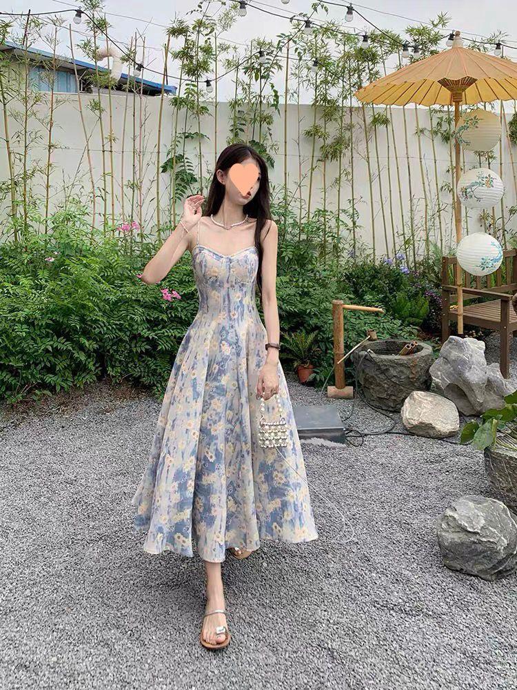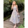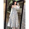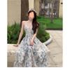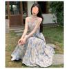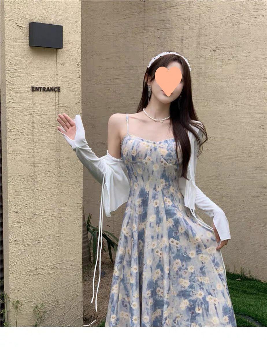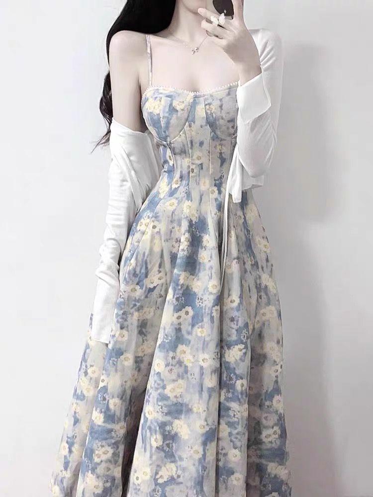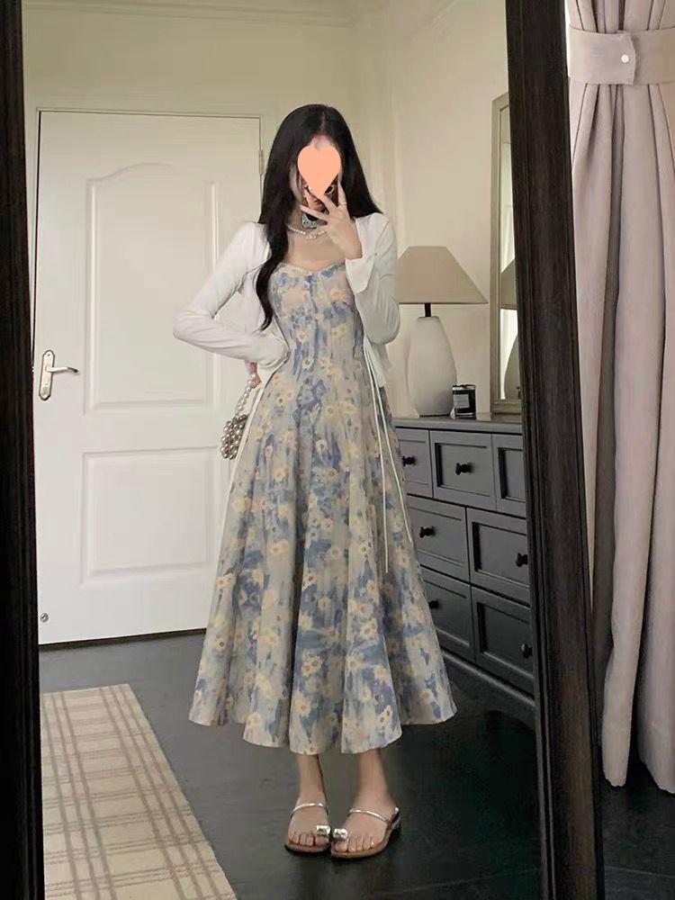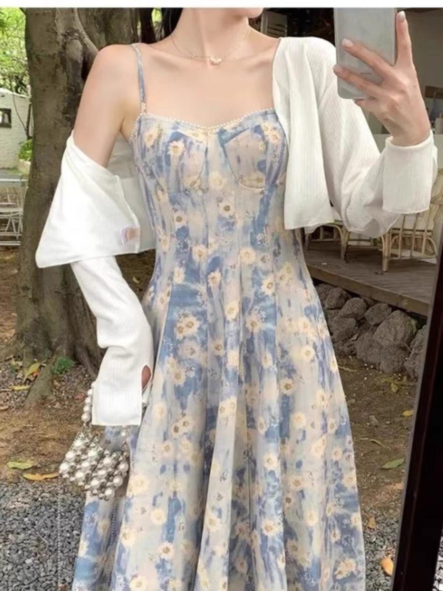2025 Nuevo Conjunto de Dos Piezas Cárdigan con Falda Vestido de Tirantes Floral Azul Francés Falda Larga de Cintura para Mujer Primavera y Verano