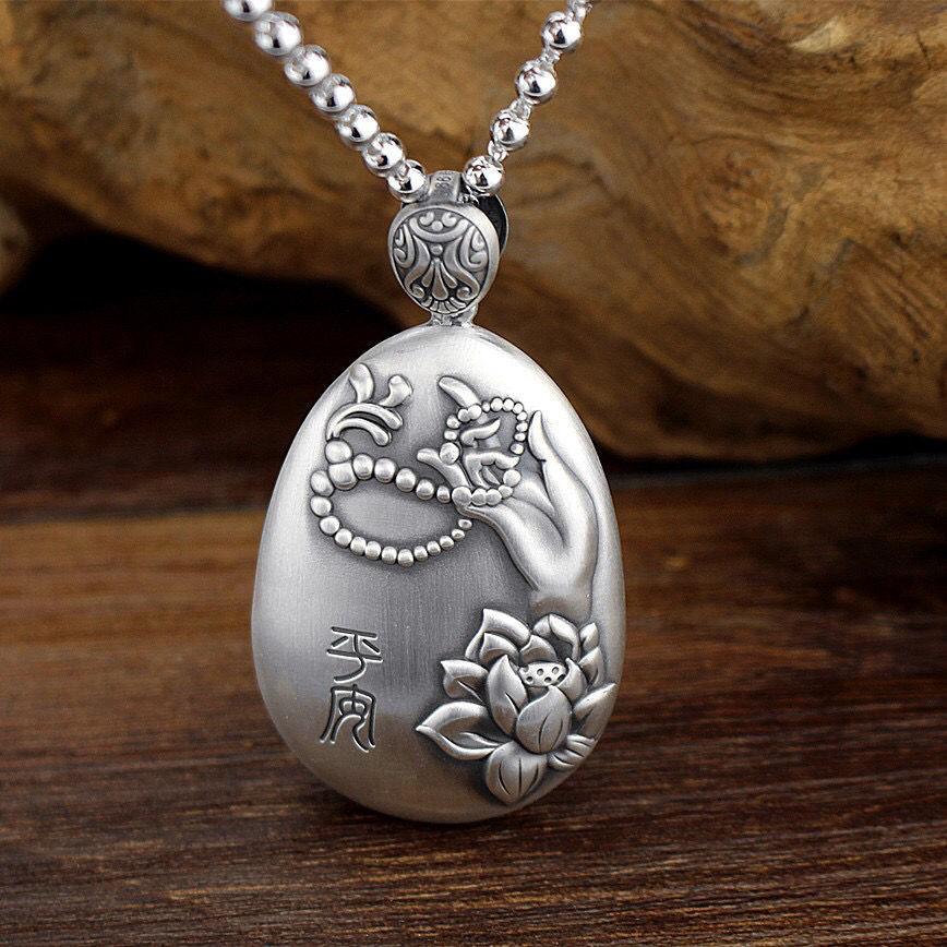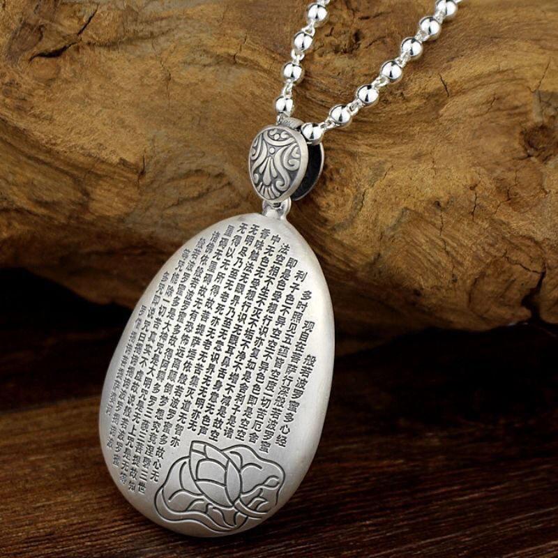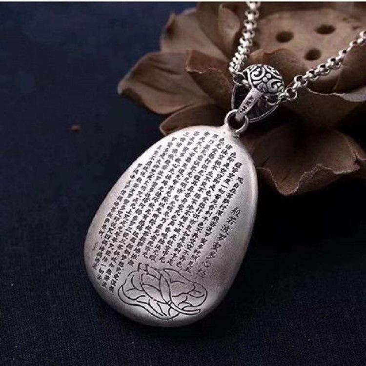 Colgante de Sutra de Corazón de Plata Esterlina con Mano de Buda Femenina, Colgante de Plata Pura con Loto, Escrituras de Protección Corporal, Colgante de Cadena con Dinero con Gota de Agua