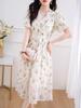 Vestido de verano dulce y elegante con cuello redondo, cordones, cintura adelgazante, costuras de color liso, plisado, de manga corta para mujer