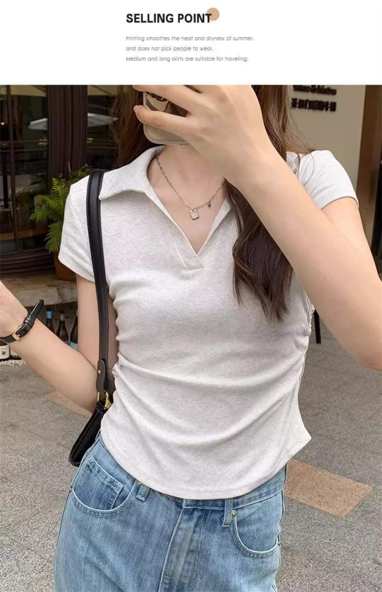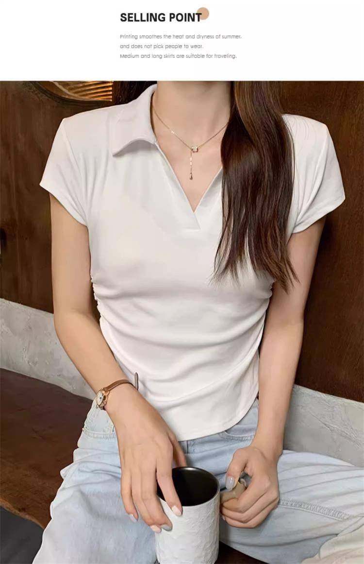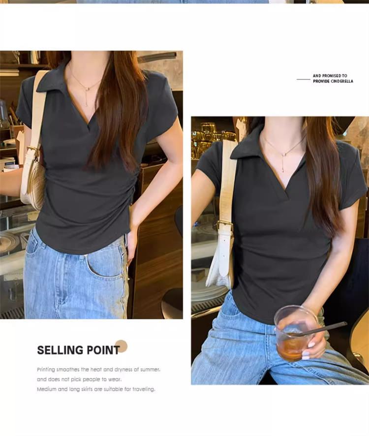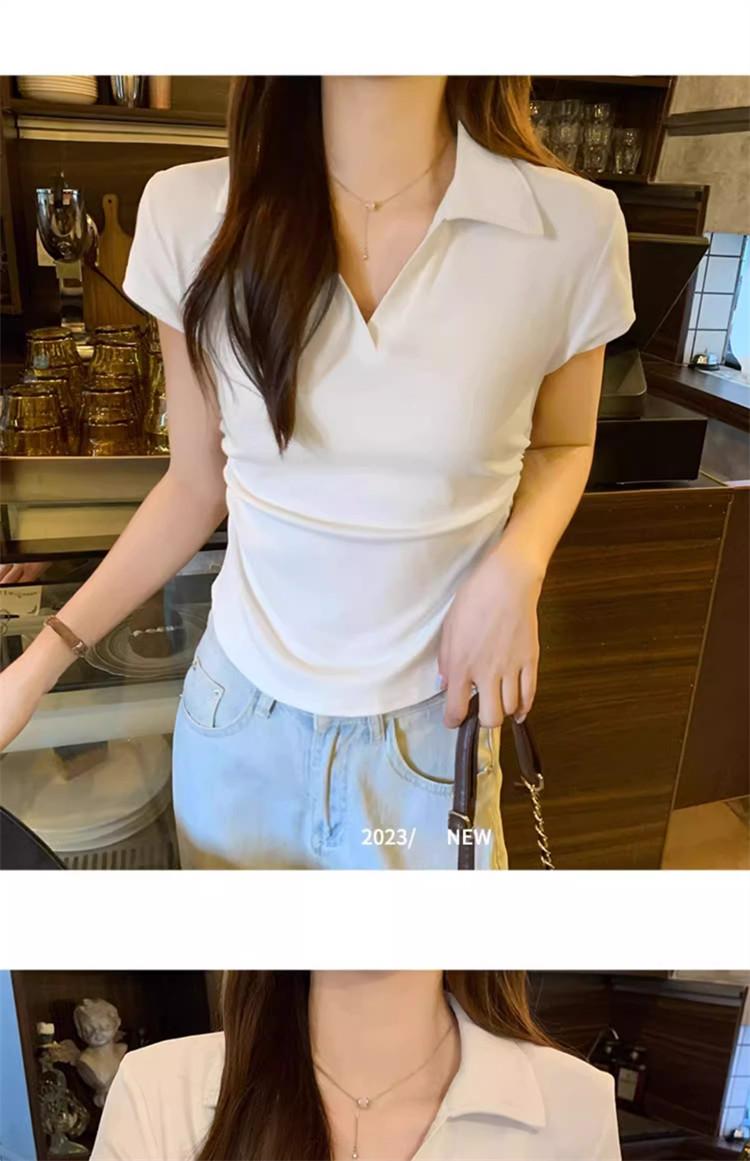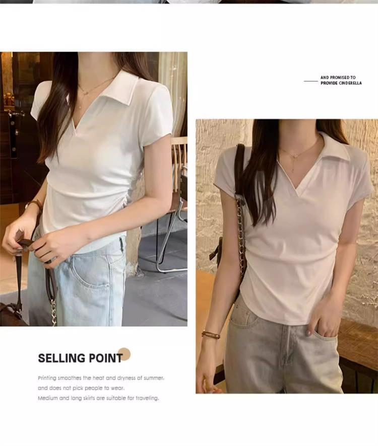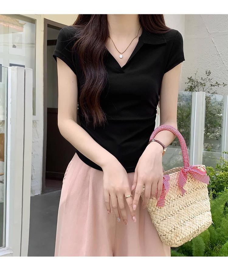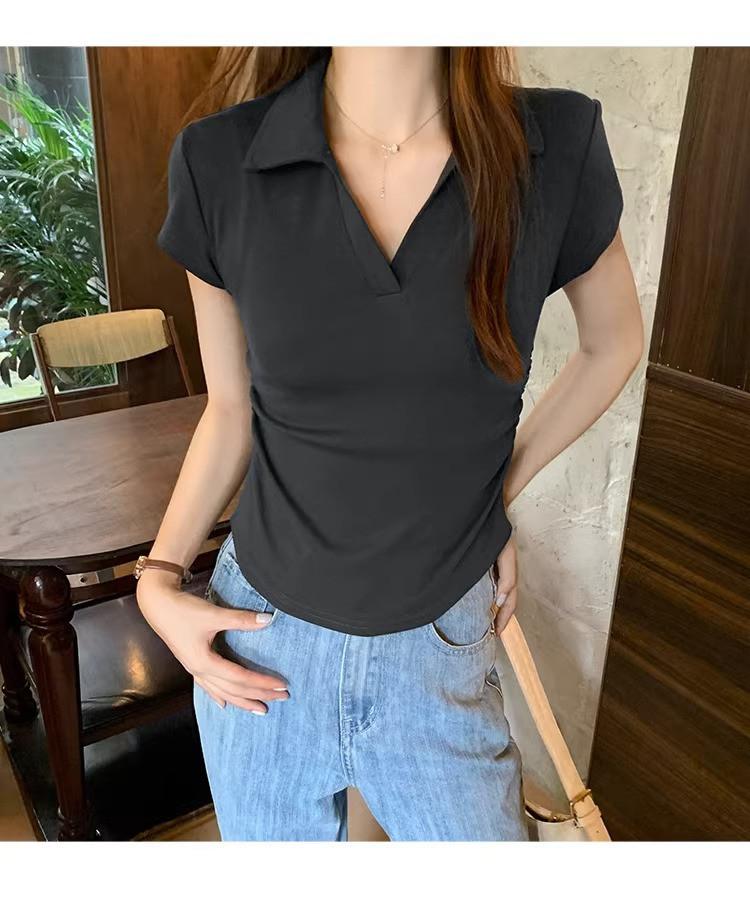 Camiseta de Cuello en V Hombro Derecho Manga Corta Estilo Verano Único Chic Slim Corta Plisada Sexy Polo