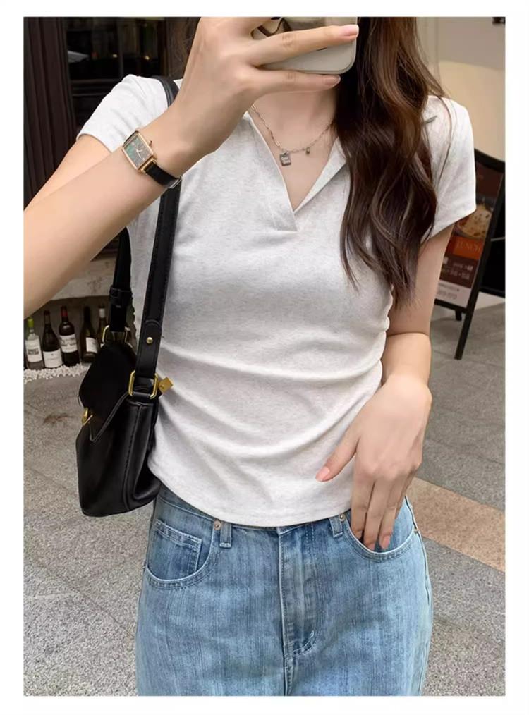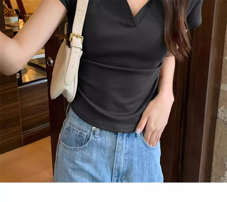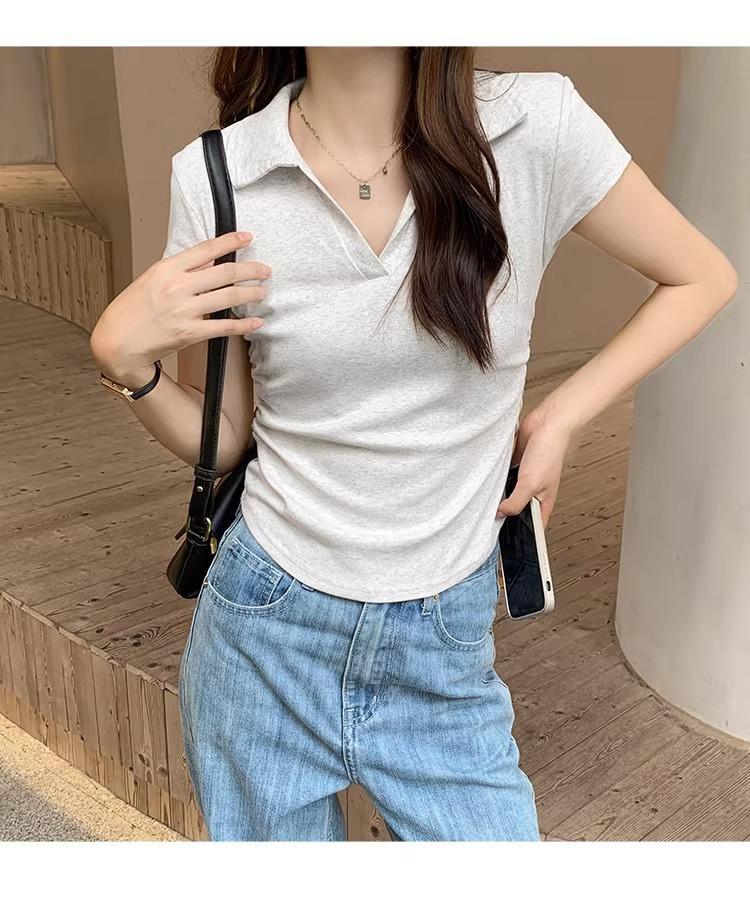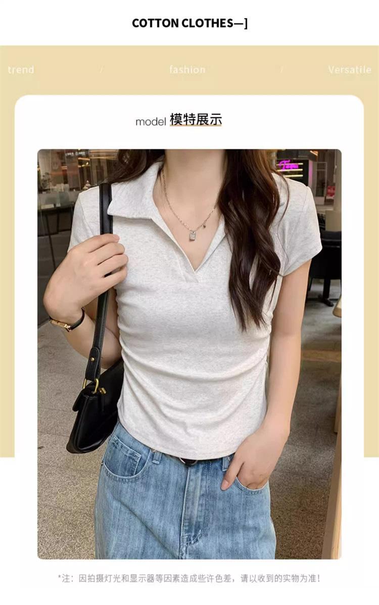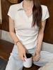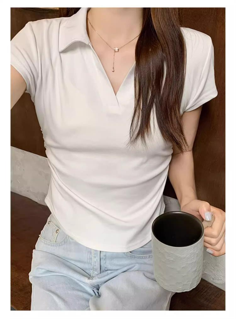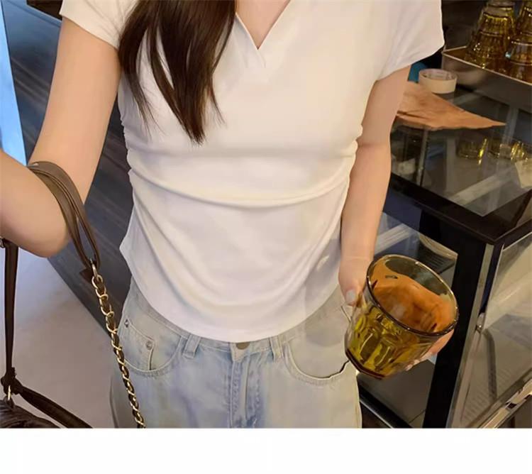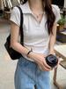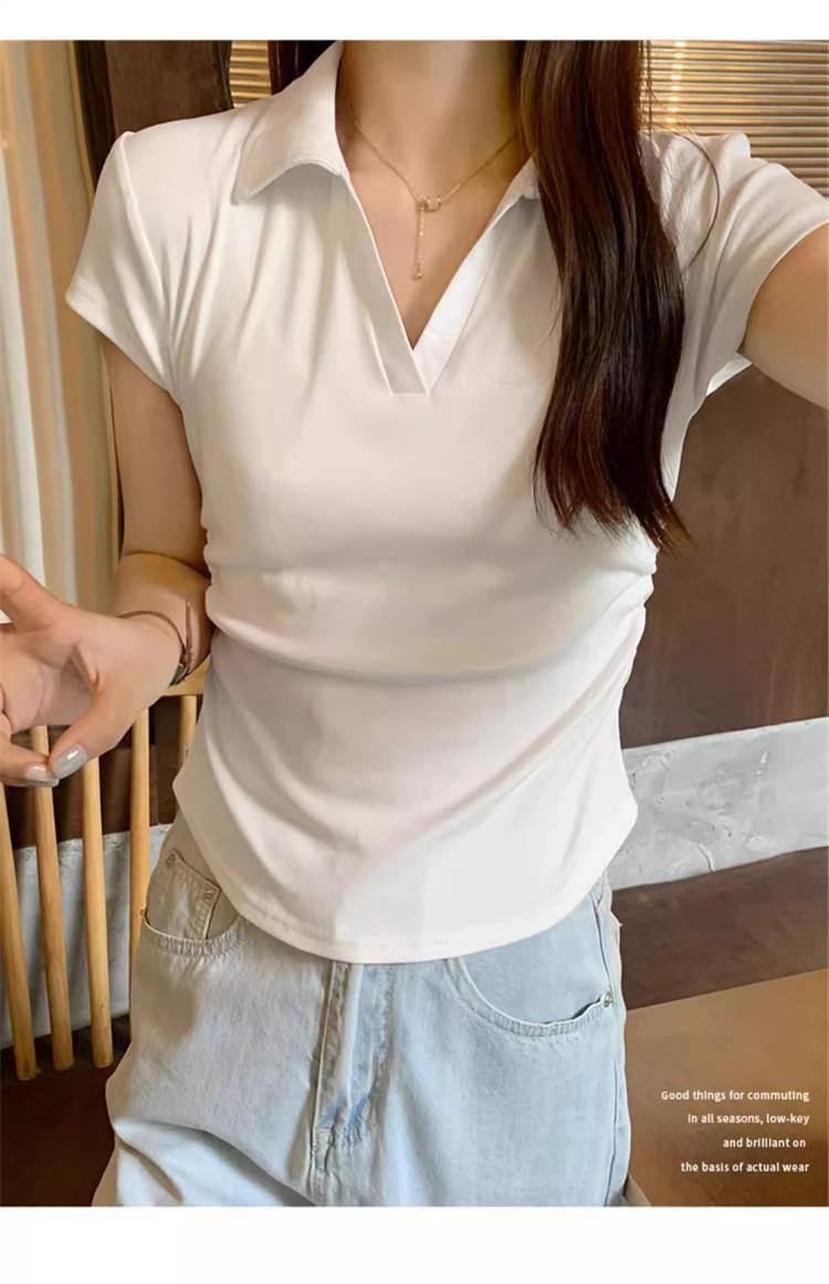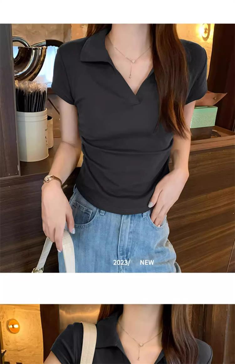 Camiseta de Cuello en V Hombro Derecho Manga Corta Estilo Verano Único Chic Slim Corta Plisada Sexy Polo