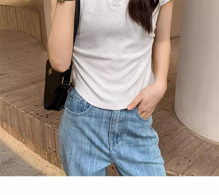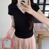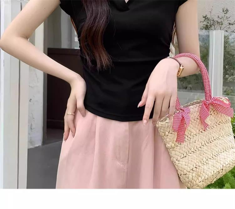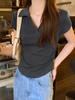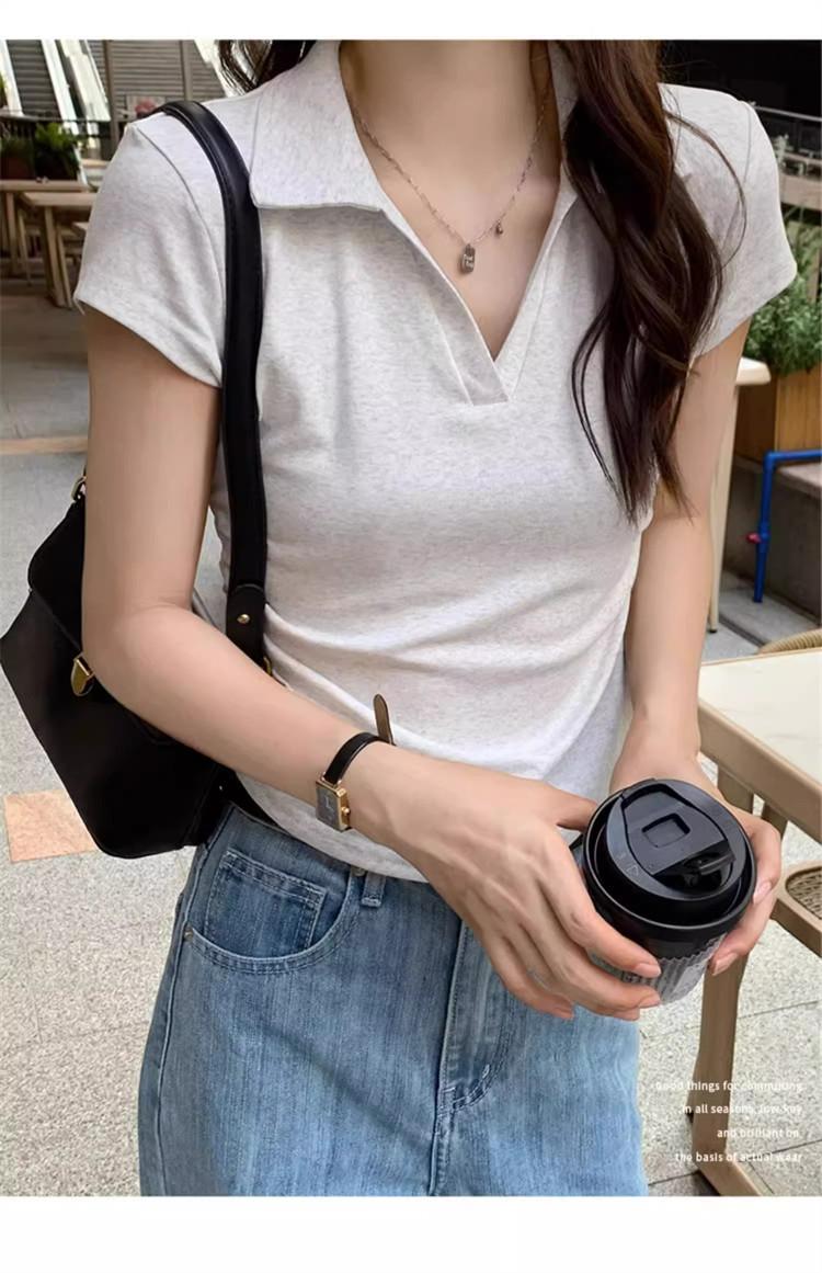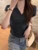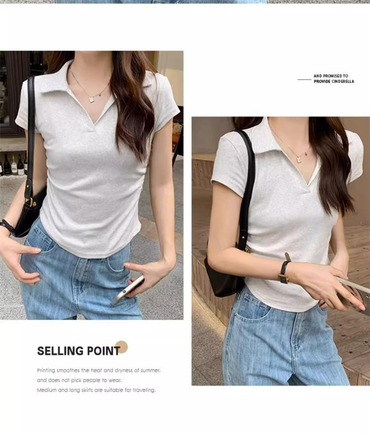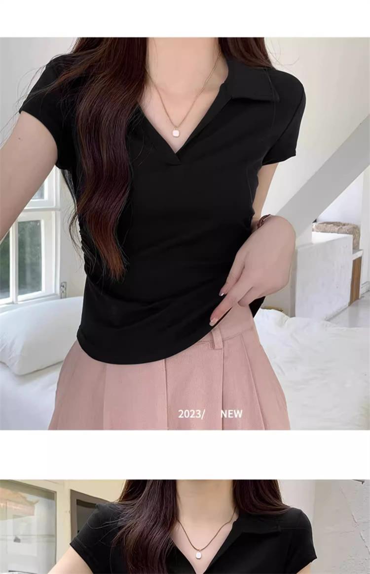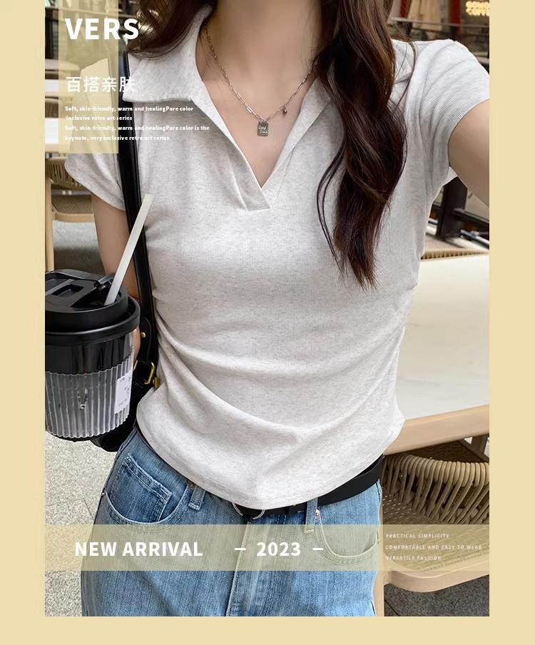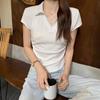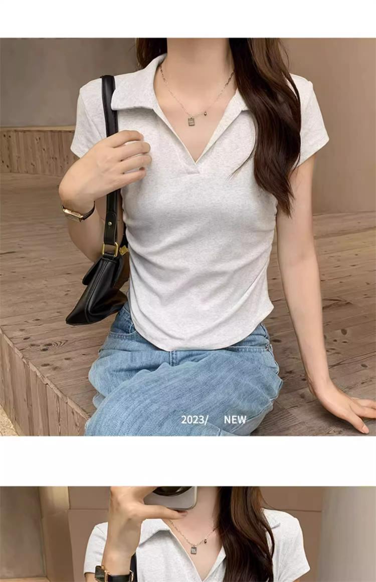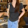 Camiseta de Cuello en V Hombro Derecho Manga Corta Estilo Verano Único Chic Slim Corta Plisada Sexy Polo
