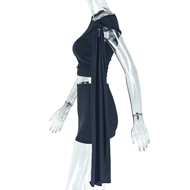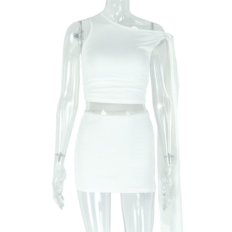 Traje de falda asimétrica con cuello oblicuo y tiras cruzadas de estilo europeo y americano, falda ajustada a la cadera, ropa de mujer sexy de dos piezas de color sólido