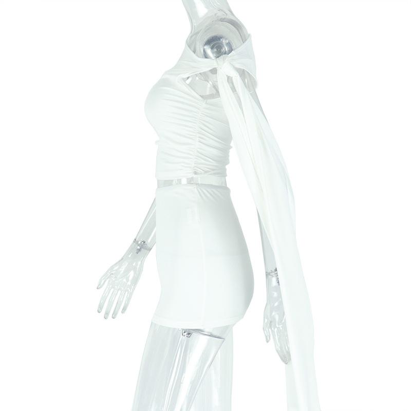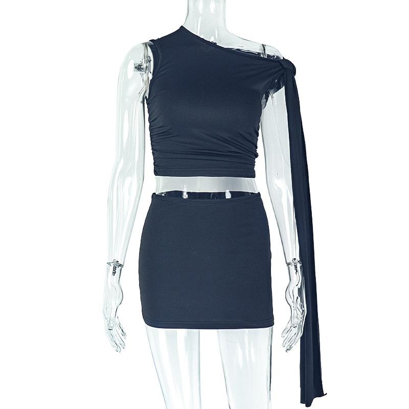 Compra Traje de falda asimétrica con cuello oblicuo y tiras cruzadas de estilo europeo y americano, falda ajustada a la cadera, ropa de mujer sexy de dos piezas de color sólido al por mayor en Joom.pro
