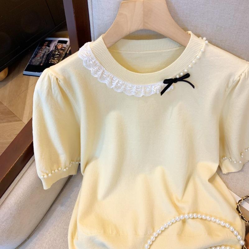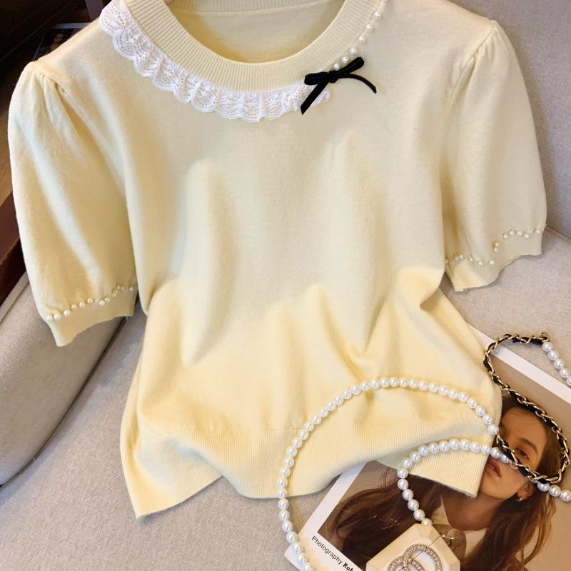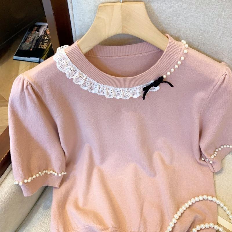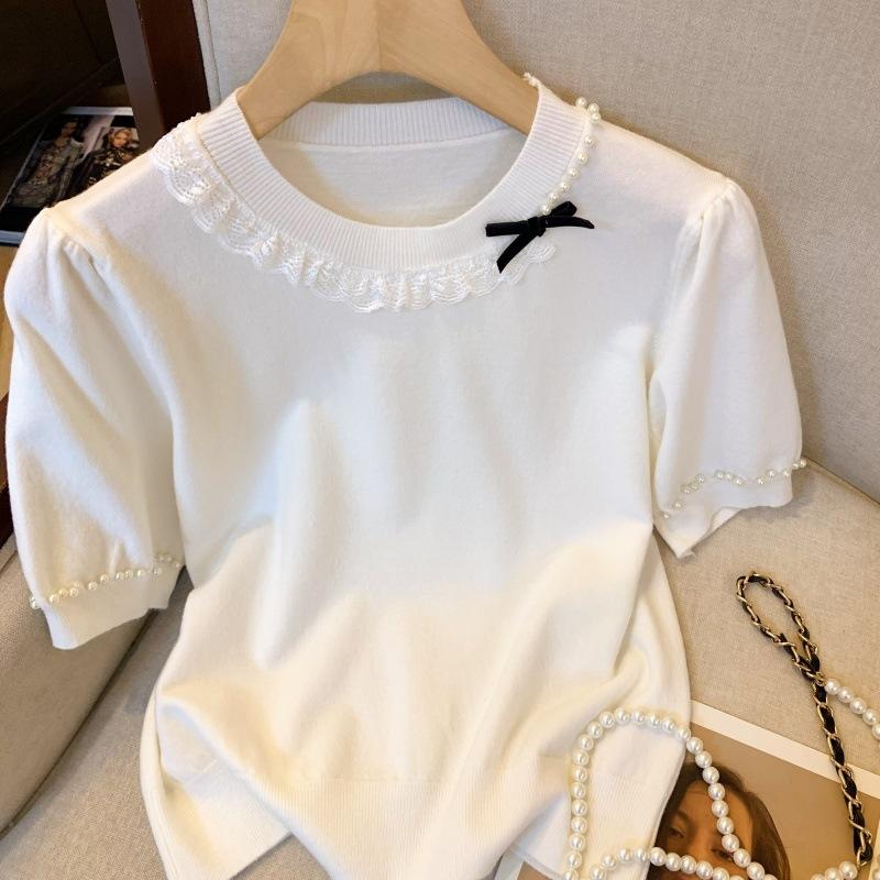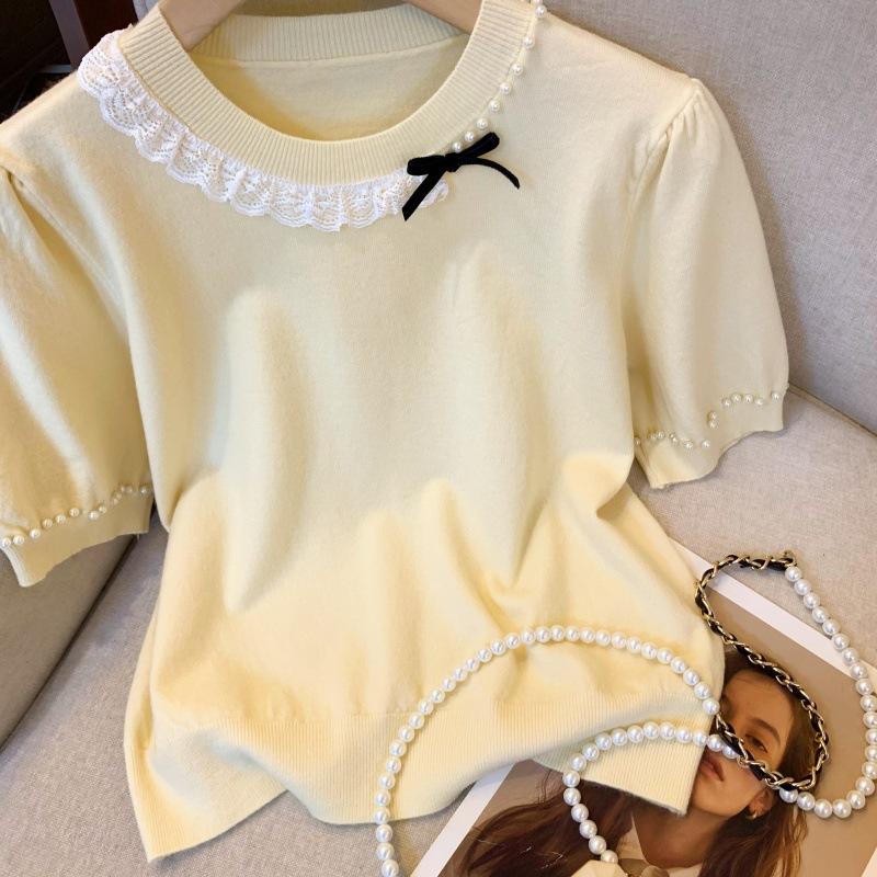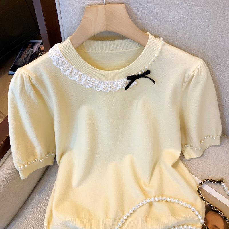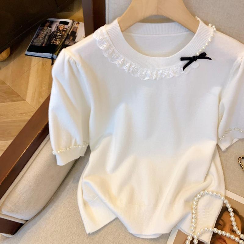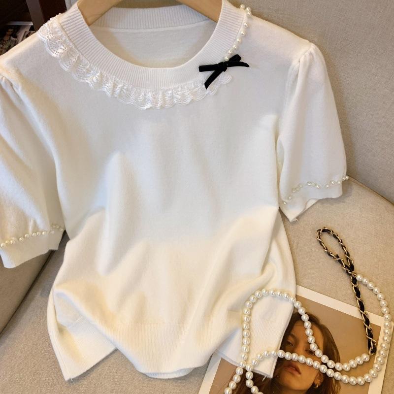 Compra Suéter de manga corta con lazo de encaje para mujer, verano 2025, top de alta gama con costuras de cuentas en los hombros al por mayor en Joom.pro