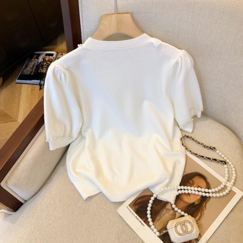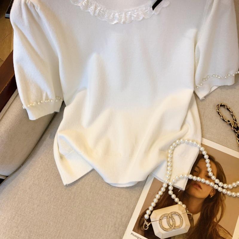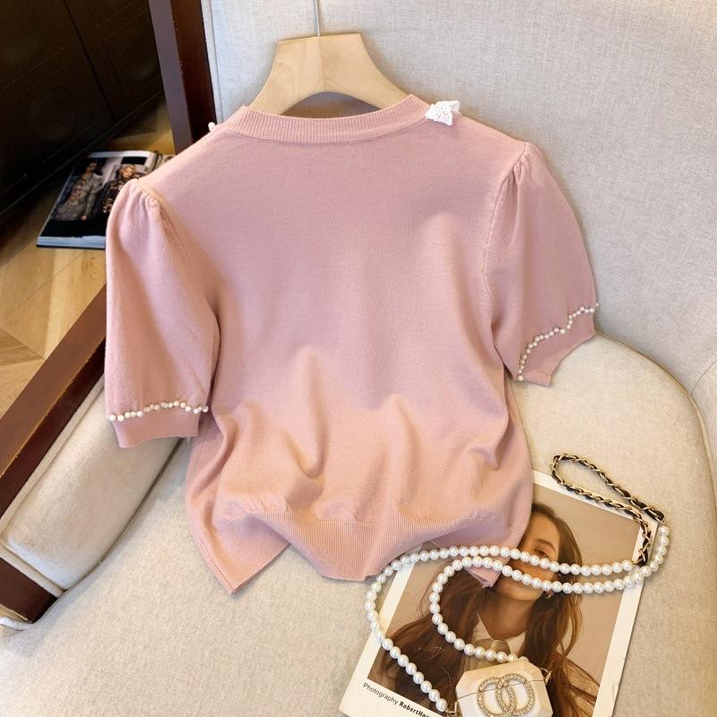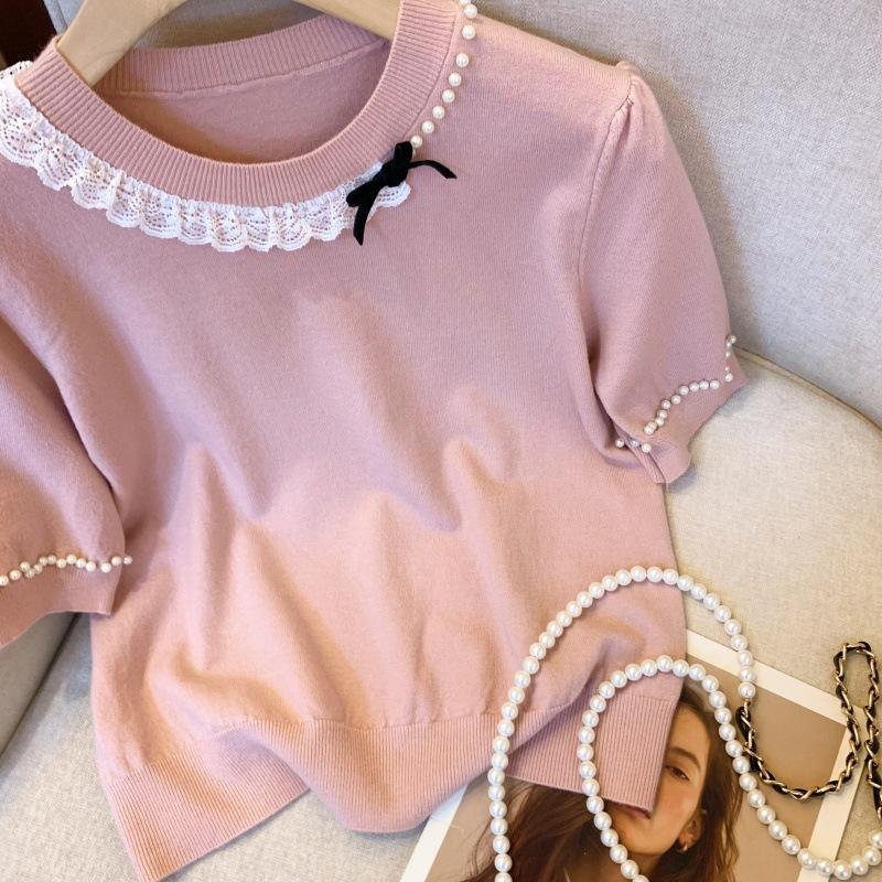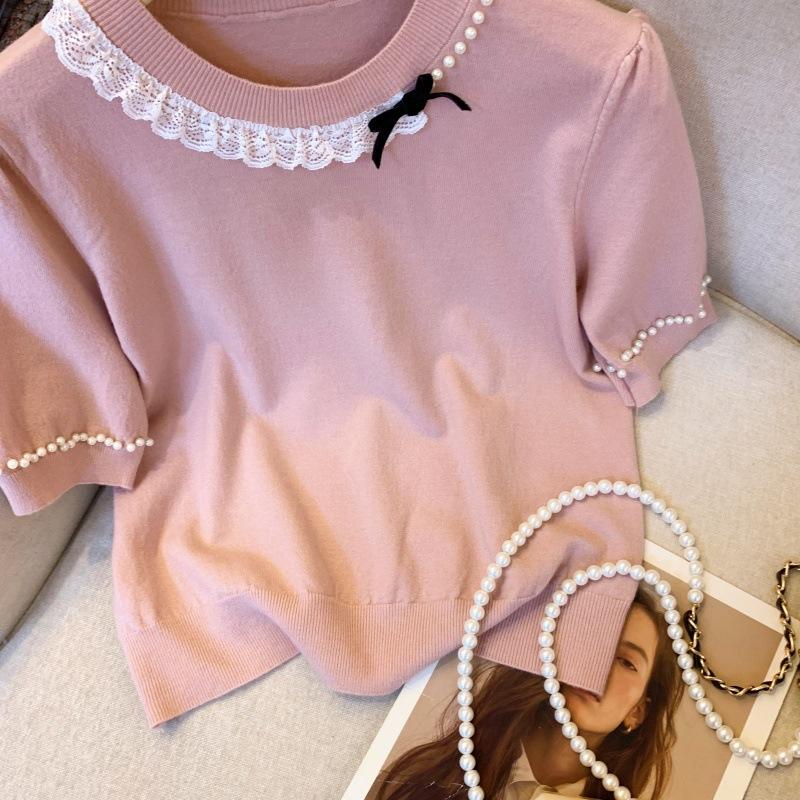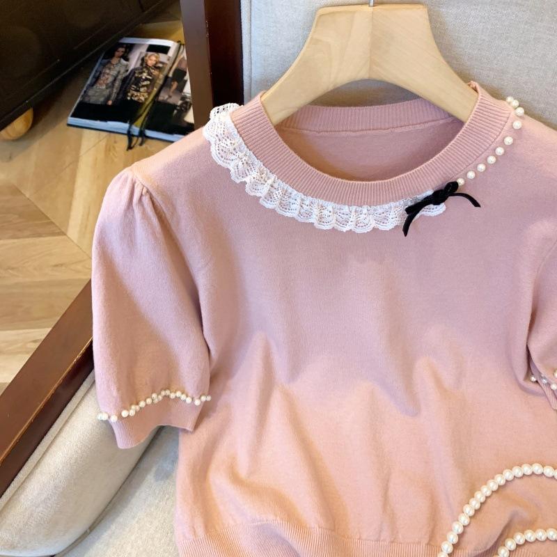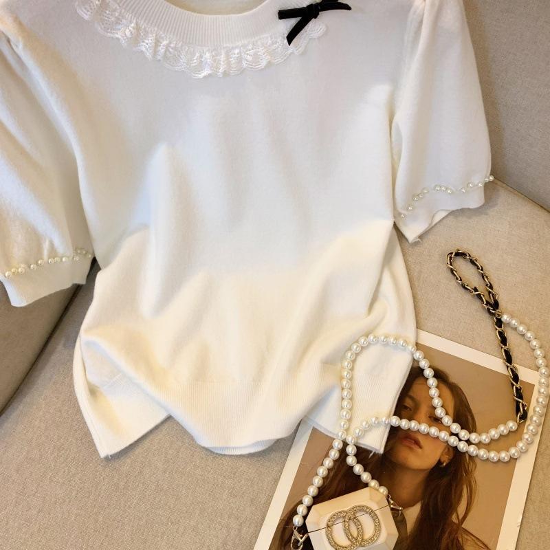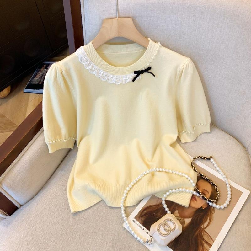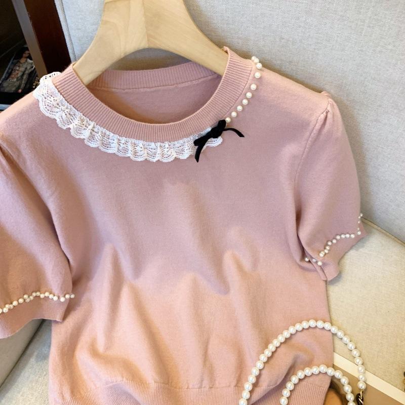 Compra Suéter de manga corta con lazo de encaje para mujer, verano 2025, top de alta gama con costuras de cuentas en los hombros al por mayor en Joom.pro