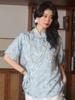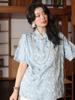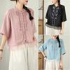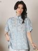25 Verano Nuevo Top Jacquard Rayón Azul Manga Corta Suelto Adelgazante Estilo Nacional Camisa de Moda Camiseta de Mujer