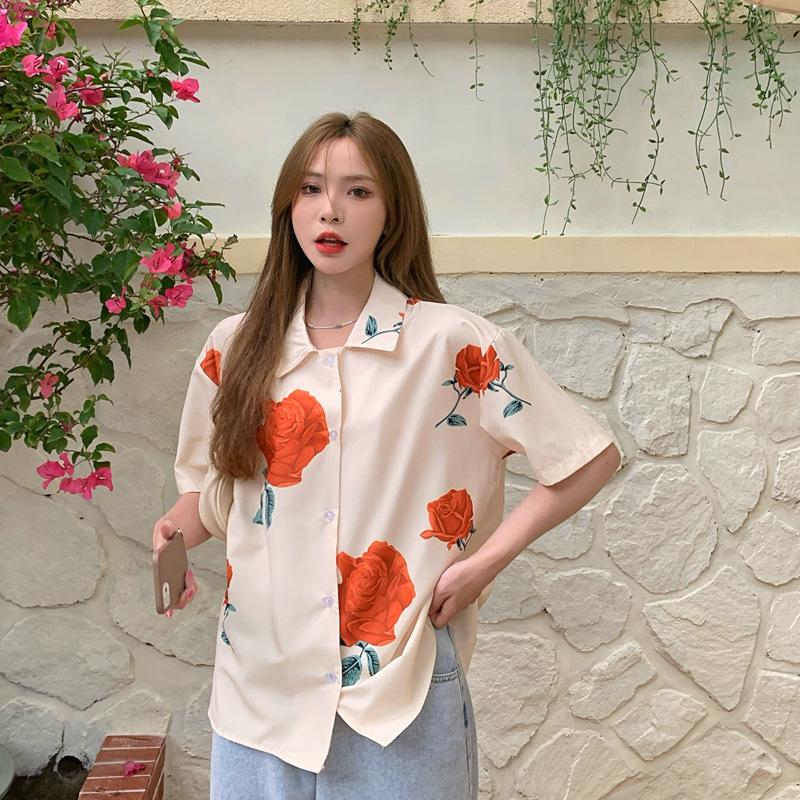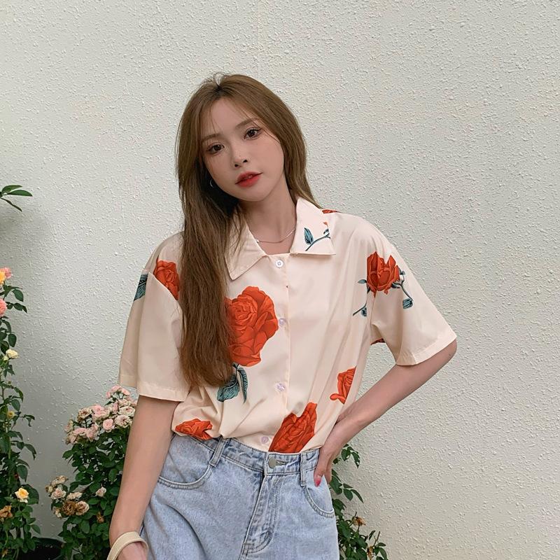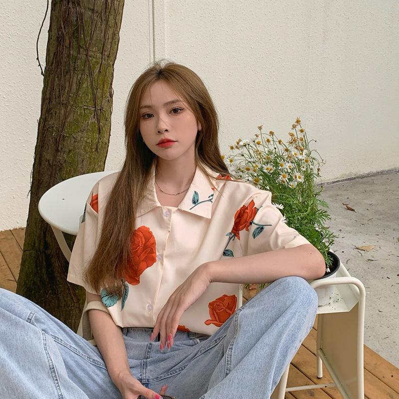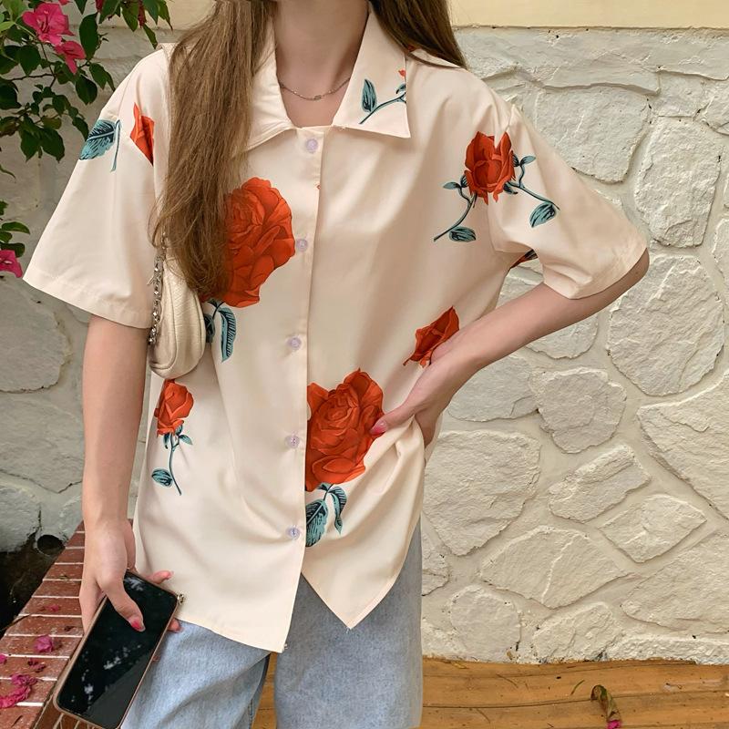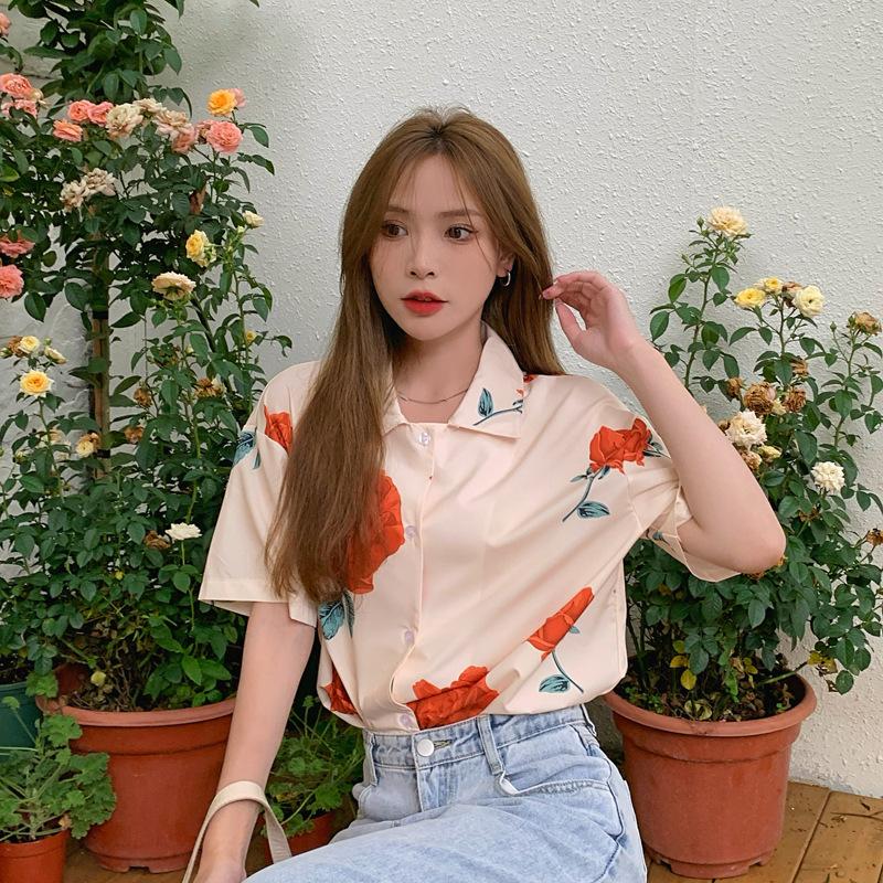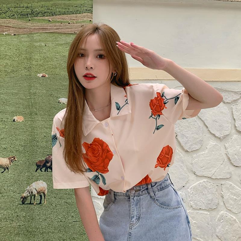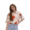 Camisa de manga corta con estampado floral vintage para mujer, diseño de nicho, estilo coreano, holgada, adelgazante, combinable, informal, moderna.