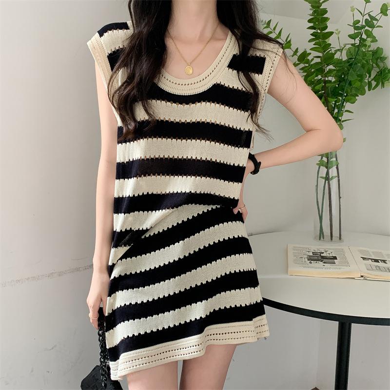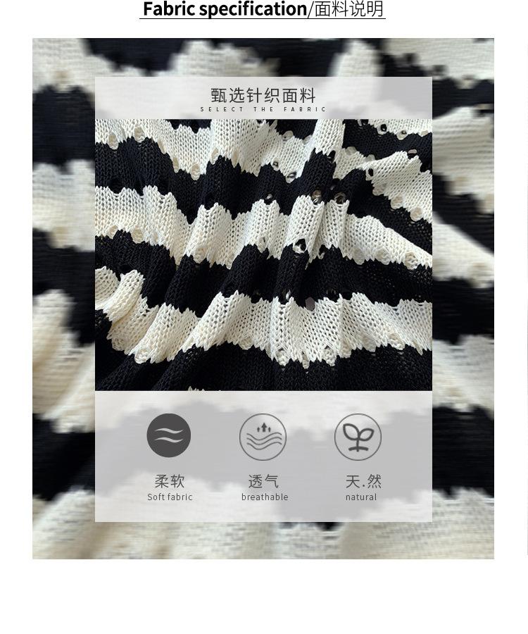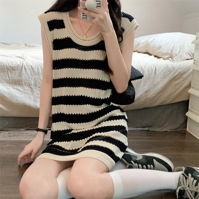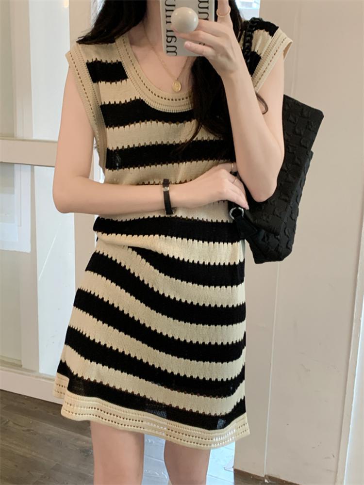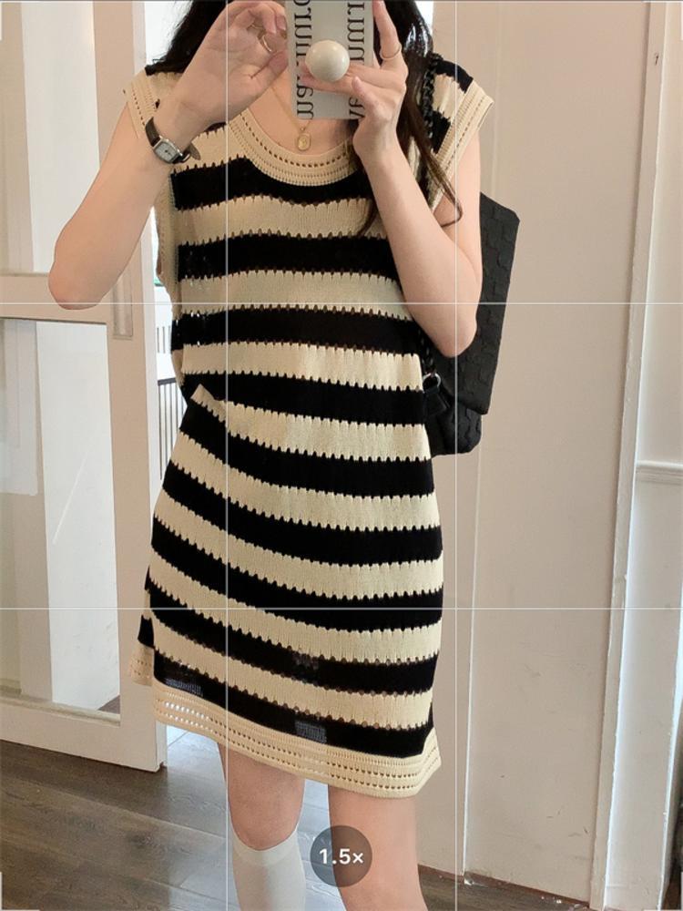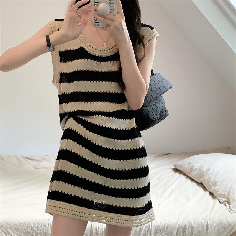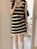 Vestido de Diseño Nicho con Recortes y Rayas de Manga Corta para Mujer 2025 Verano Chic Francés Look Adelgazante Falda de Alta Gama
