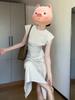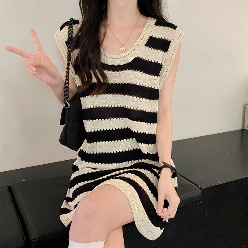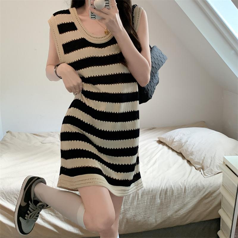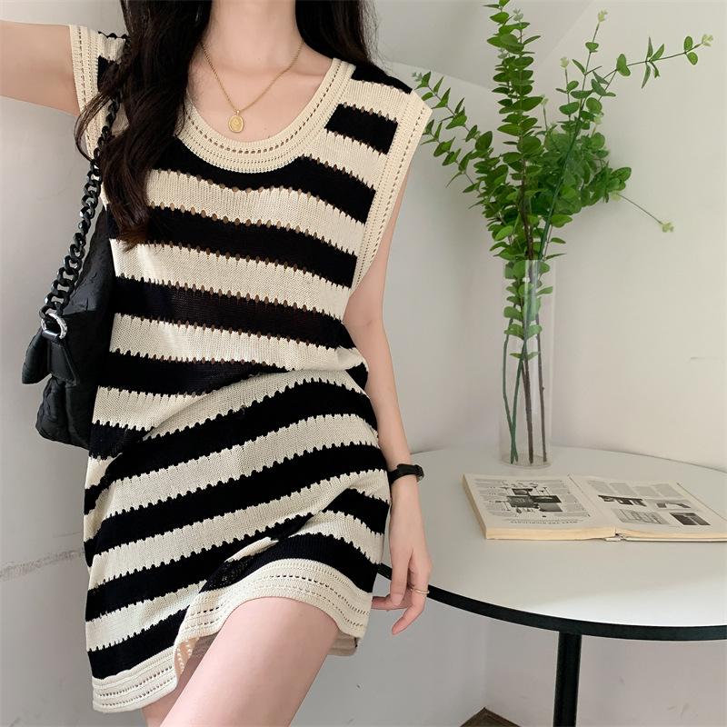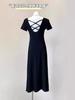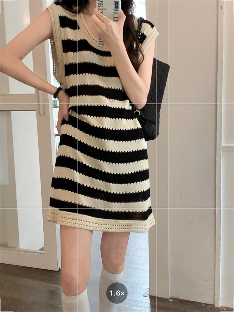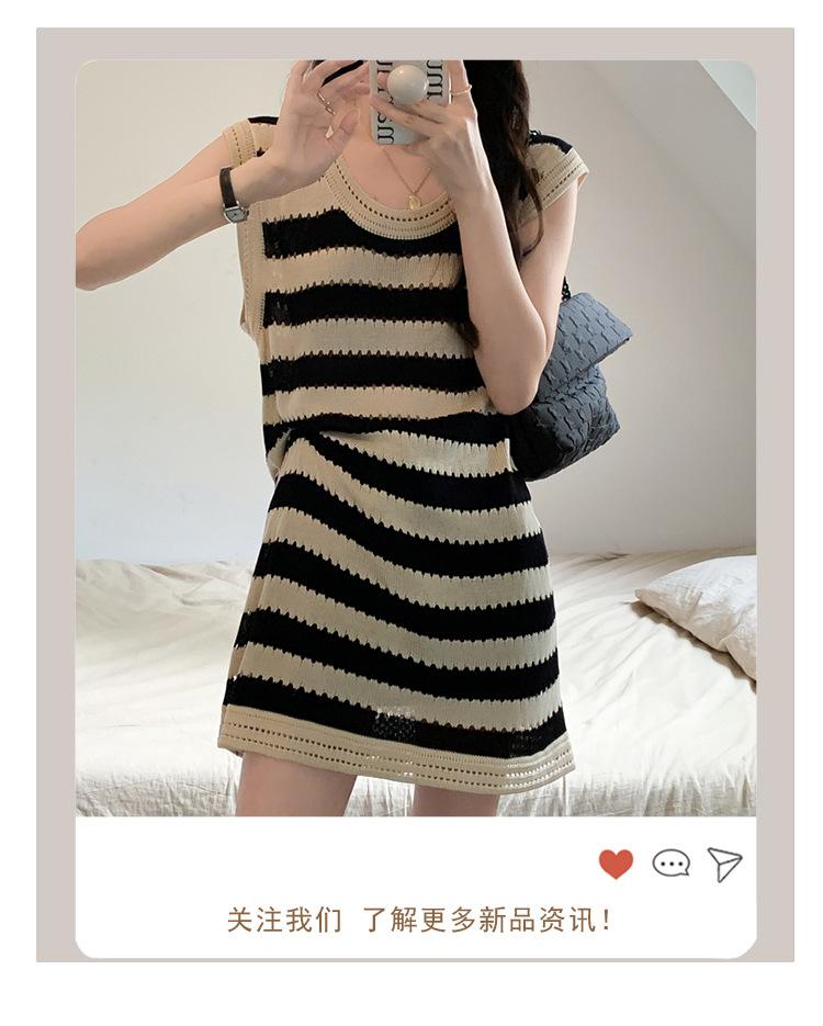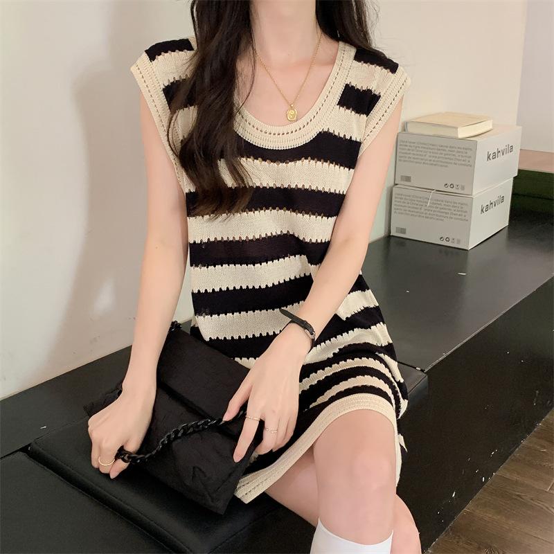 Vestido de Diseño Nicho con Recortes y Rayas de Manga Corta para Mujer 2025 Verano Chic Francés Look Adelgazante Falda de Alta Gama