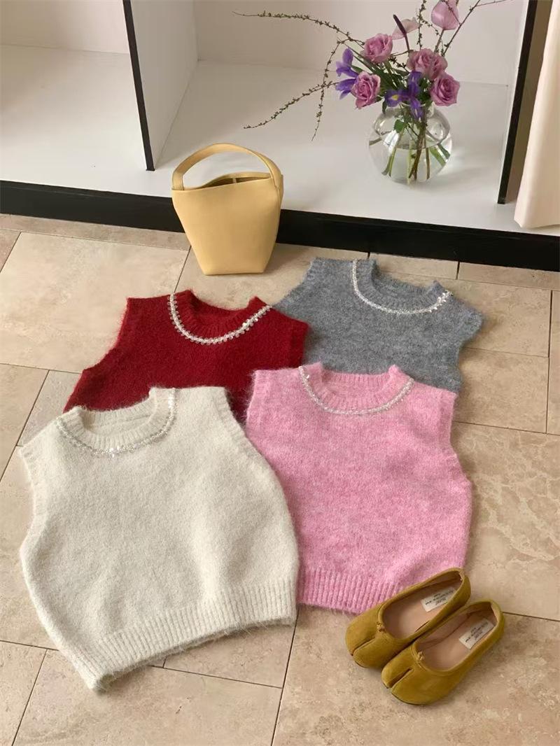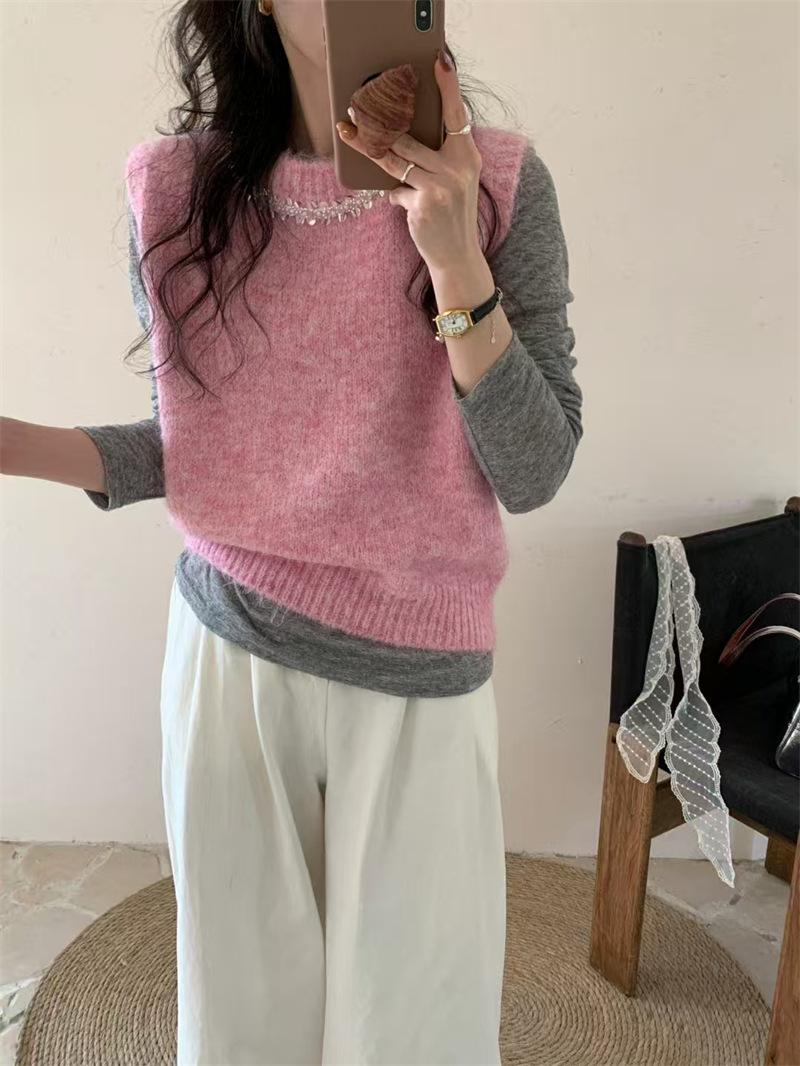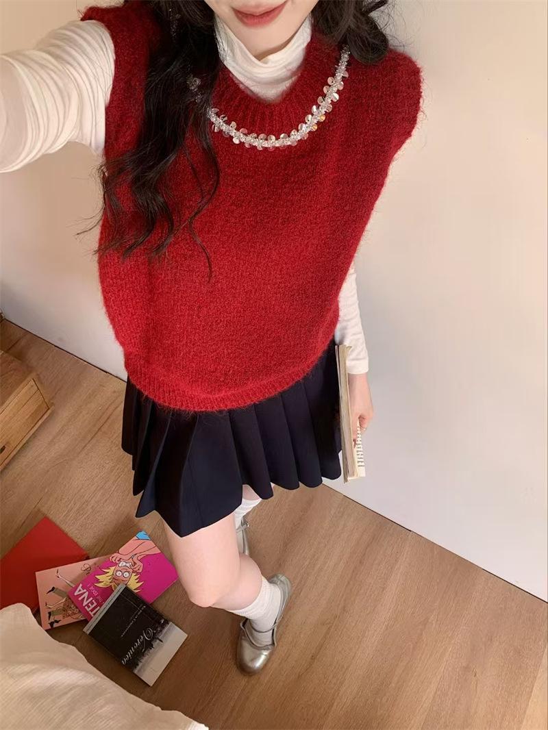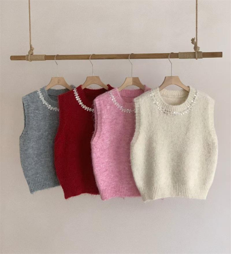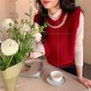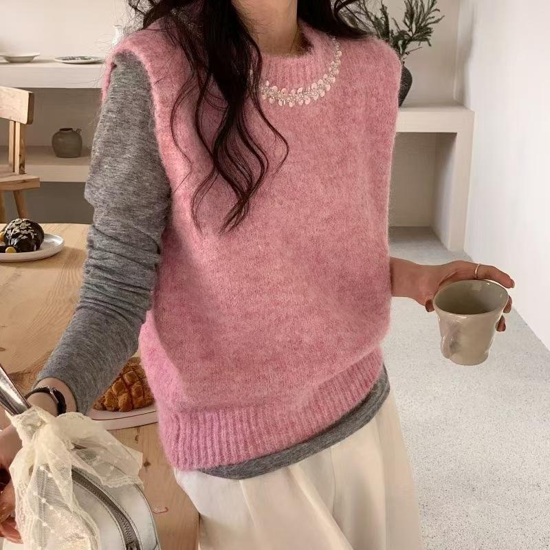 Primavera 2025 Nuevo Chaleco de Punto de Industria Pesada para Mujer Cuello Redondo Apilado Suave Ceroso Estilo Lazy Pequeño Dulce Top sin Mangas