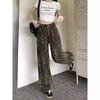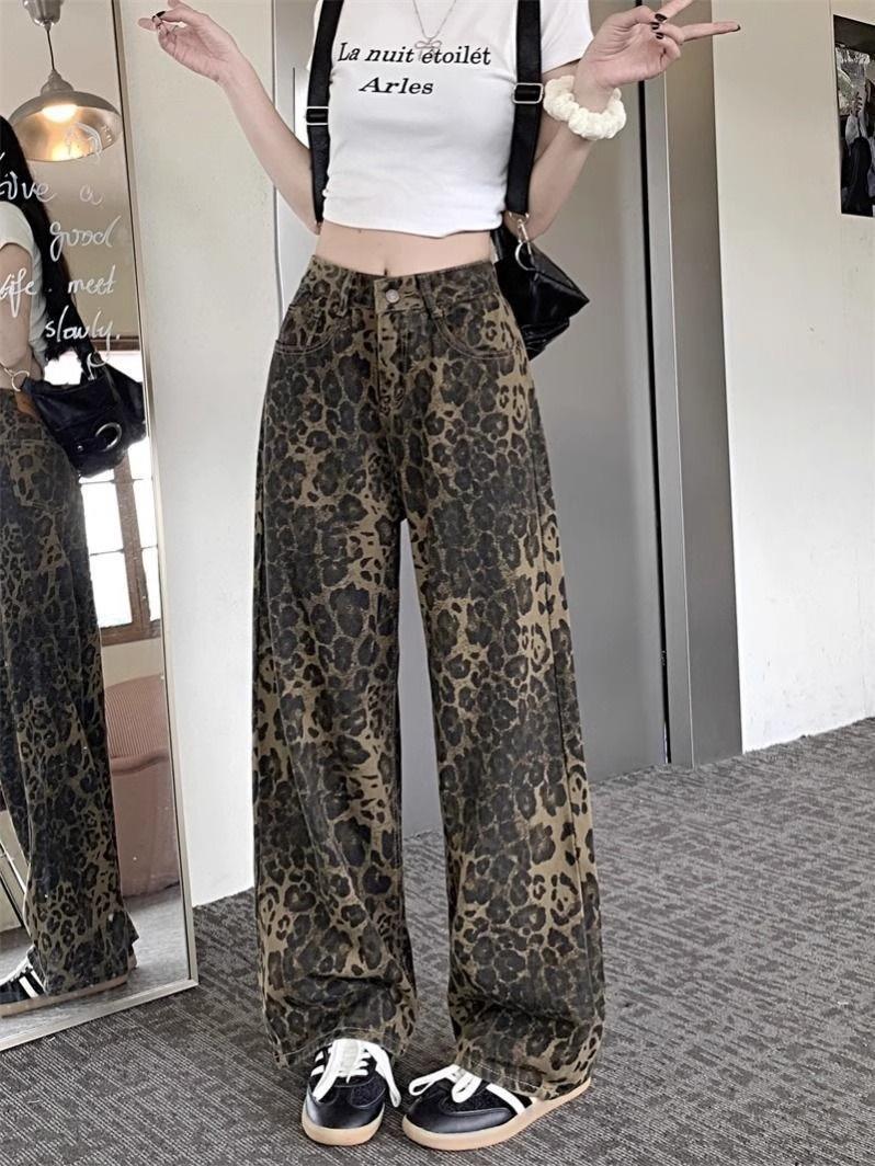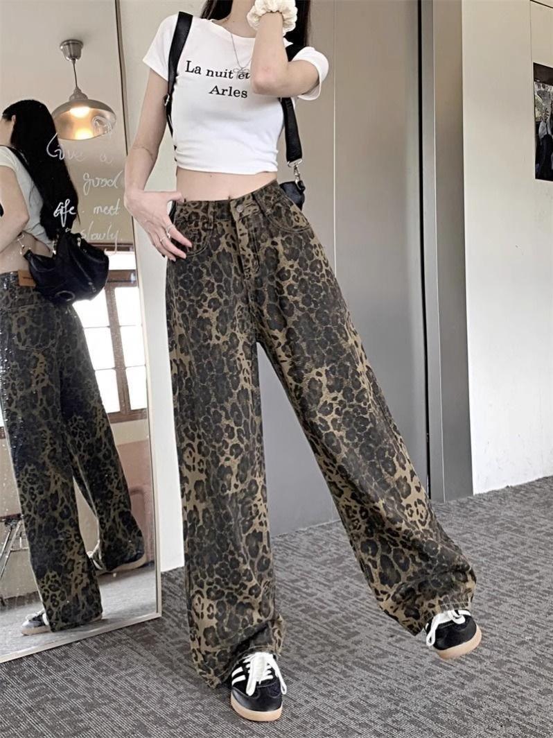 Pantalones vaqueros con estampado de leopardo y diseño retro americano para mujer, pantalones casuales de cintura alta y pierna ancha, pantalones rectos holgados y adelgazantes de calle.