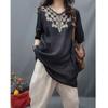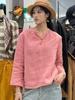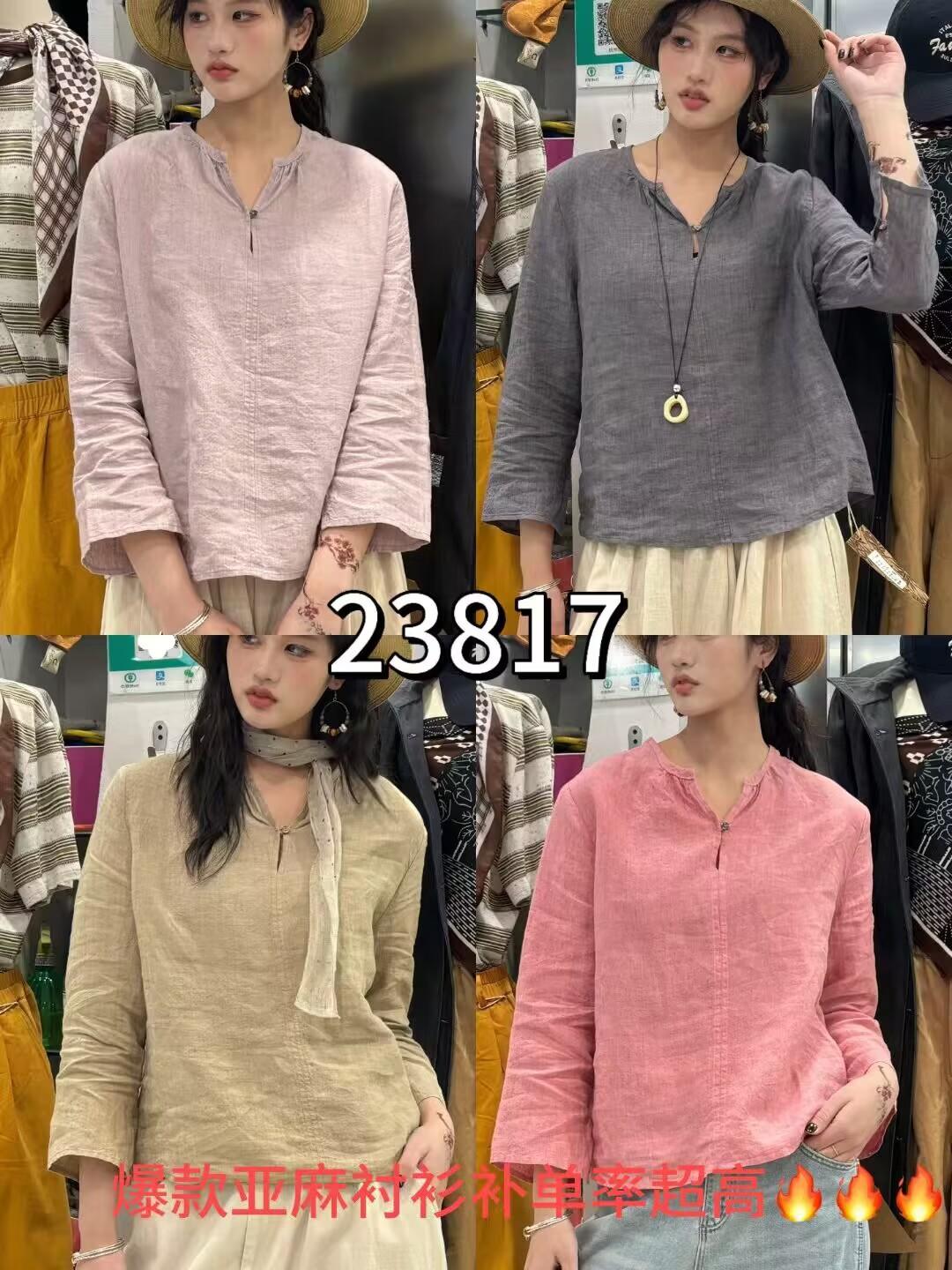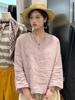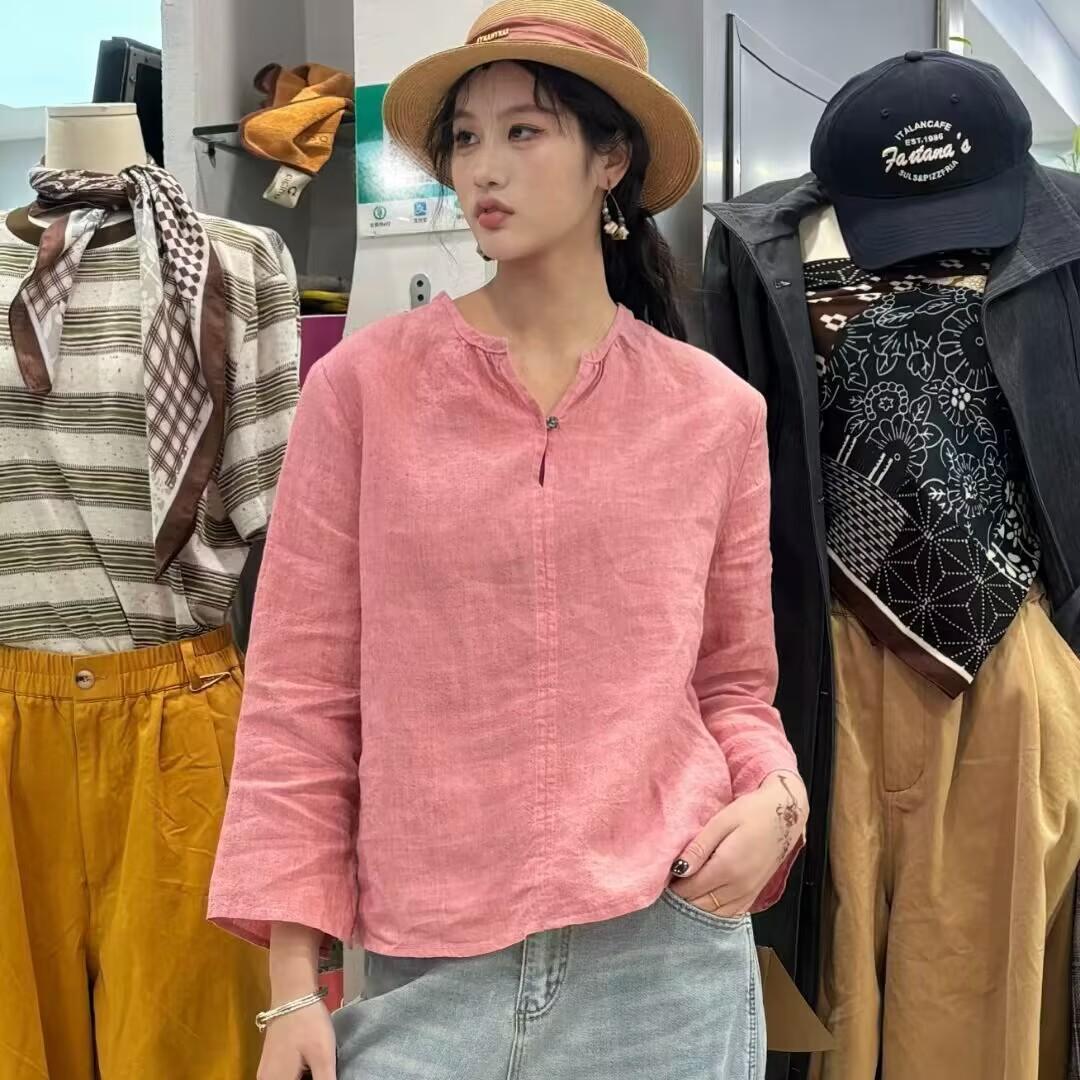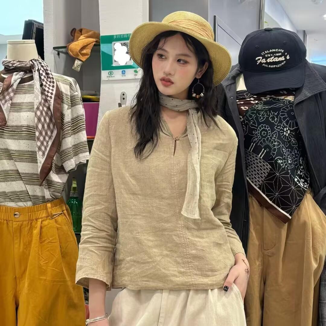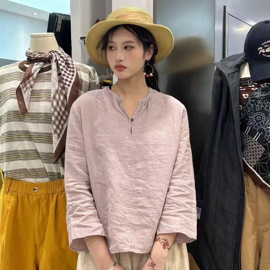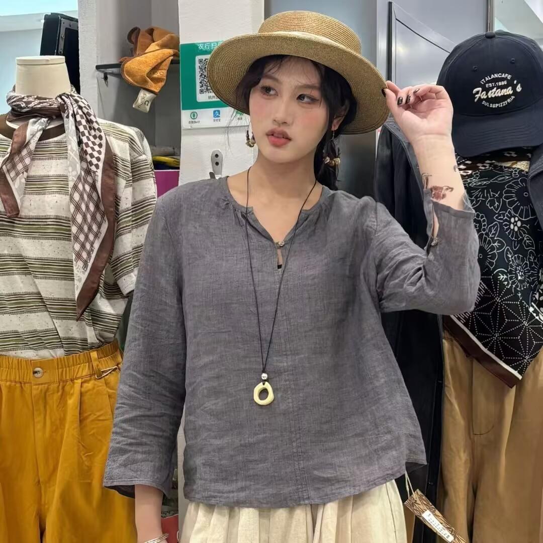 Camisa de lino para mujer, primavera/verano 2025, estilo artístico, retro, holgada, adelgazante, combinable, con cuello en V, camiseta de alta gama 23817