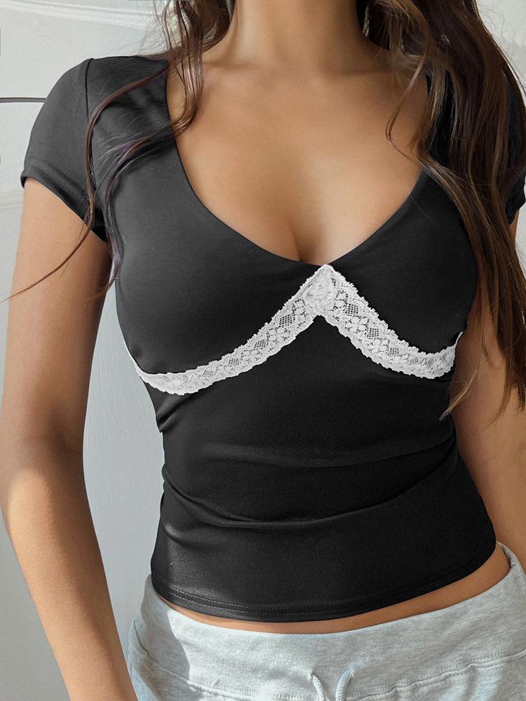 Diyun 2025 Primavera y Verano Europeo y Americano Amazon Y2K Tops de Manga Corta para Mujer Sexy Ajustado Tejido Contraste Blanco y Negro