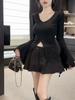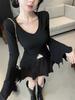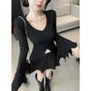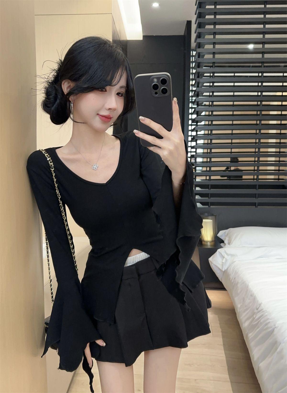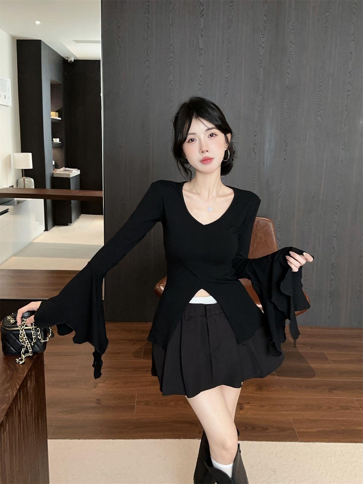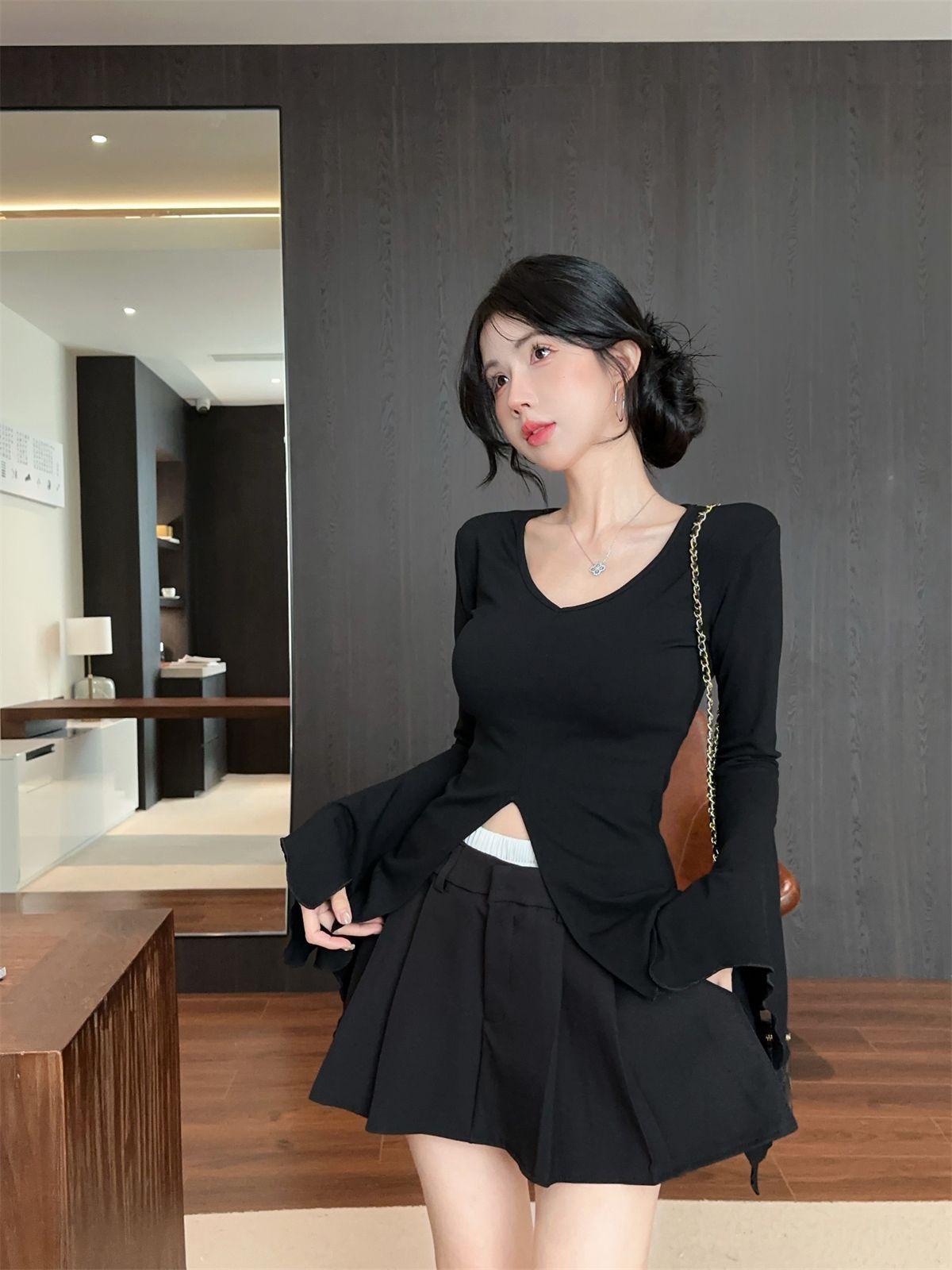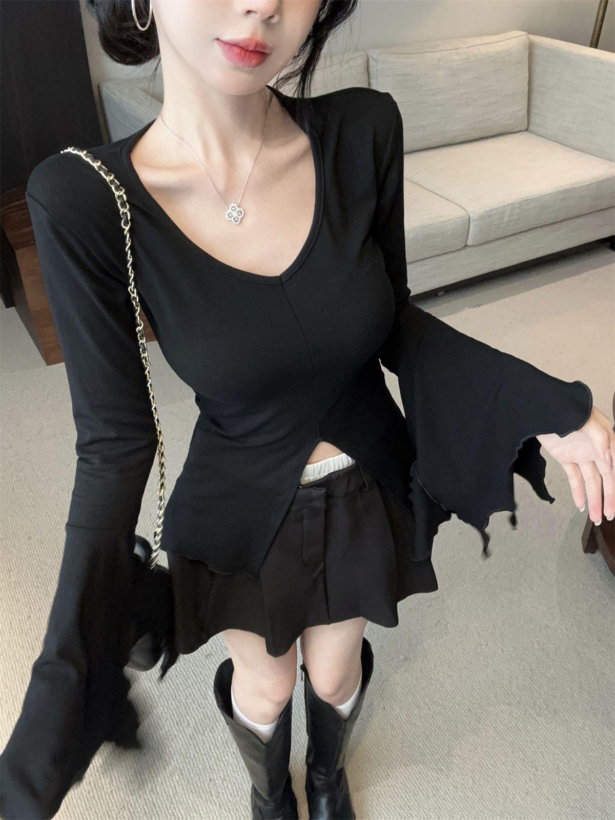 Camiseta de otoño ajustada con diseño adelgazante, estilo americano, con escote en V y mangas abullonadas para chicas atractivas, top de moda de manga larga con abertura para mujer