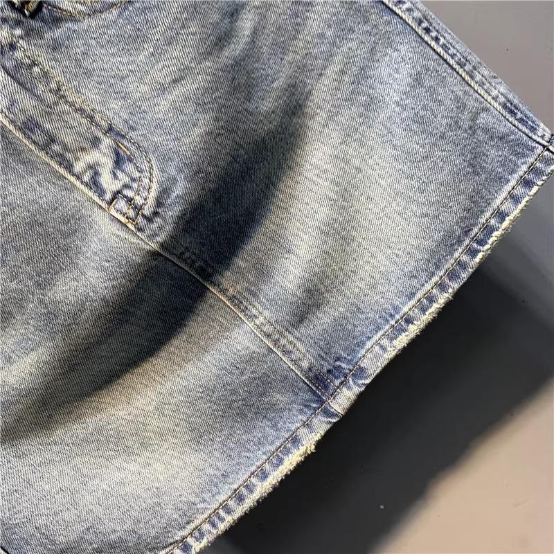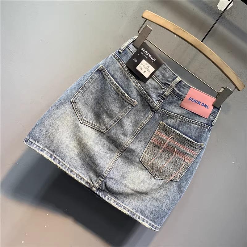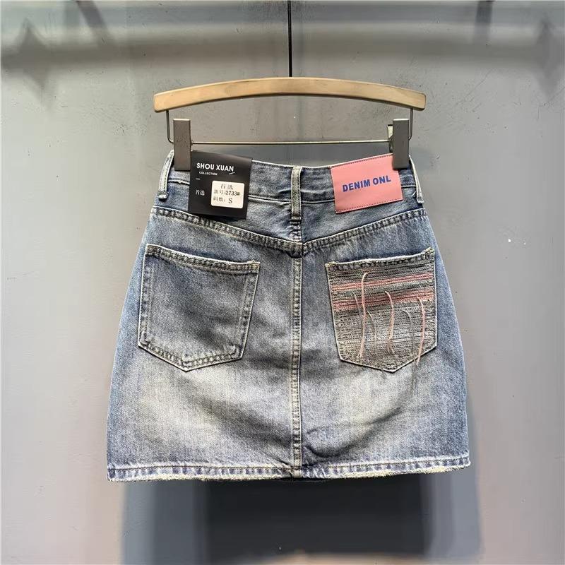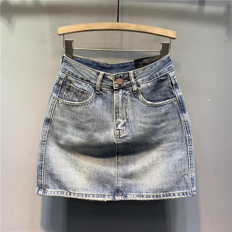 Compra Falda Corta de Mezclilla Lavada con Bolsillo de Borlas Vintage 2025 Nuevo Diseño Cintura Alta Adelgazante Bodycon Línea A al por mayor en Joom.pro
