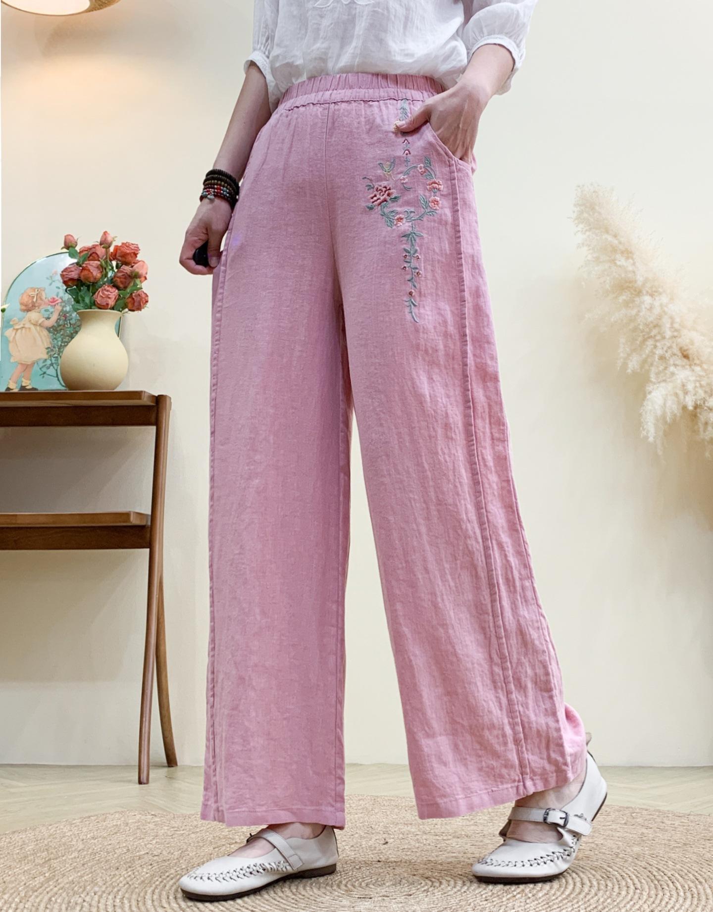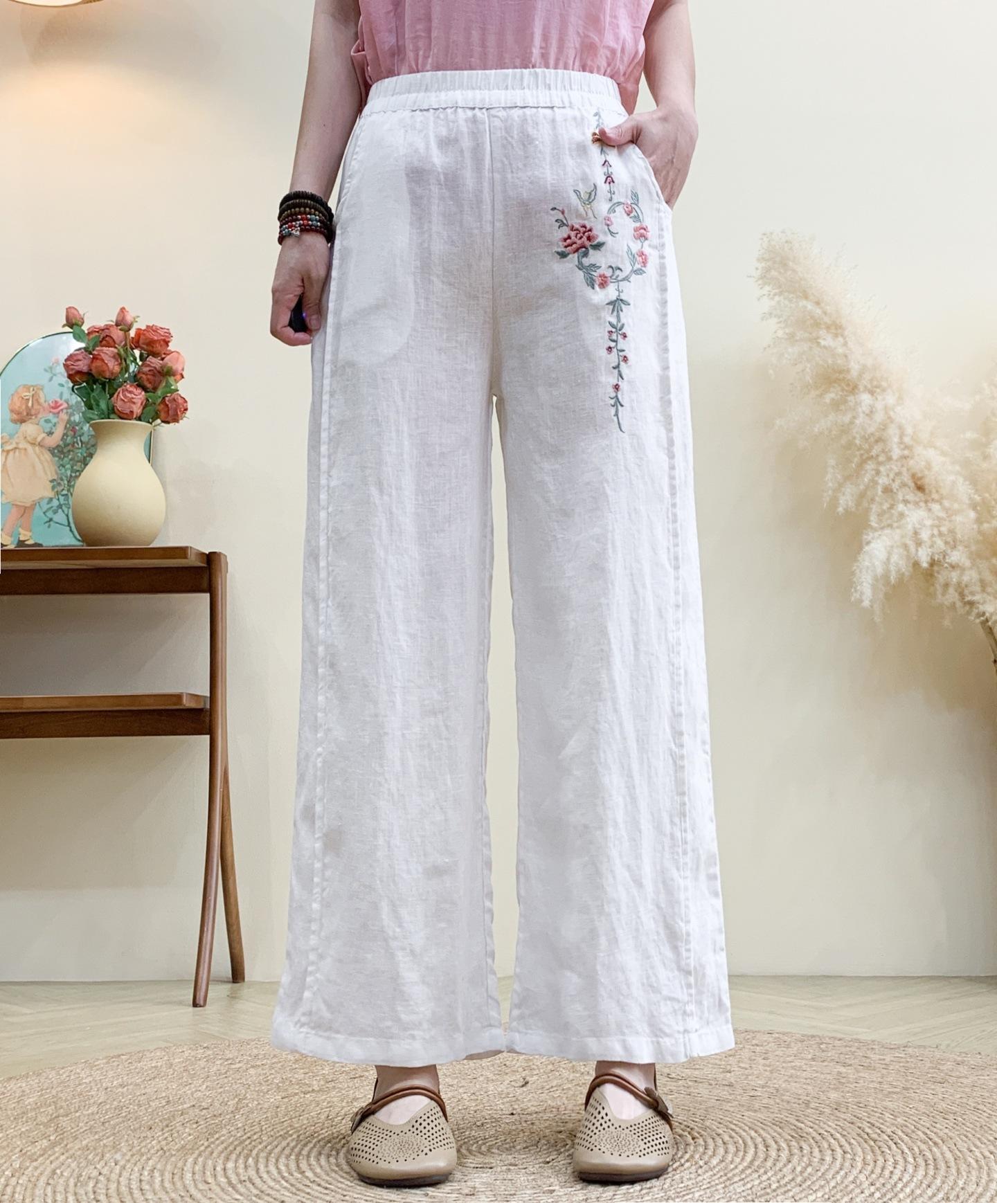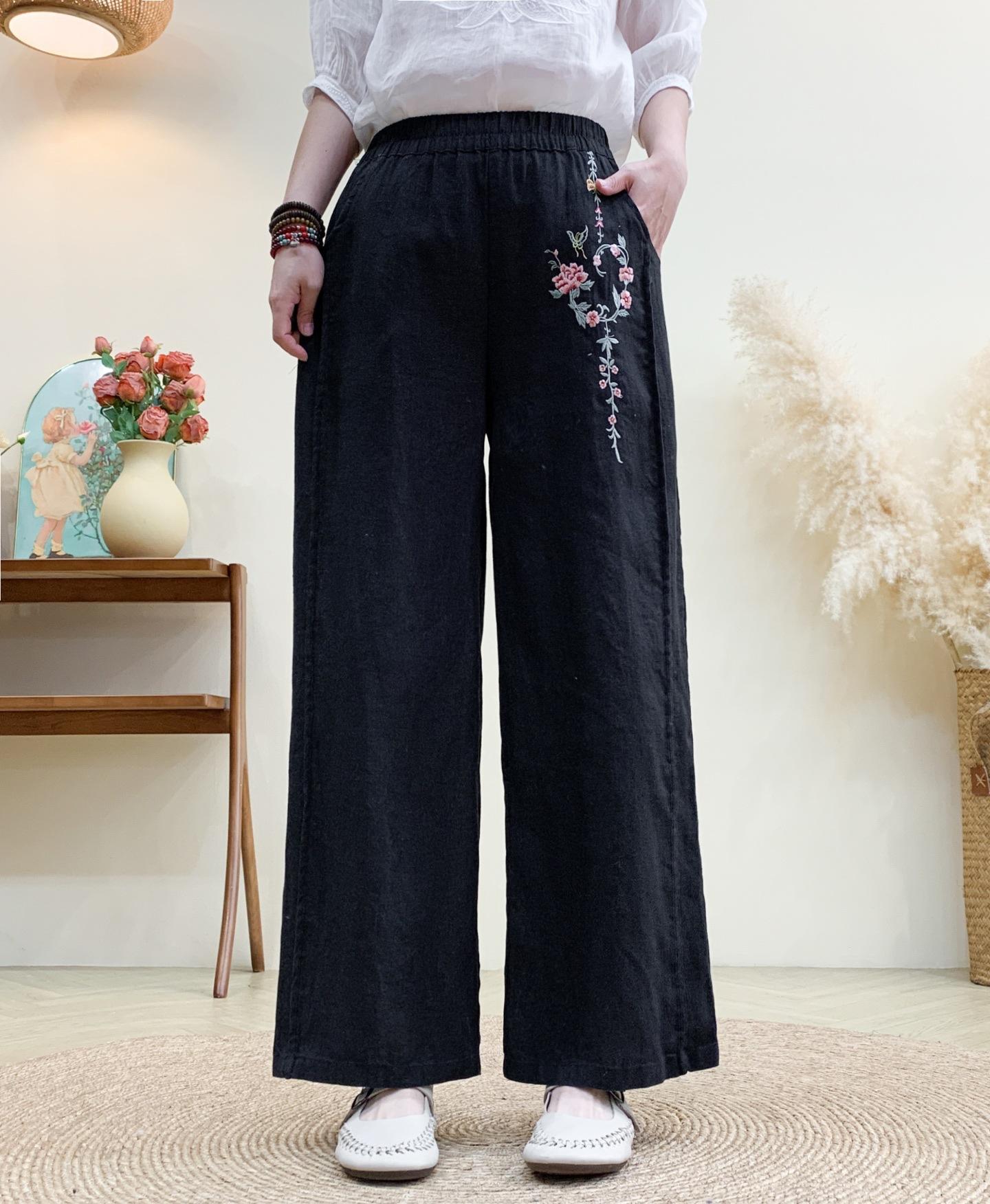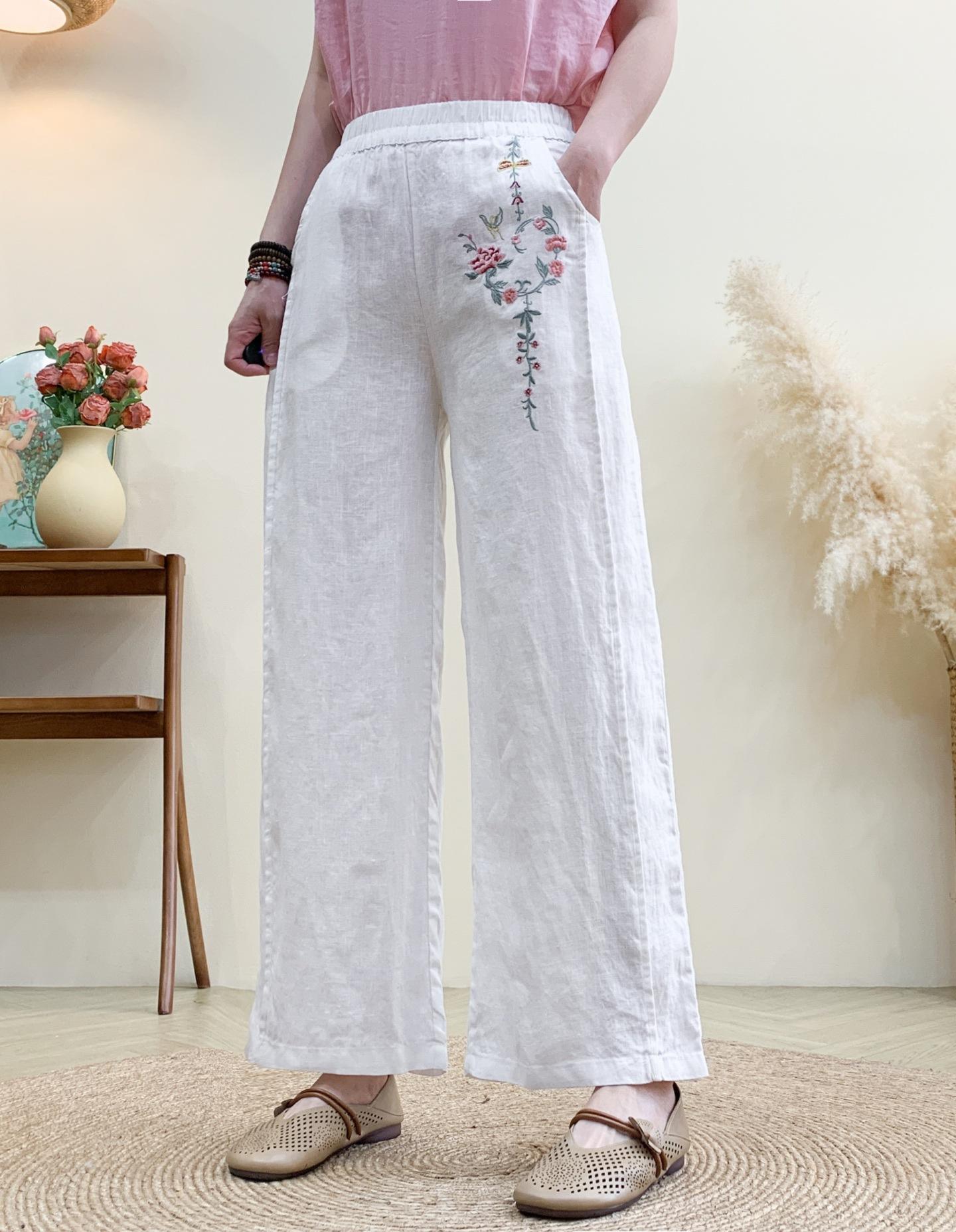 Pantalones casuales de lino puro para mujer, primavera y verano, nuevos pantalones holgados, adelgazantes, de pierna ancha y recta, con bordado retro artístico, 6835