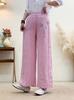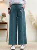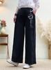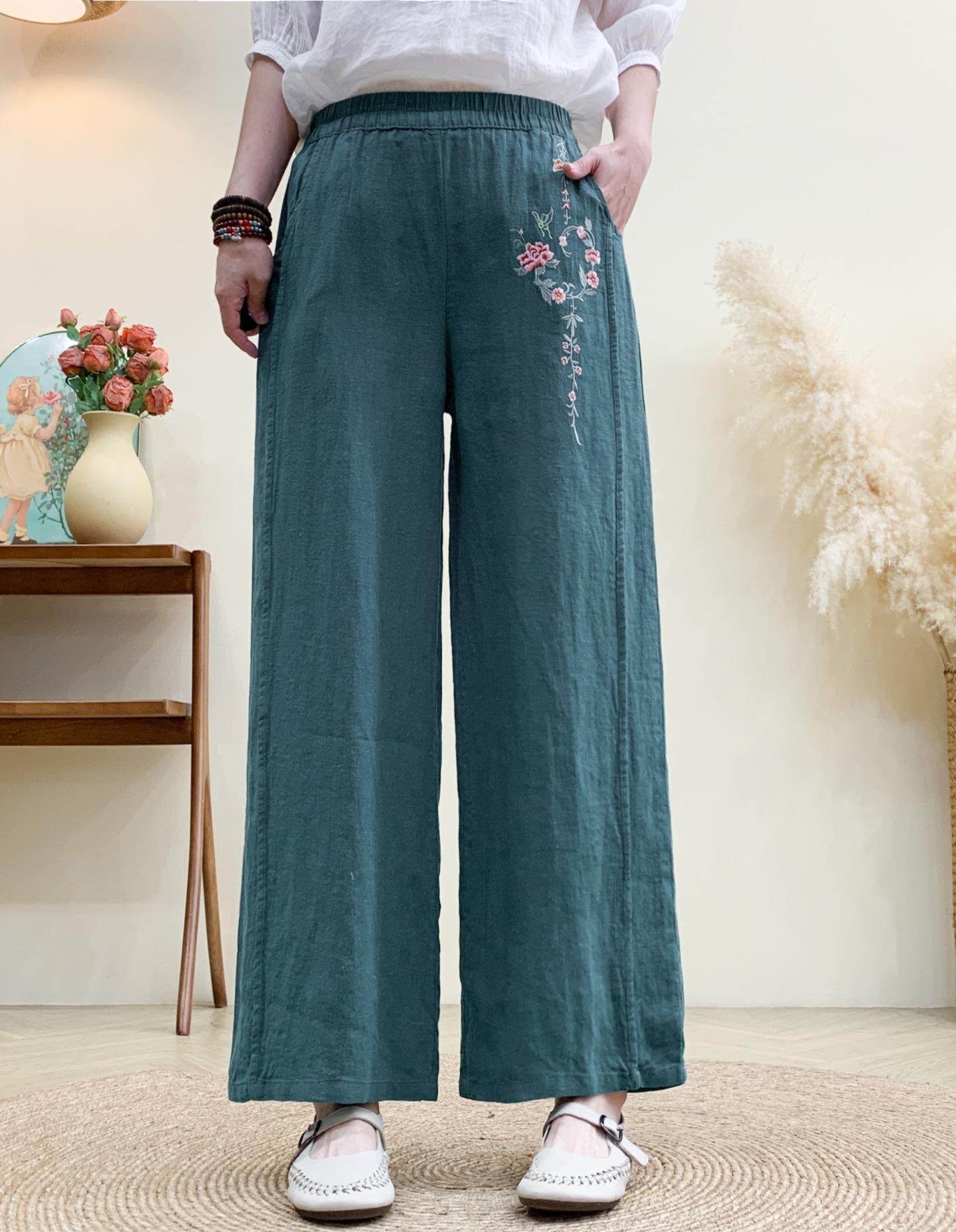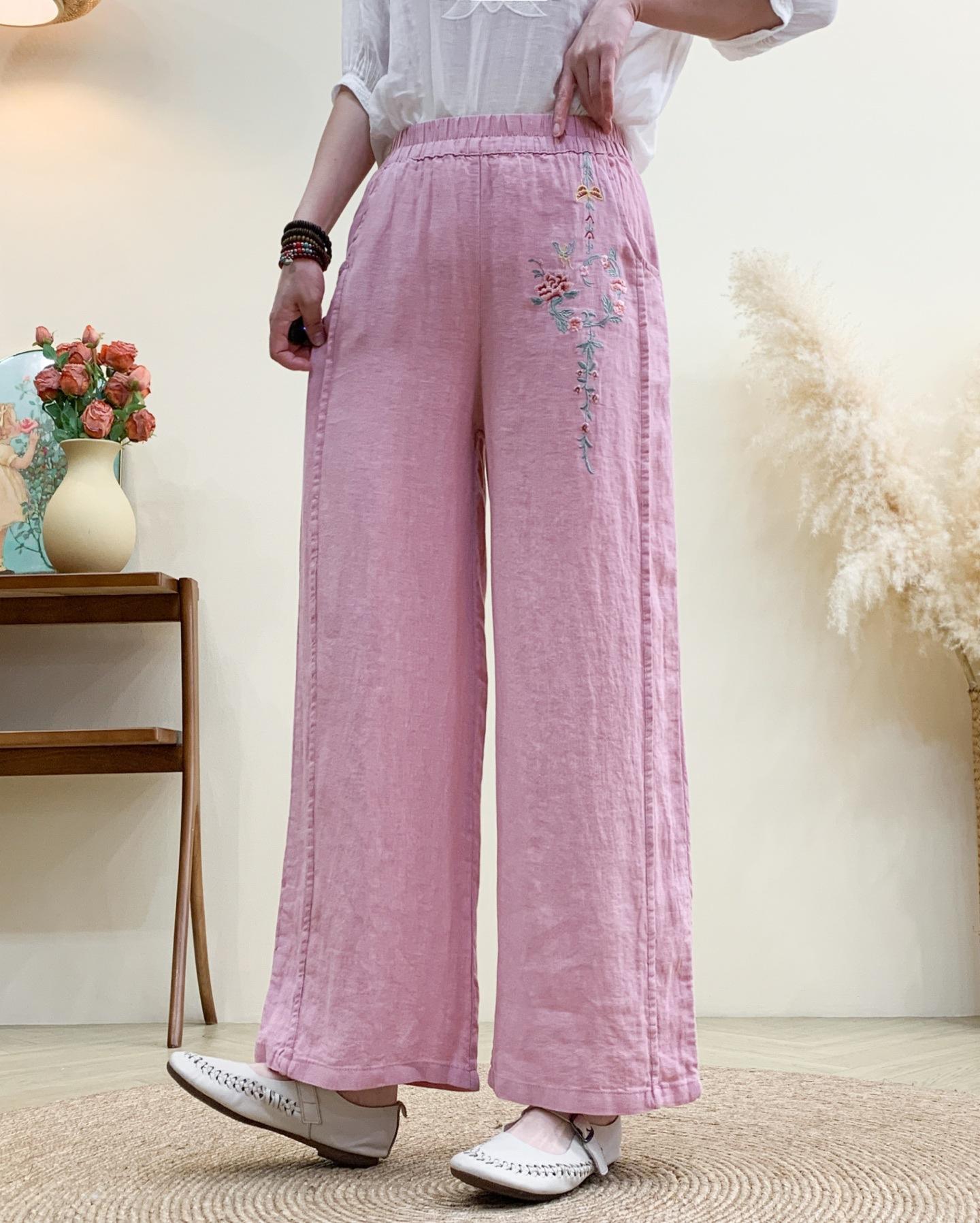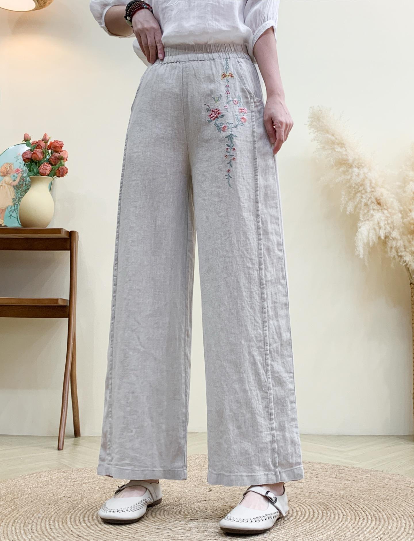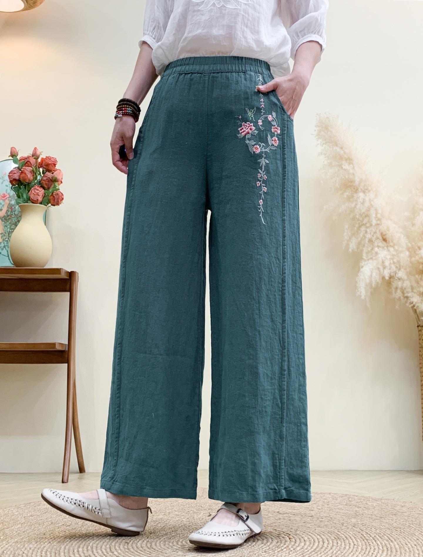 Pantalones casuales de lino puro para mujer, primavera y verano, nuevos pantalones holgados, adelgazantes, de pierna ancha y recta, con bordado retro artístico, 6835