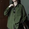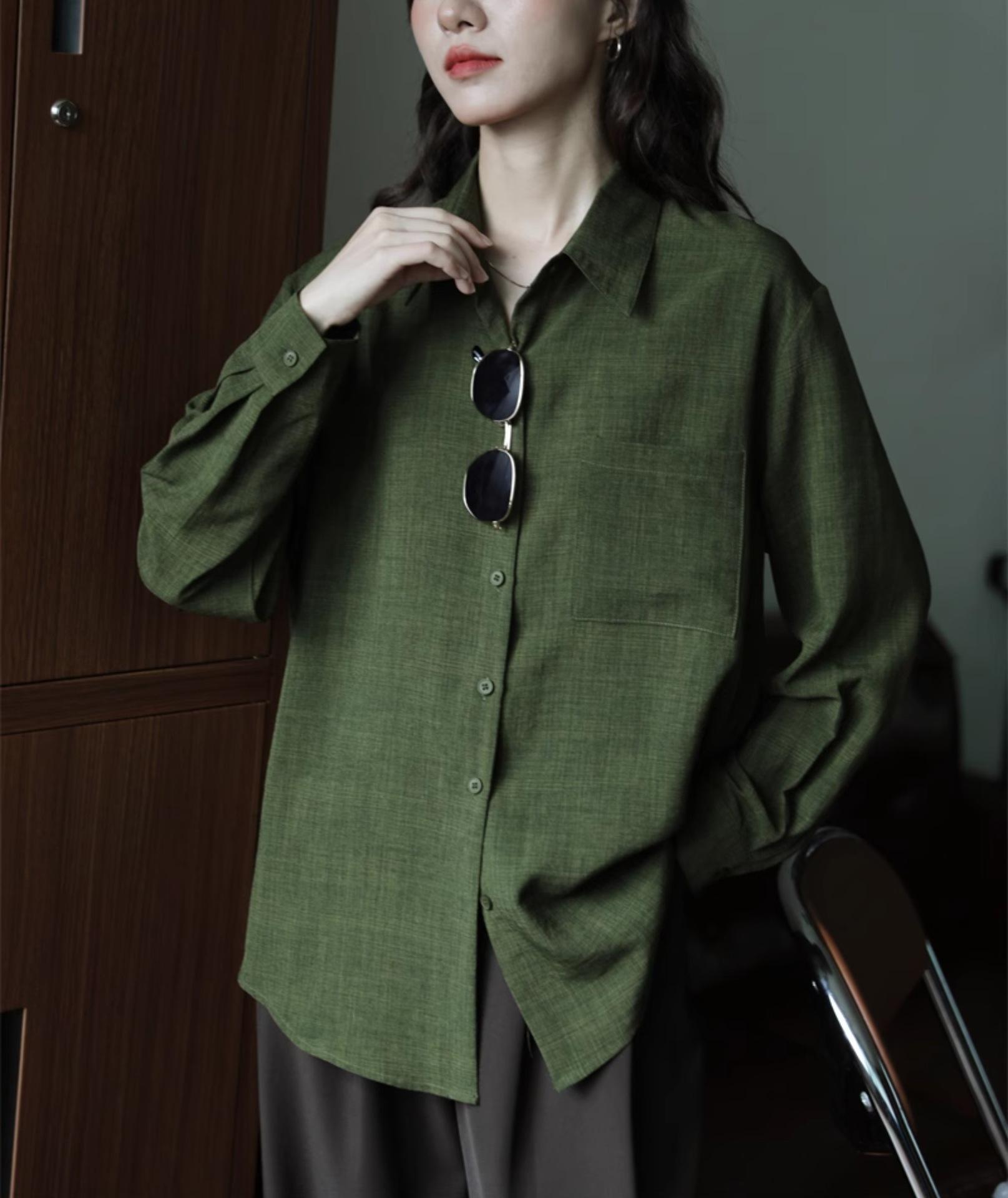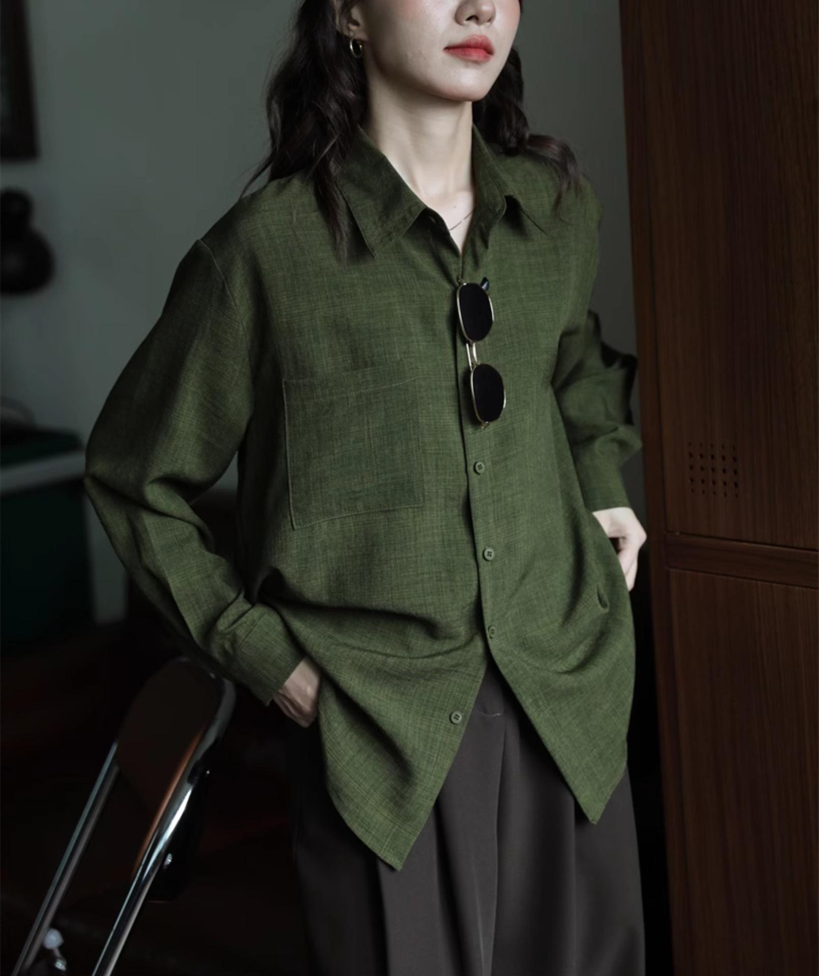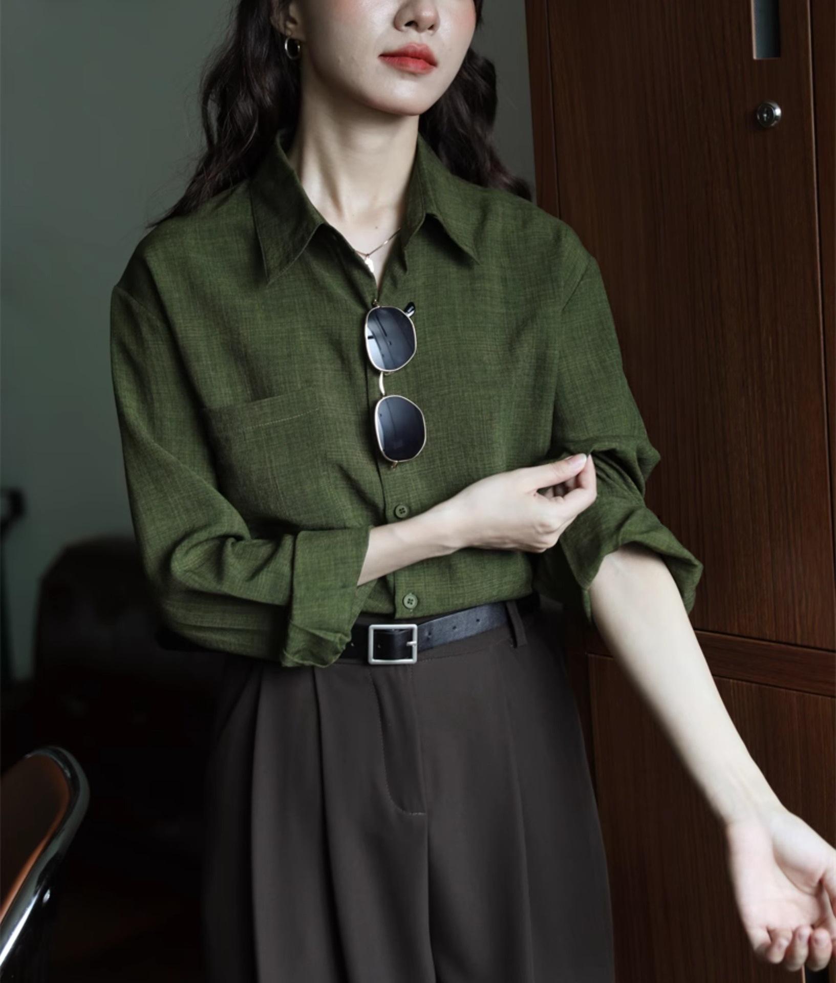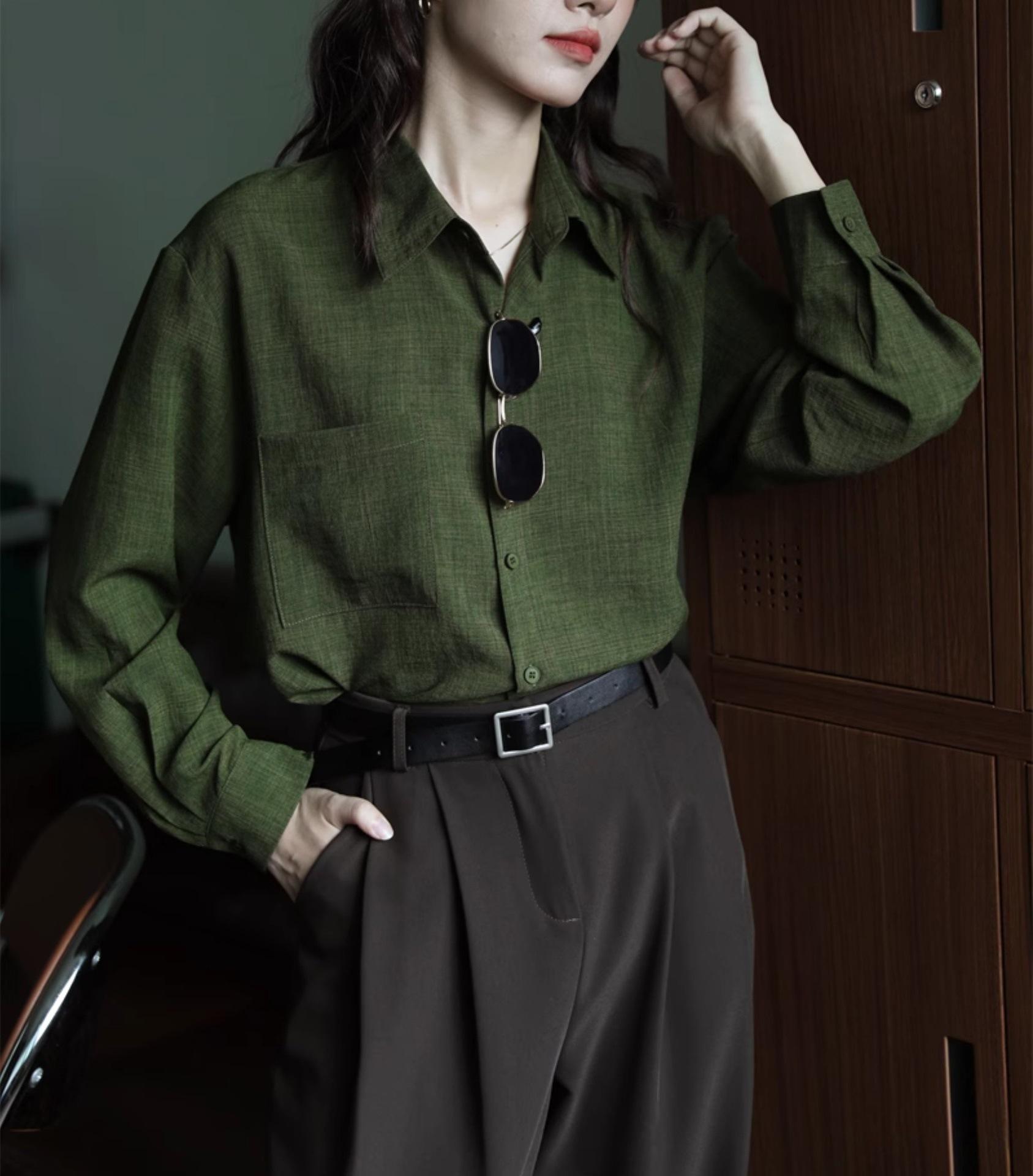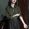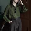 Camisa de Manga Larga Holgada Estilo Retro Hong Kong con Sentido de Diseño Verde para Mujer Primavera y Otoño Nueva Camisa Top