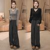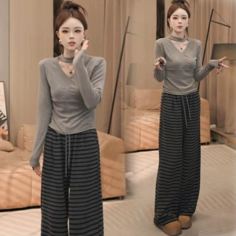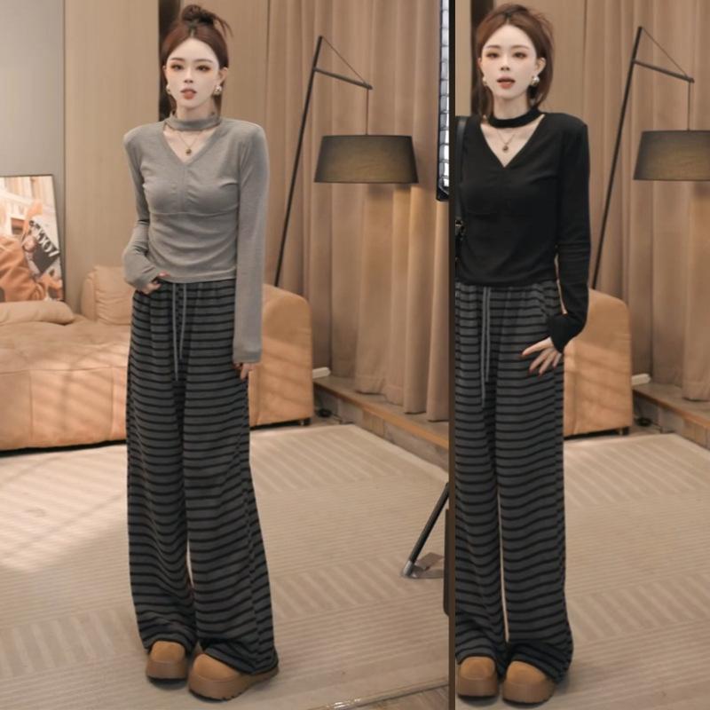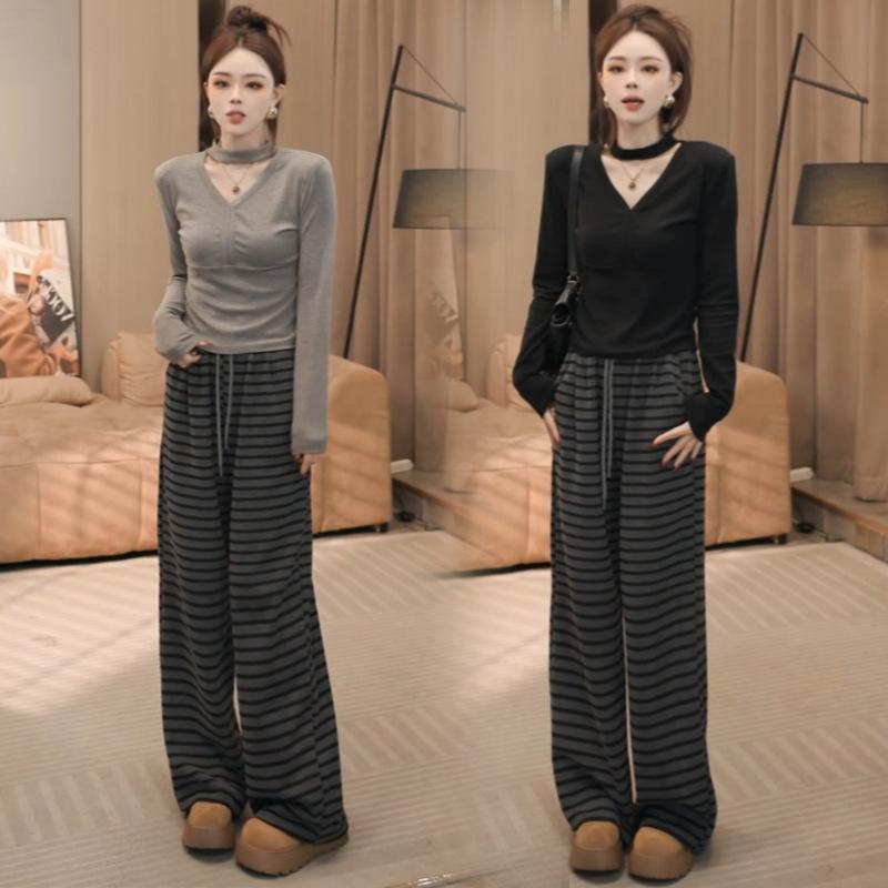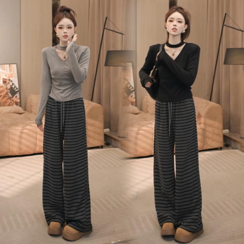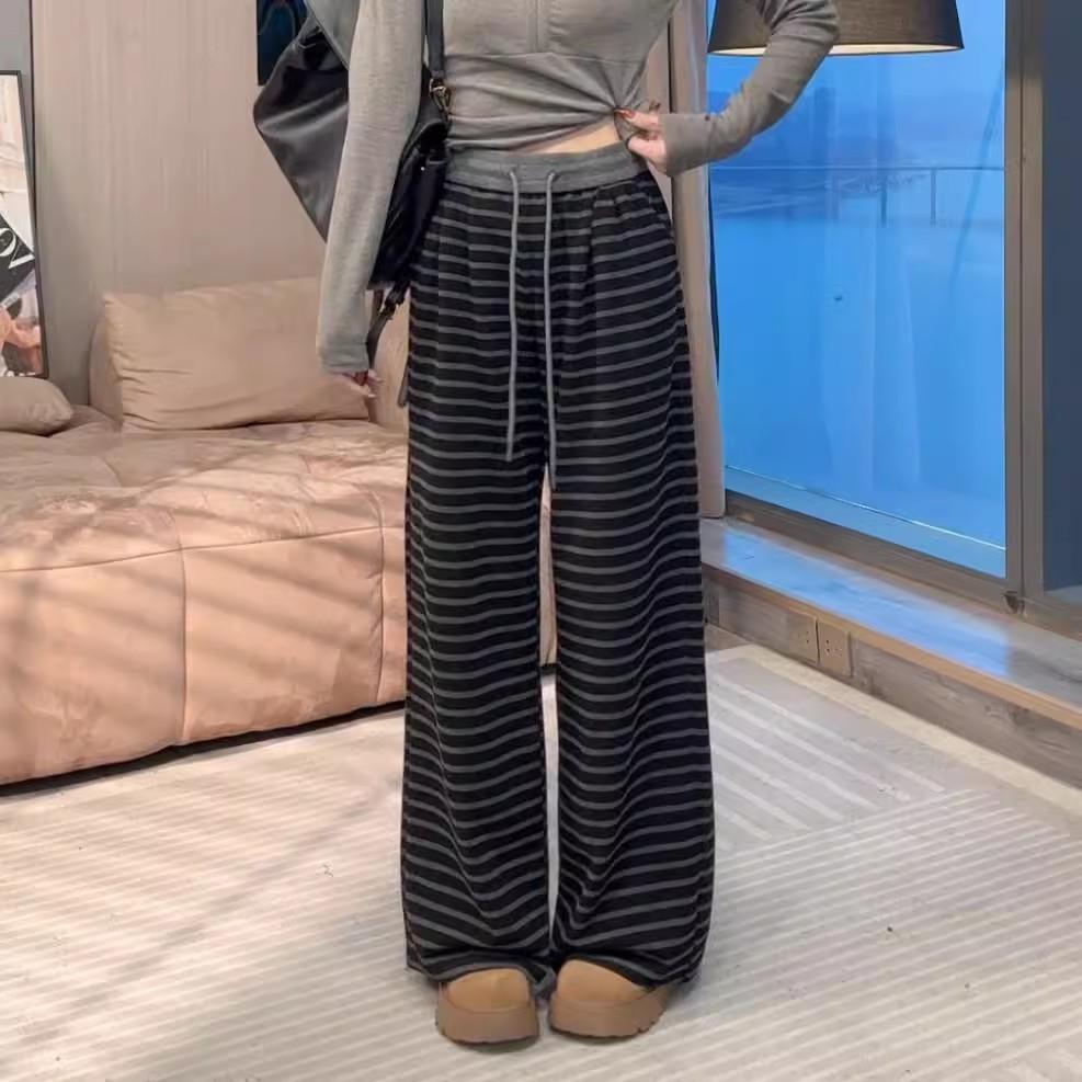 Pantalones Casuales Versátiles Adelgazantes de Rayas Holgados Estilo Coreano para Mujer Primavera 2025 Nuevos Cintura Elástica Cordón Largo hasta el Piso