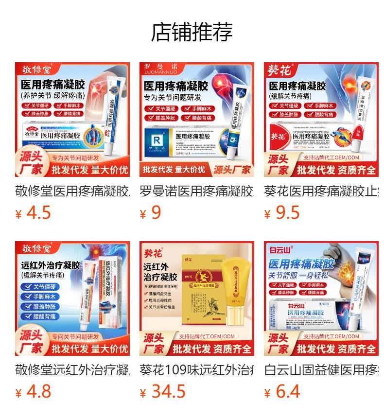 Jingxiu tang pain gel-blue box, Jingxiu tang pain gel-green box, Romano pain gel, Sunflower pain gel, Baiyunshan pain gel