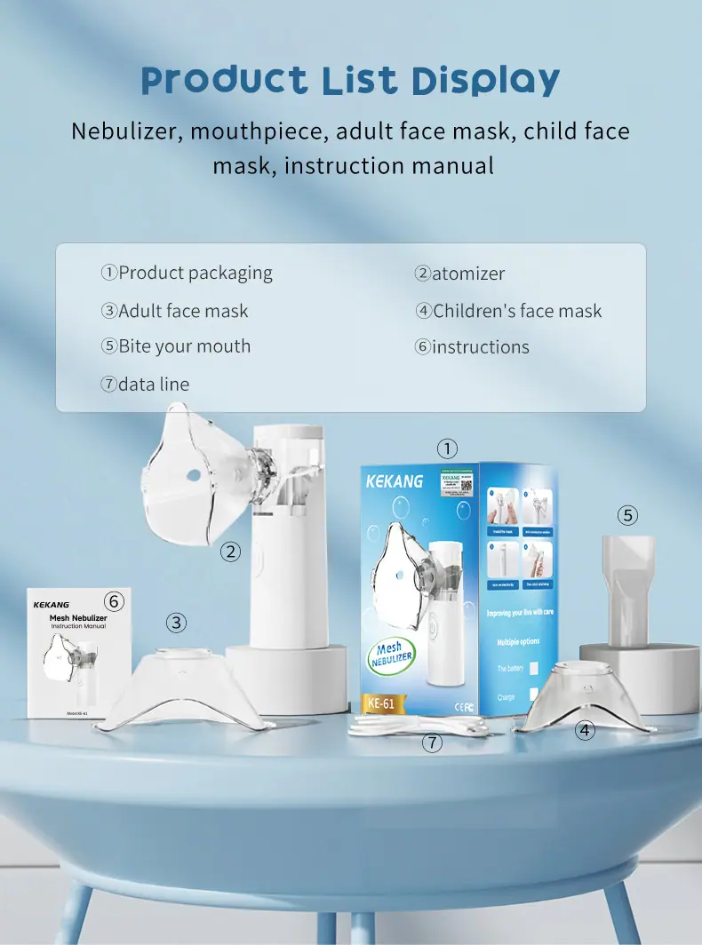 1x nebulizer, 1x adult mask, 1x kids mask, 1x nebulizer mouthpiece, 1x usb power cord, 1x instruction manual, ...