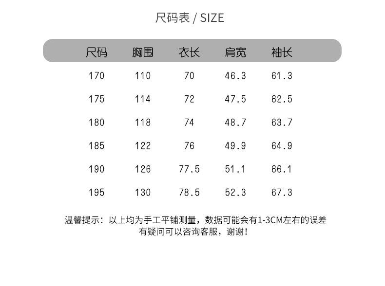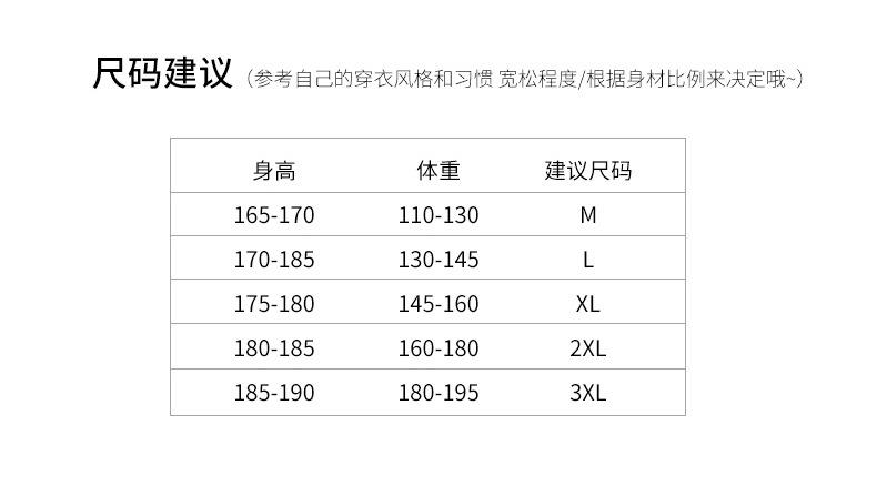 M/170, L/175, XL/180, XXL/185, XXXL/190, XXXXL/195
