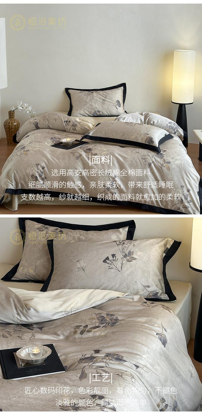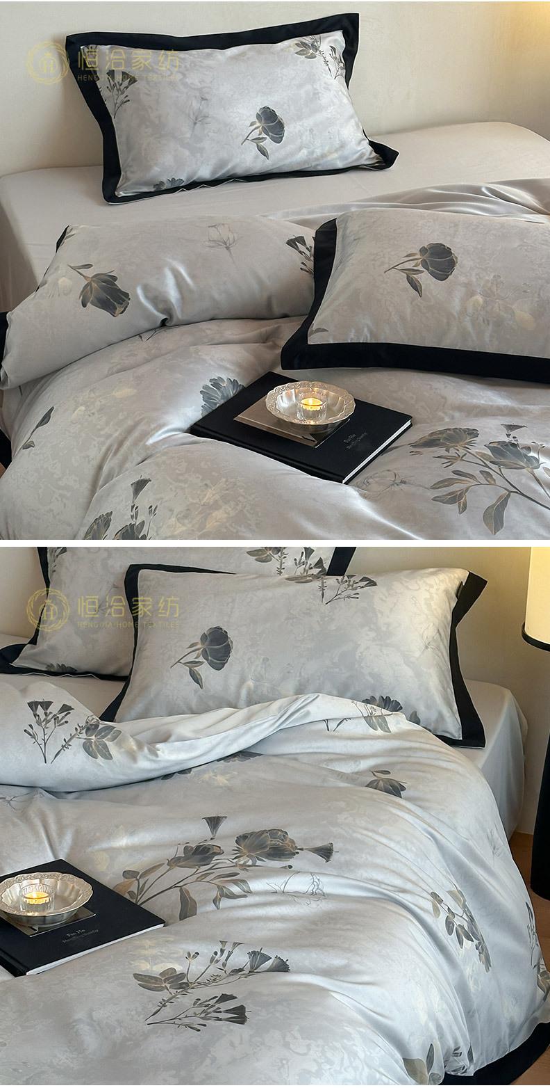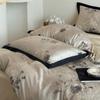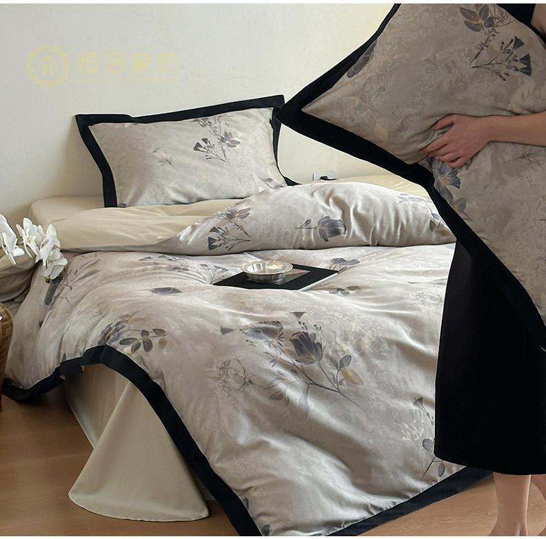 Conjunto de cuatro piezas de algodón puro de fibra larga de alta calidad, con estampado floral de lujo ligero y bordes a juego, funda de edredón, ropa de cama gris y dorada.
