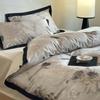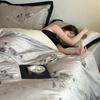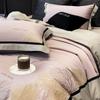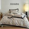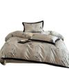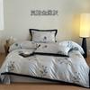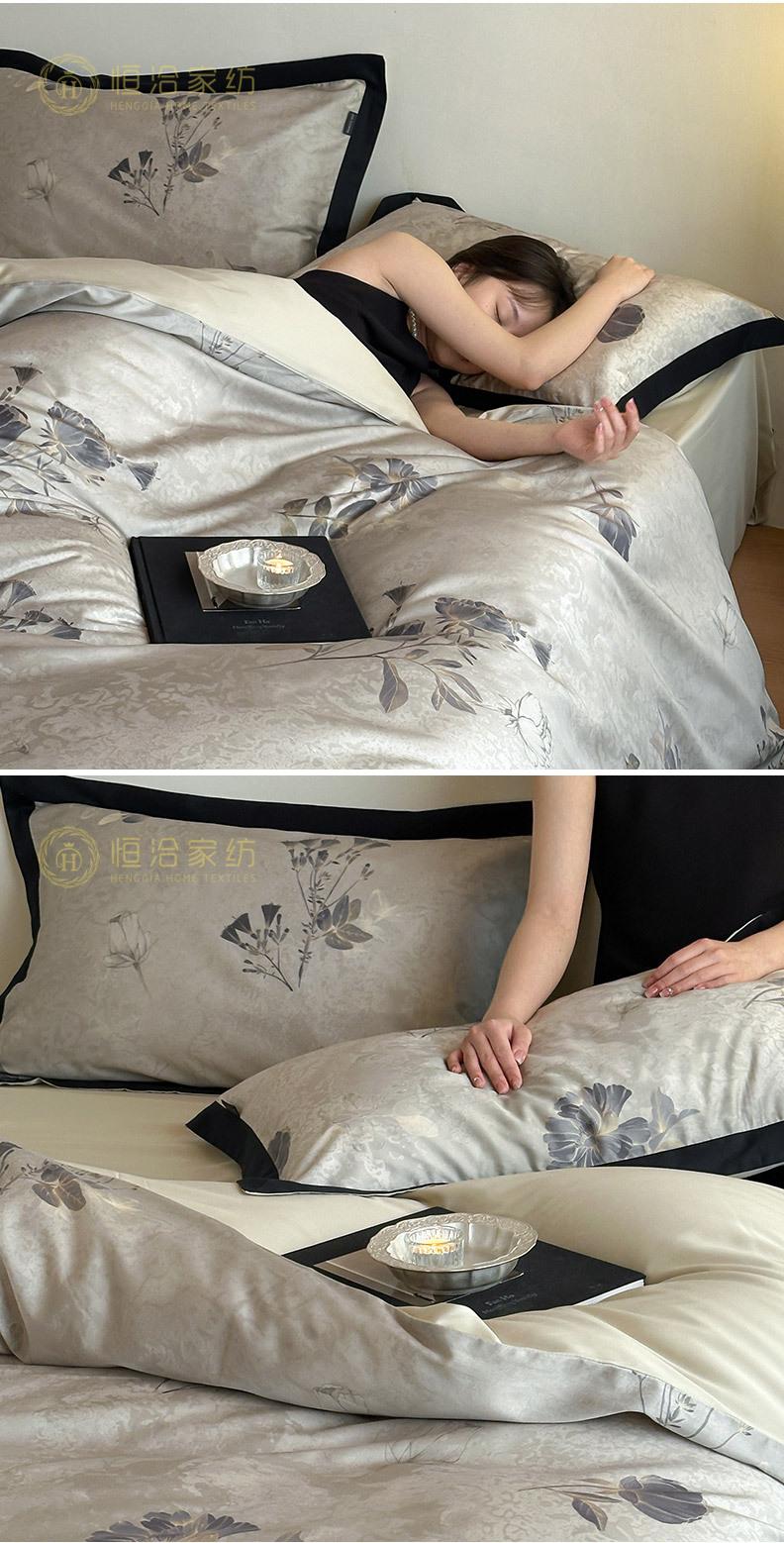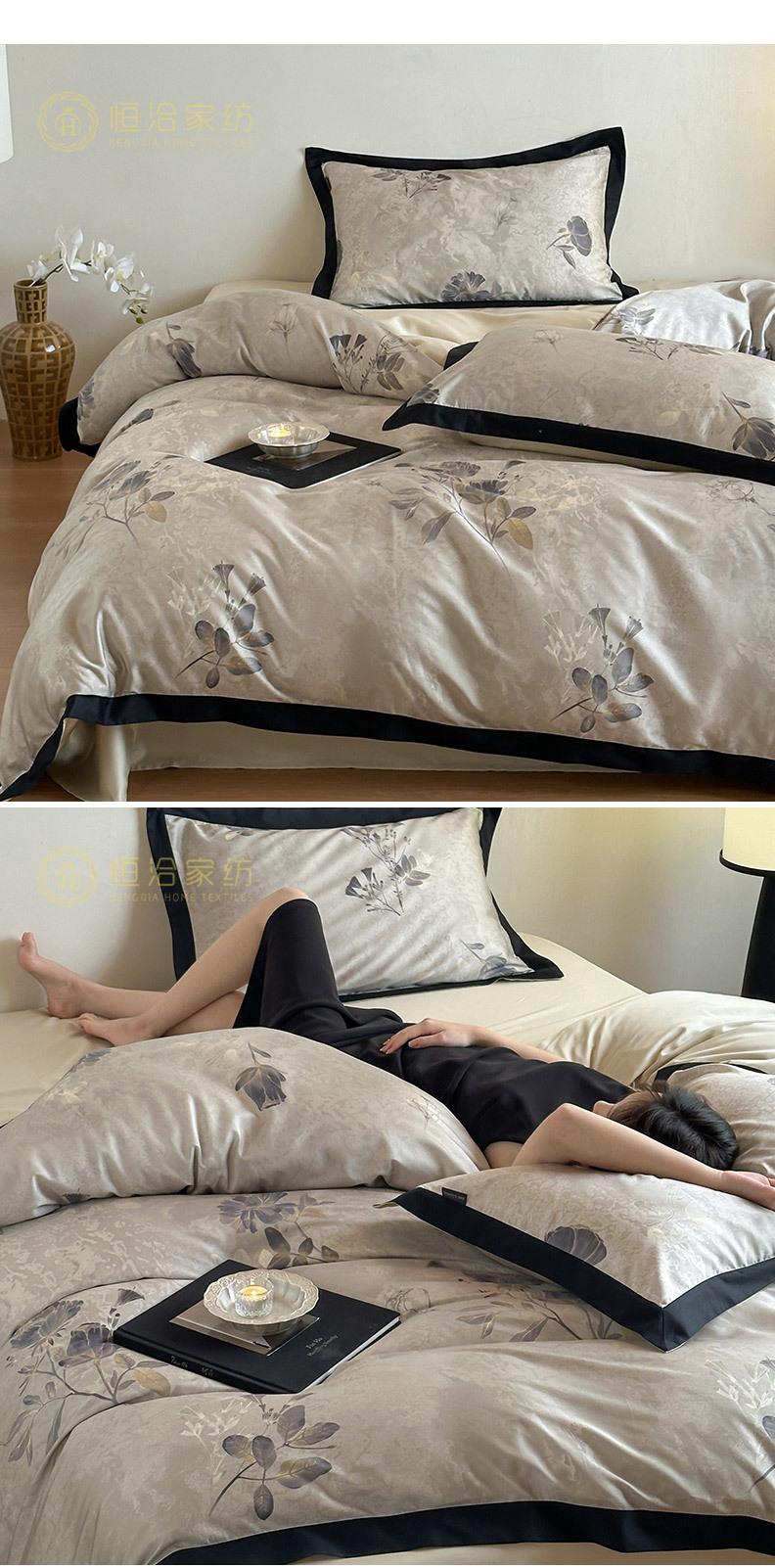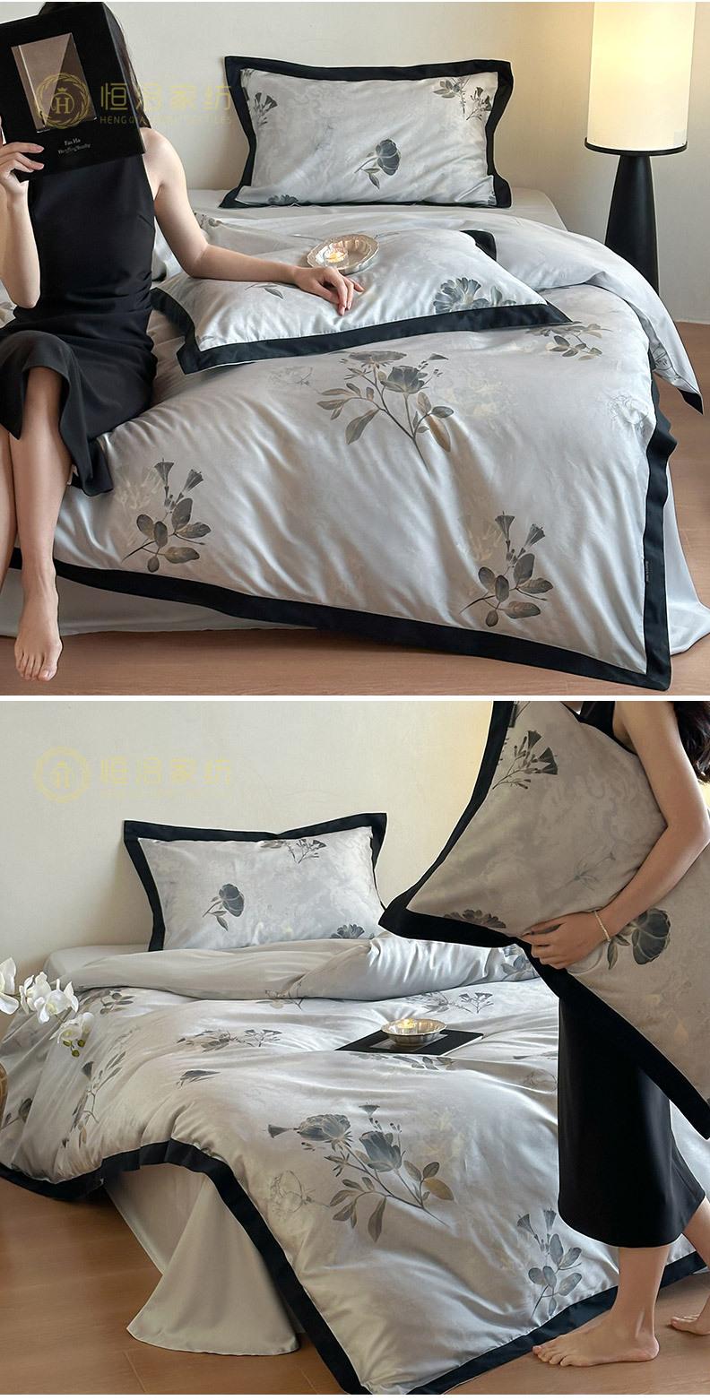 Conjunto de cuatro piezas de algodón puro de fibra larga de alta calidad, con estampado floral de lujo ligero y bordes a juego, funda de edredón, ropa de cama gris y dorada.