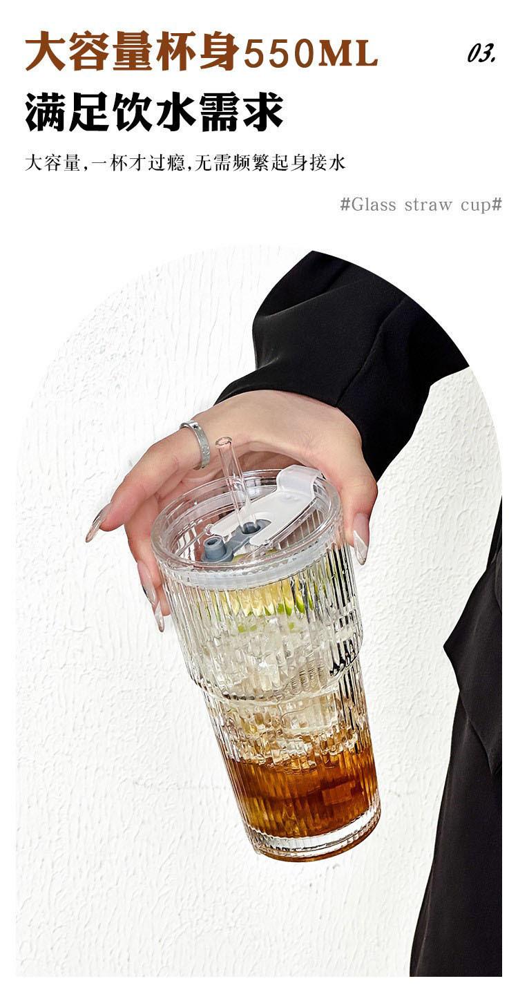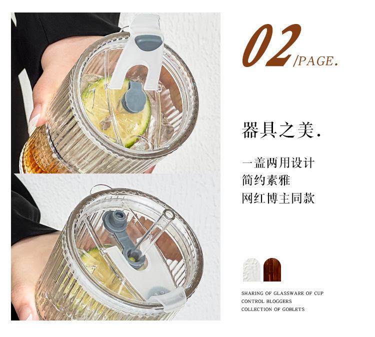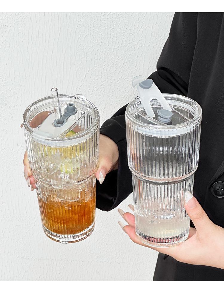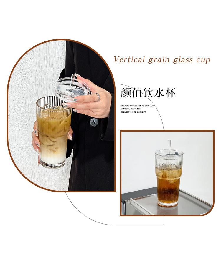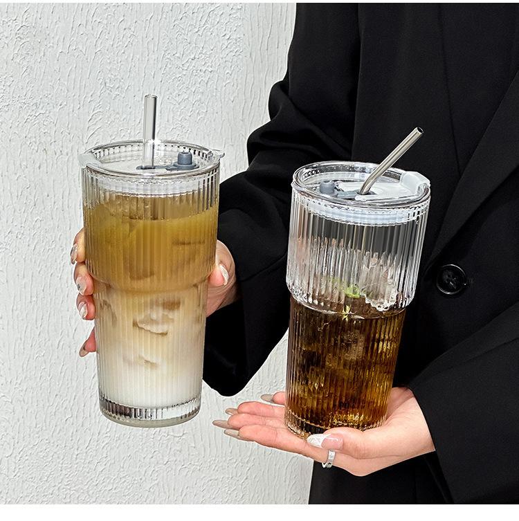 Vaso de Vidrio Rayado Vertical de Gran Capacidad Estilo Ins con Tapa y Popote Alto Valor de Color Vaso para Bebidas Frías Vaso para Jugo de Frutas Vaso para Café Vaso para Agua