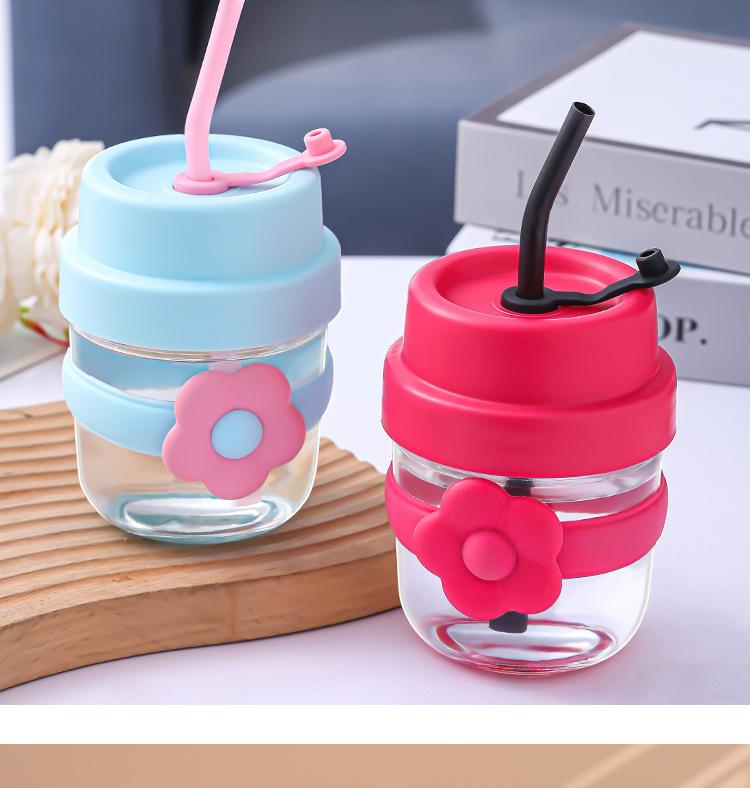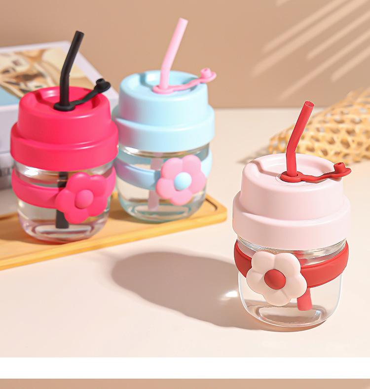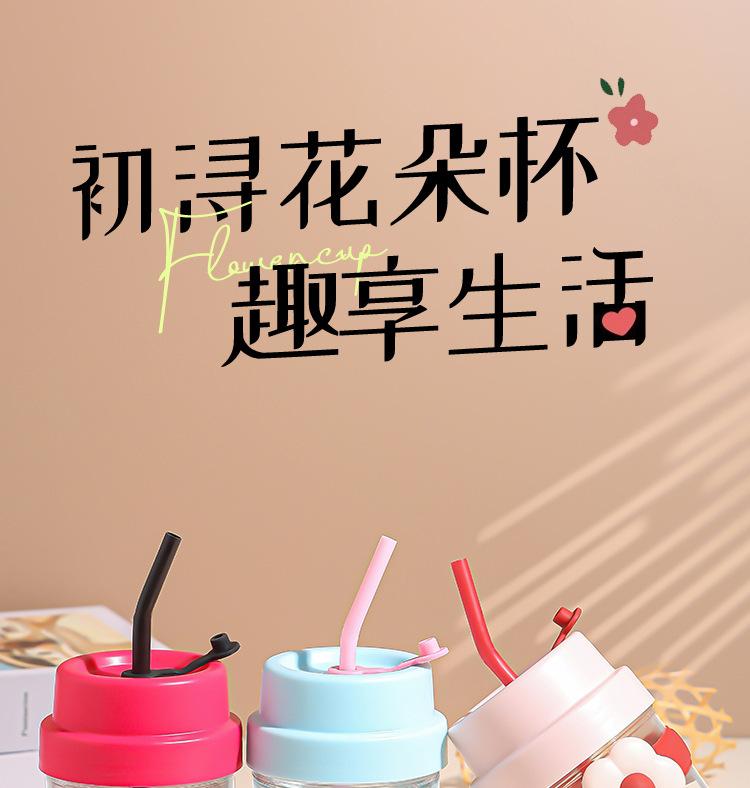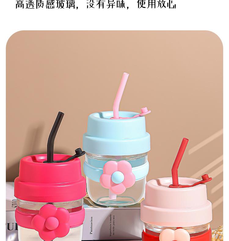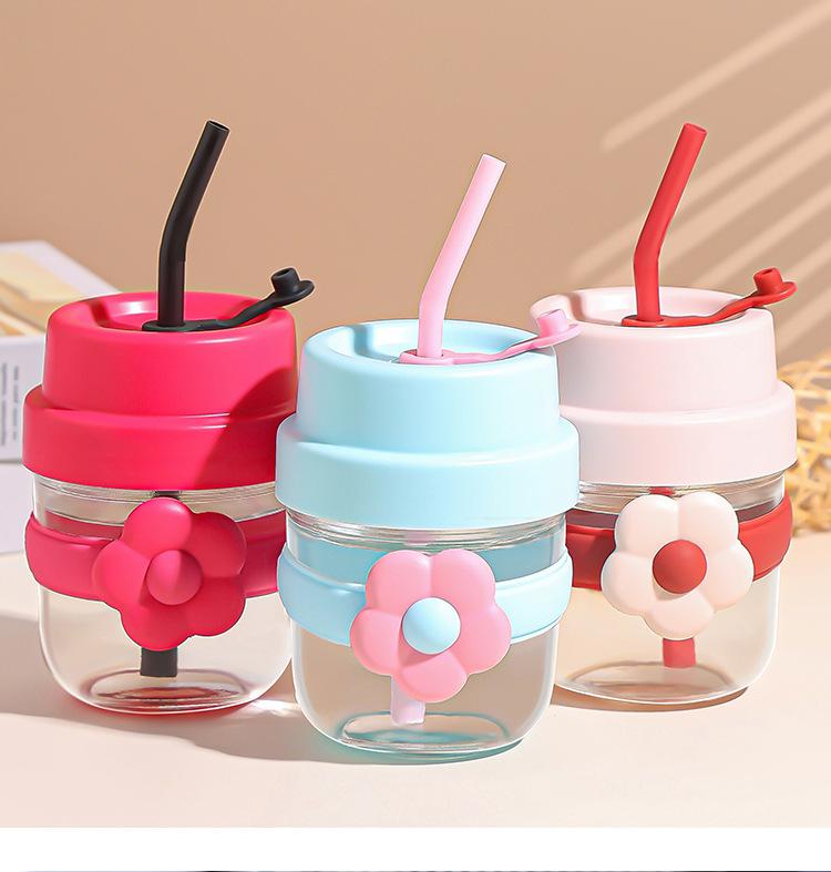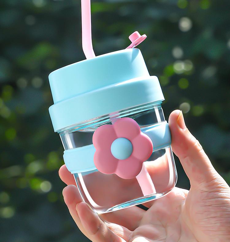 Vaso de Vidrio con Popote de Flor Vaso de Agua para Mujer Vaso Portátil Vaso para Café Colorido para Niños Estudiantes Vaso de Agua Bebida Jugo