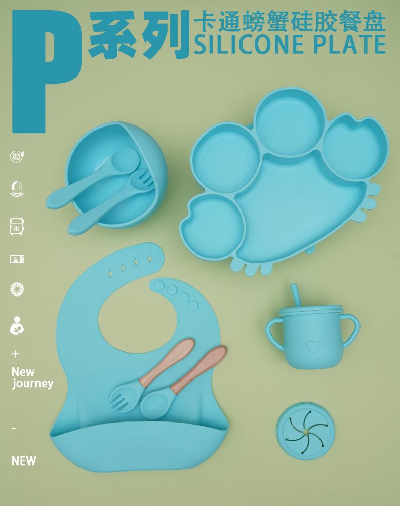 Crab blue dinner plate + silicone fork + spoon + bowl + rice bag + cup + two cup lids 8-piece set