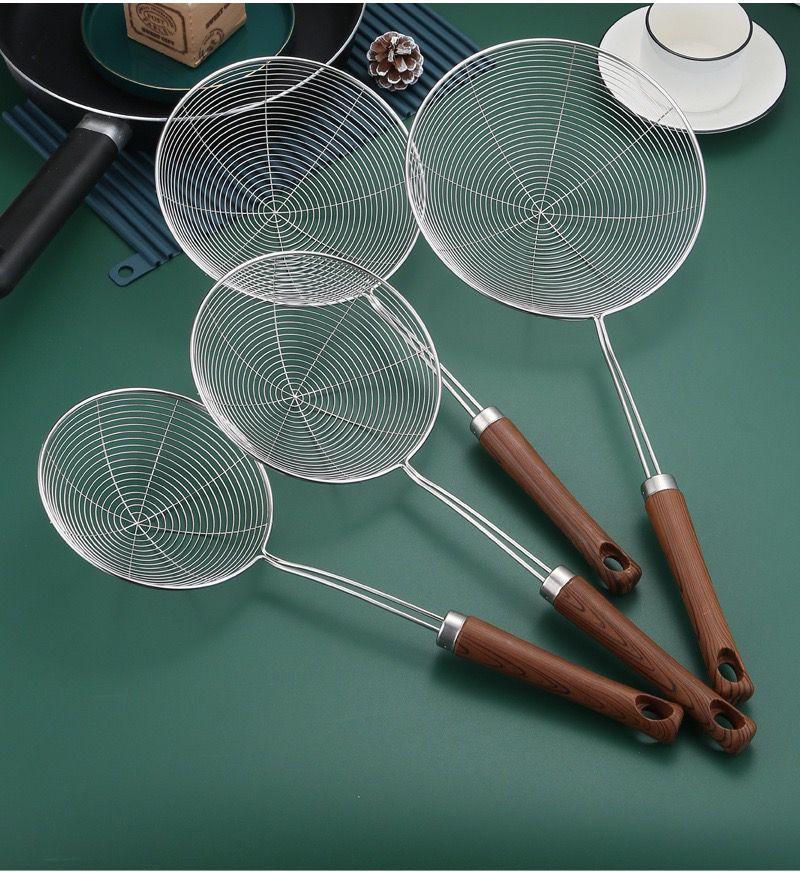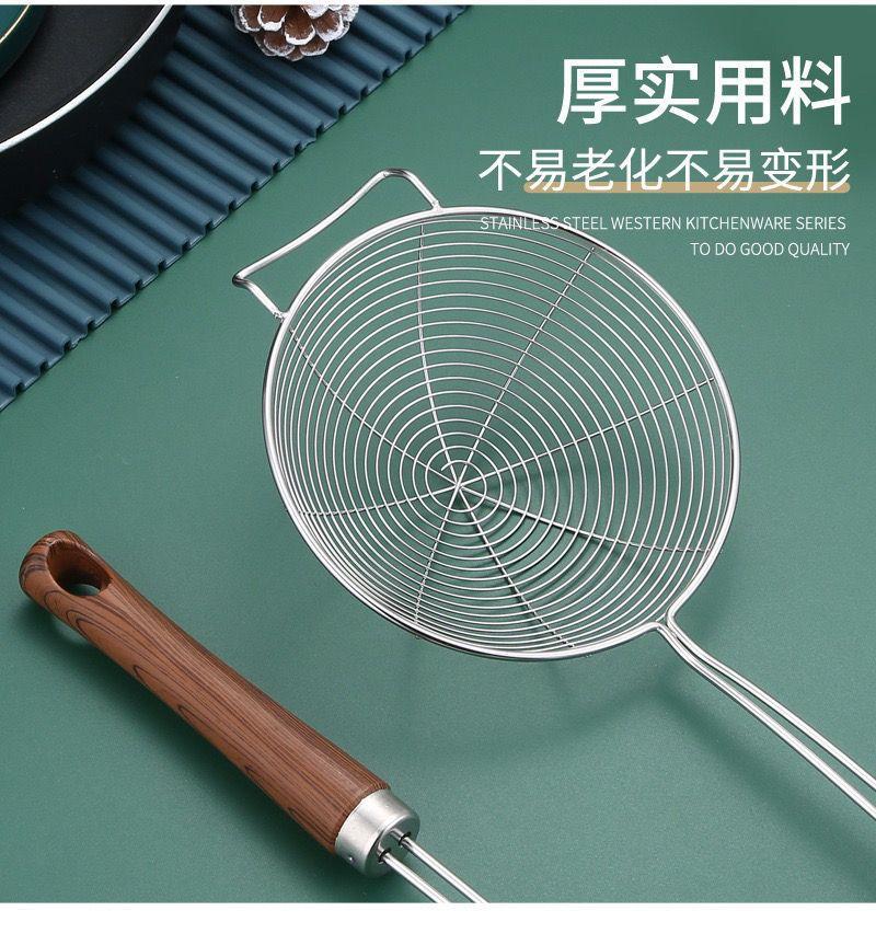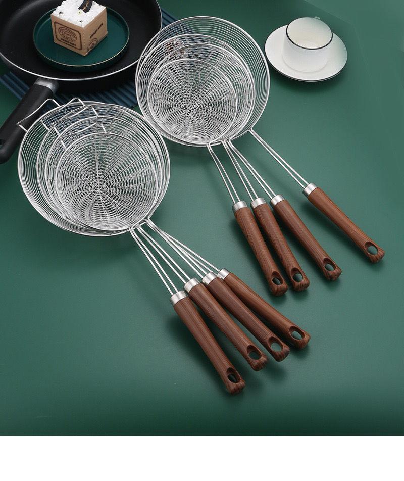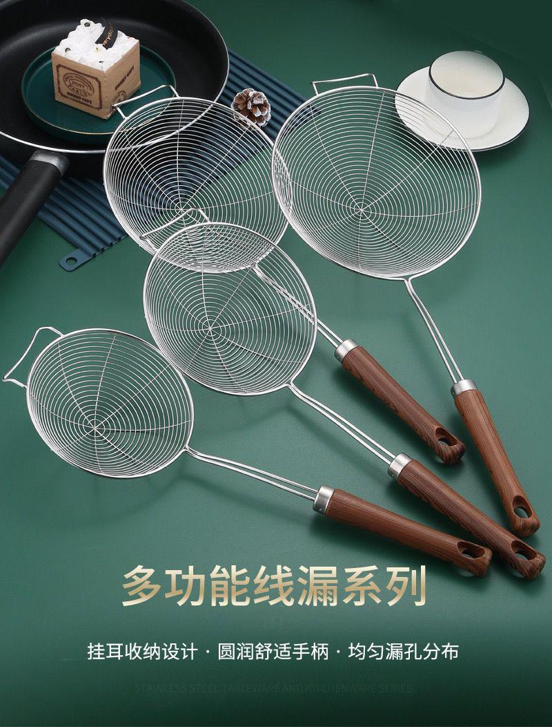 Compra Colador de acero inoxidable para cocina doméstica, filtro para fideos fritos, olla caliente comercial, cuchara grande, mango de madera al por mayor en Joom.pro