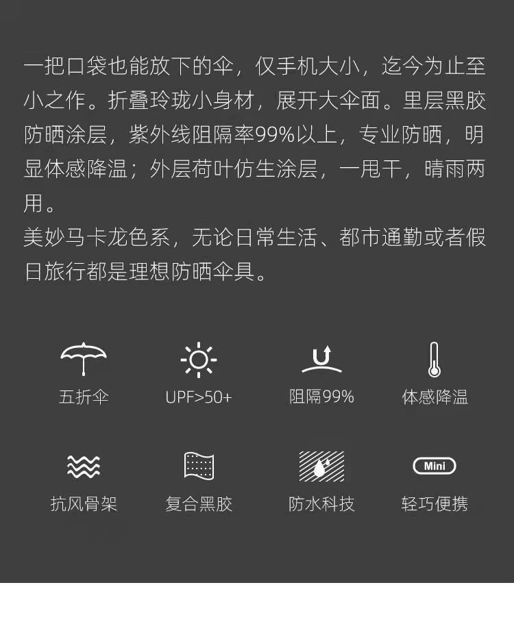 | Mini sombrilla para días soleados y lluviosos, sombrilla portátil ultraligera y compacta, protección UV, sombrilla de bolsillo plegable al 50%. | |