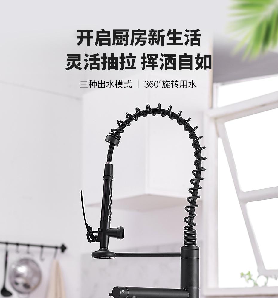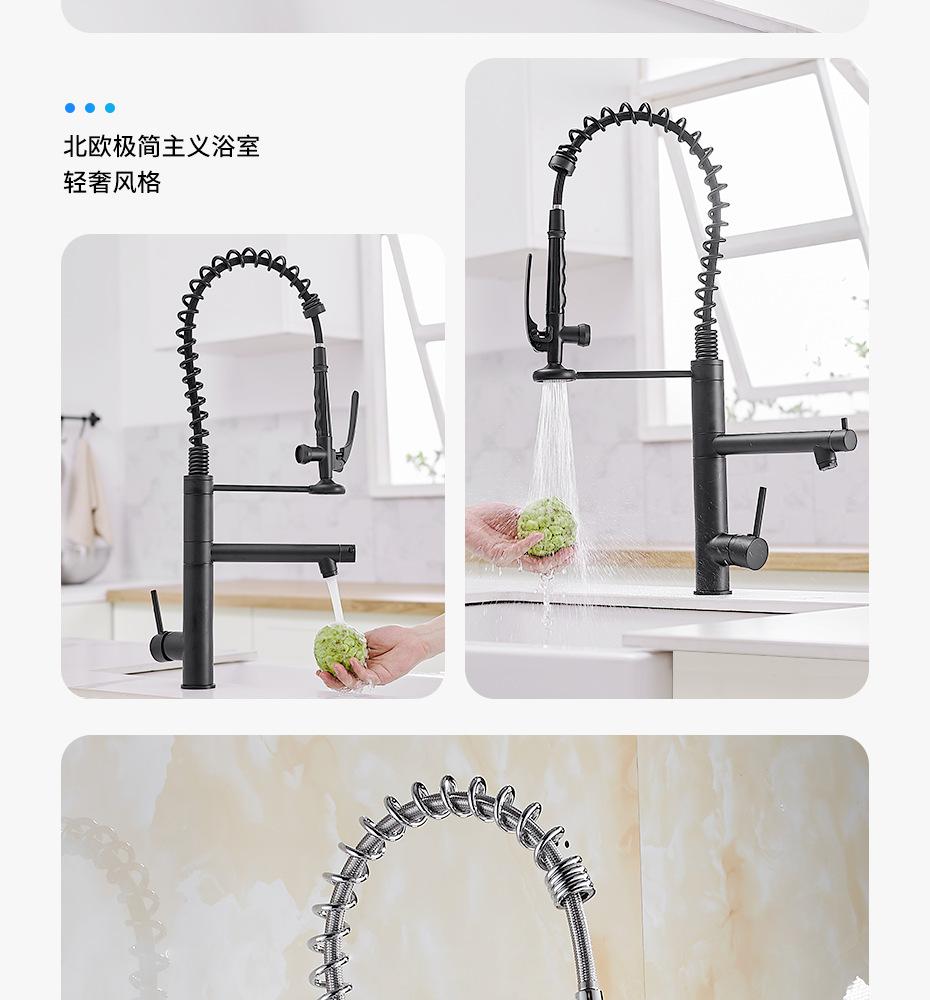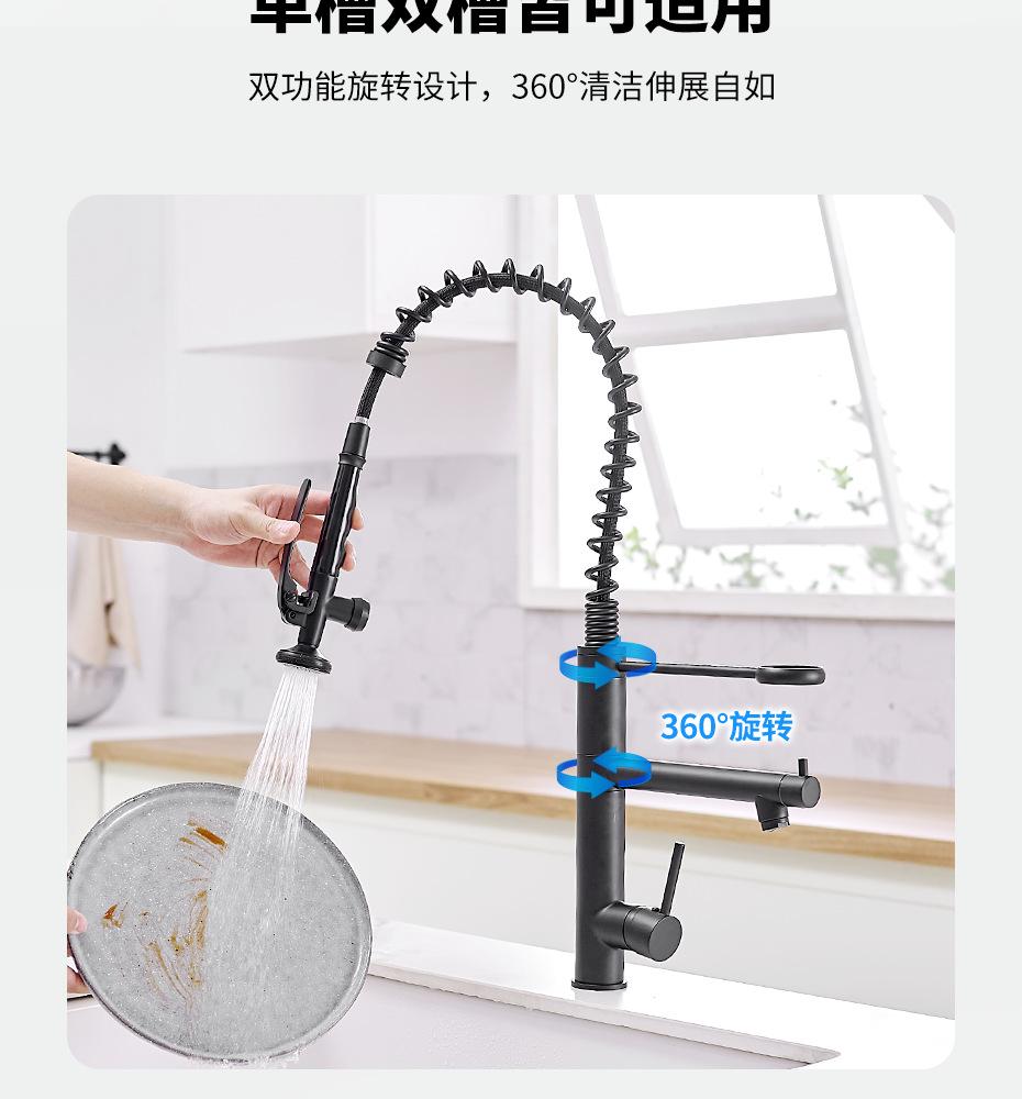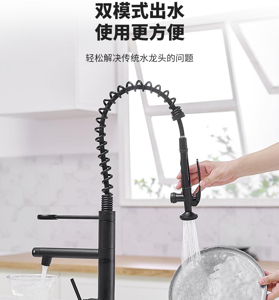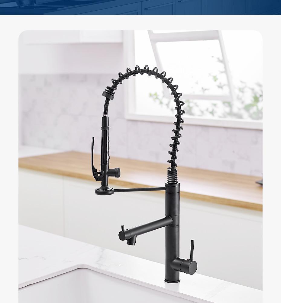Grifo de cocina alto de primavera negro, grifo para lavabo de verduras, grifo de doble salida para agua caliente y fría