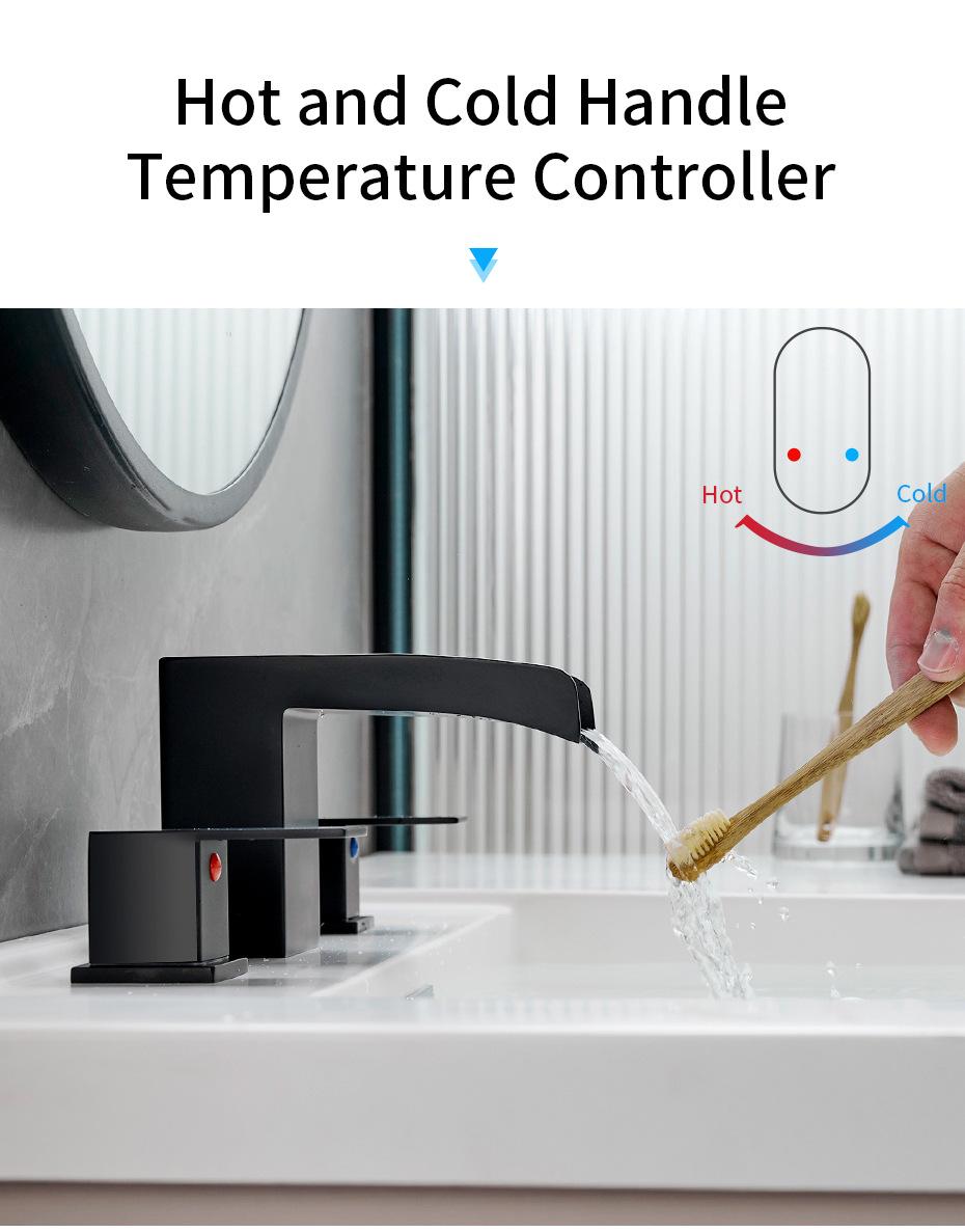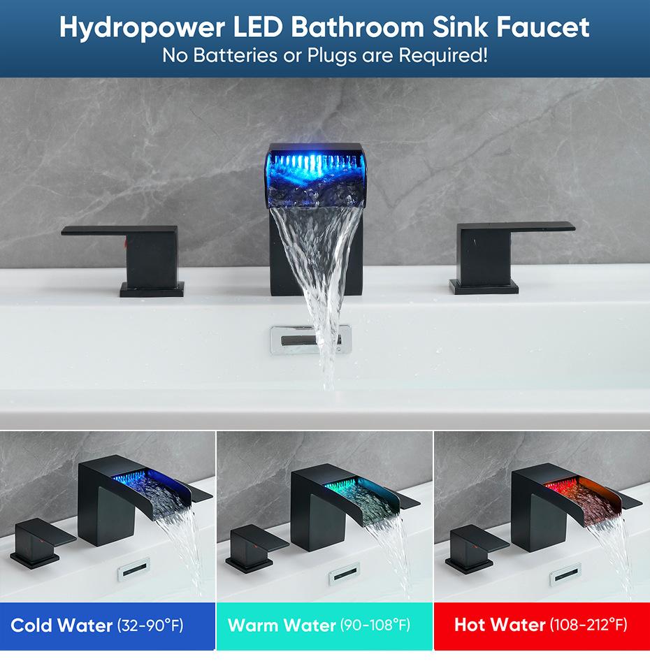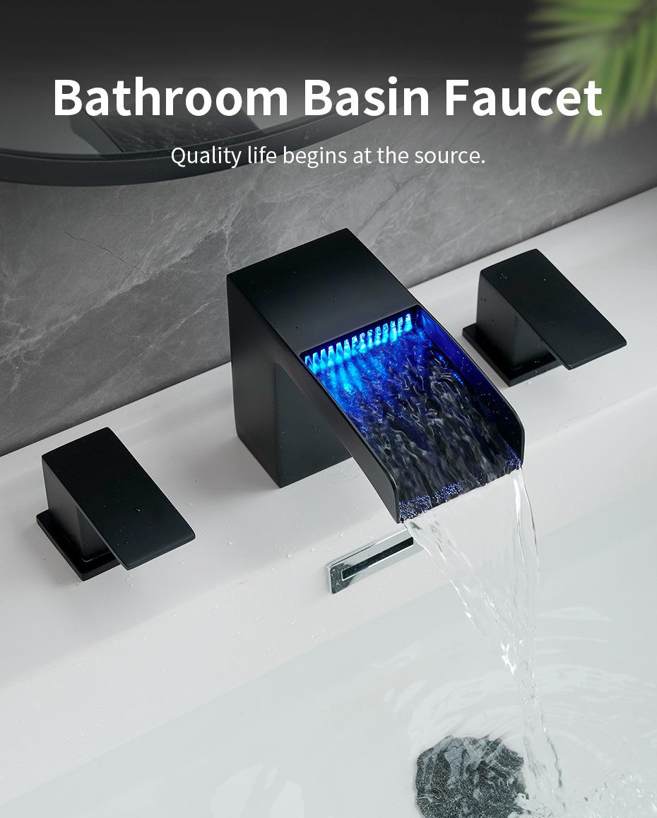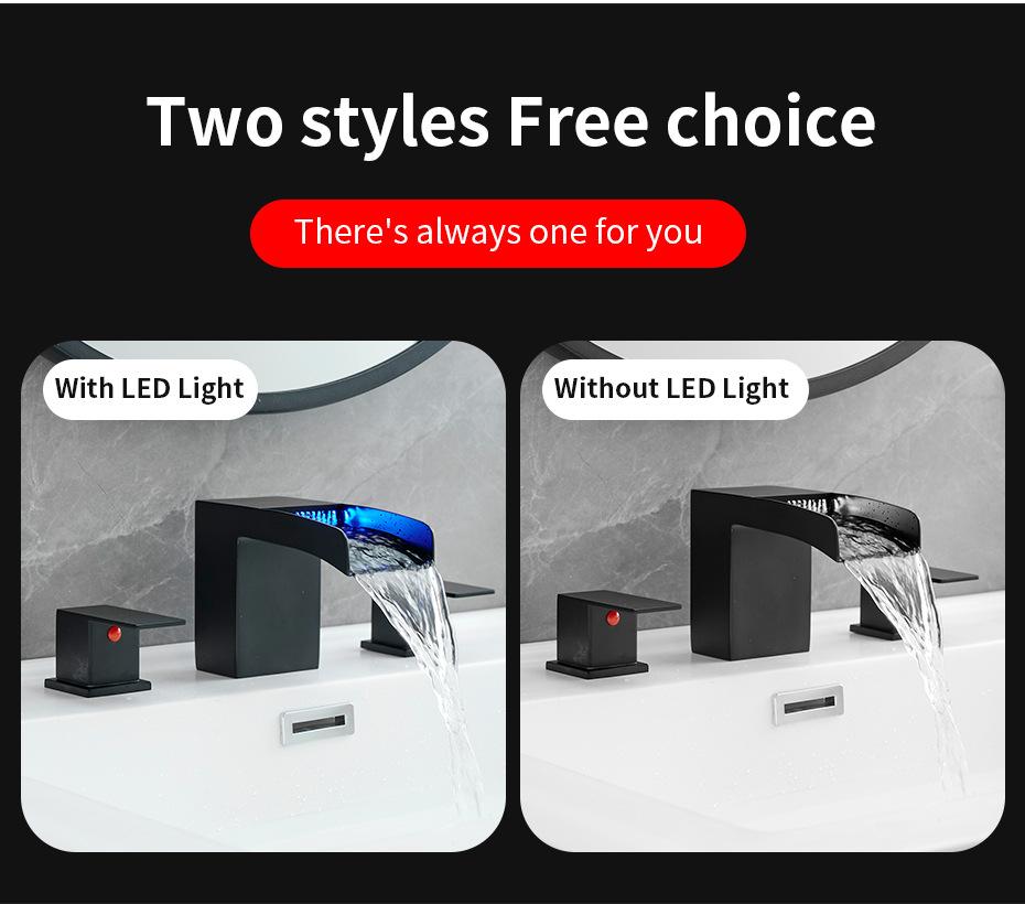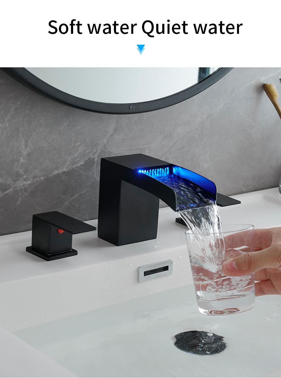Compra Grifo de Lavabo Negro de Tres Agujeros Baño Lavabo Simple Gabinete de Baño Mezcla Fría y Caliente Luz LED Grifo Cascada al por mayor en Joom.pro
