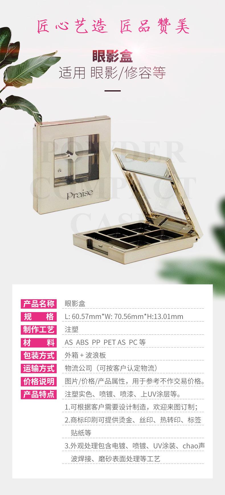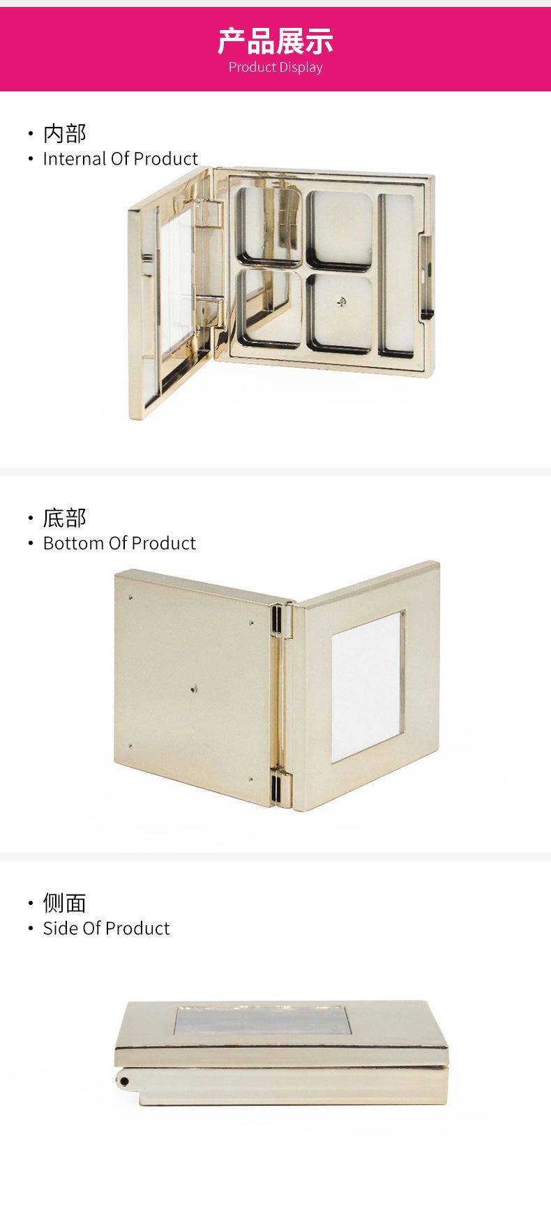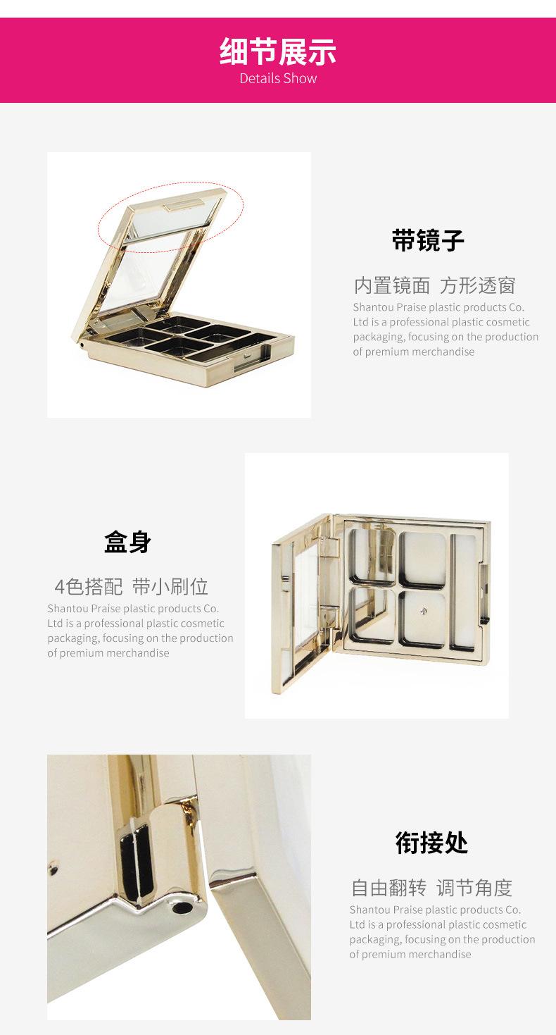 Los fabricantes suministran una placa de sombra de ojos de ventana transparente de 4 rejillas dorada, caja cuadrada de plástico vacía, caja de maquillaje, embalaje artesanal