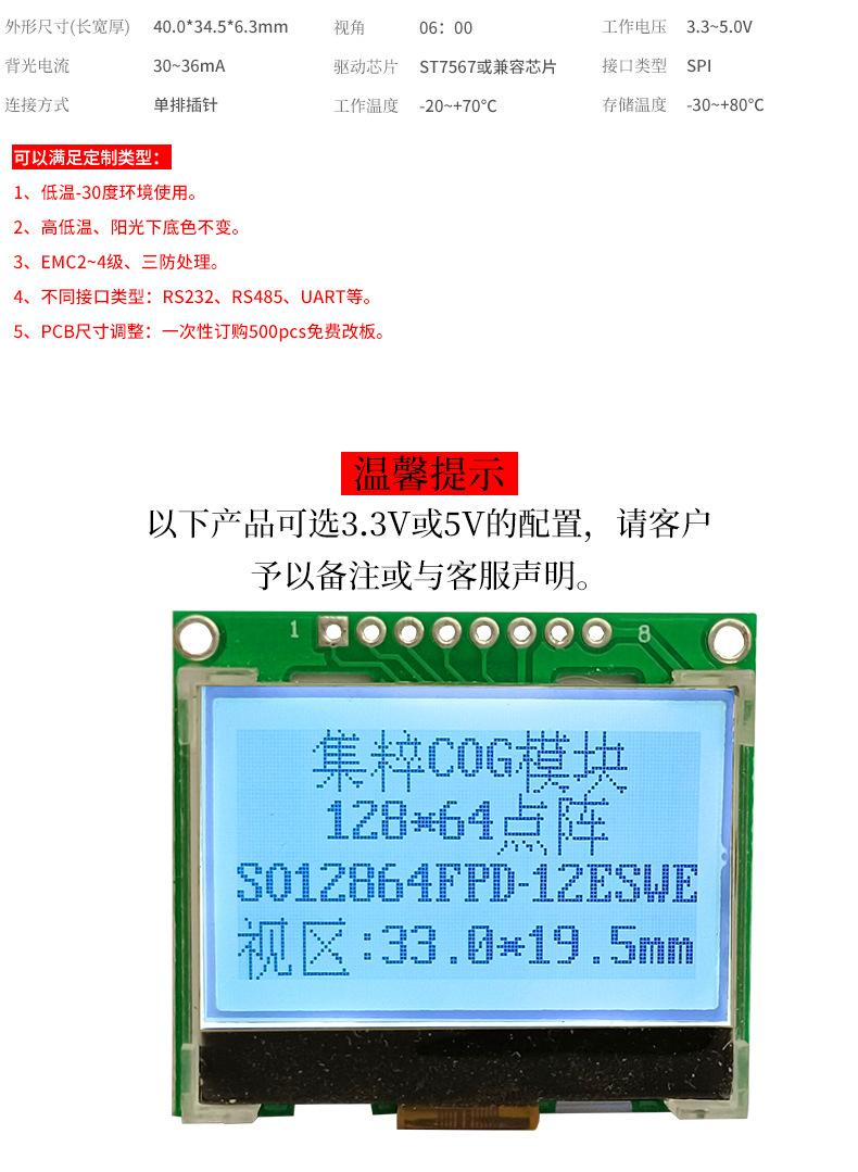 Módulo de visualización LCD de matriz de puntos 12864 de 1,5 pulgadas, módulo de visualización Cog, pantalla serie Lcmspi, módulo de visualización de pantalla desnuda