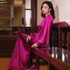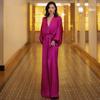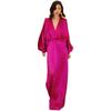 Vestido de noche para banquete con escote en V profundo en rojo rosa, elegante vestido de manga larga europeo y americano, elegante vestido de presentadora adelgazante