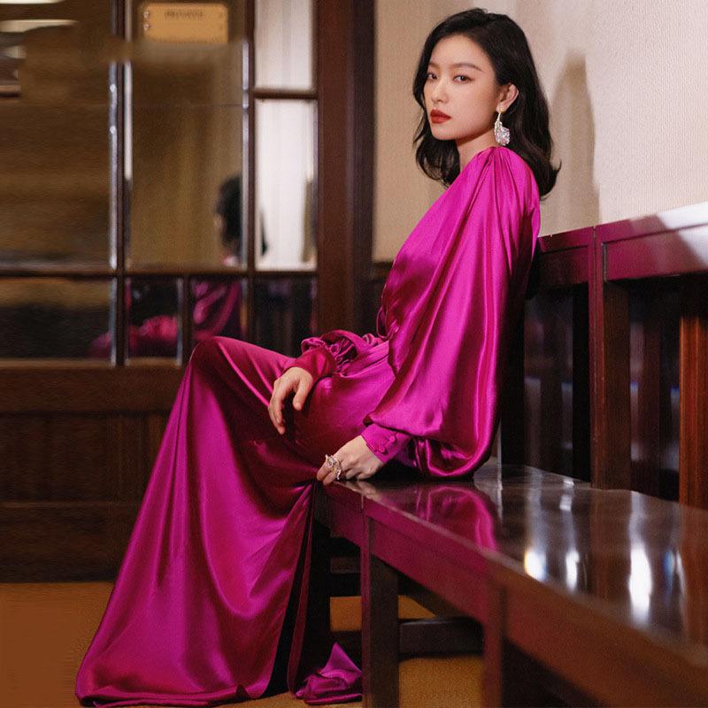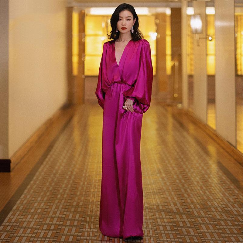Compra Vestido de noche para banquete con escote en V profundo en rojo rosa, elegante vestido de manga larga europeo y americano, elegante vestido de presentadora adelgazante al por mayor en Joom.pro