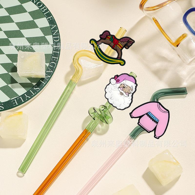 Tapa de Paja Caliente Navideña Transfronteriza en stock Vaso de Té con Leche Dibujos Animados PVC Pegamento Suave Clip para Paja Cubierta para Paja Accesorios