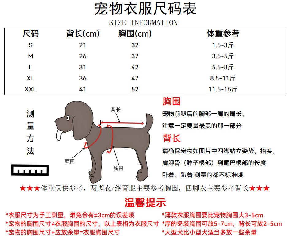 Recordatorio: Para perros y gatos, la ropa para dos patas debe medirse por la circunferencia del pecho, y la ropa para cuatro patas, por la longitud de la espalda. El peso no es un criterio de compra.