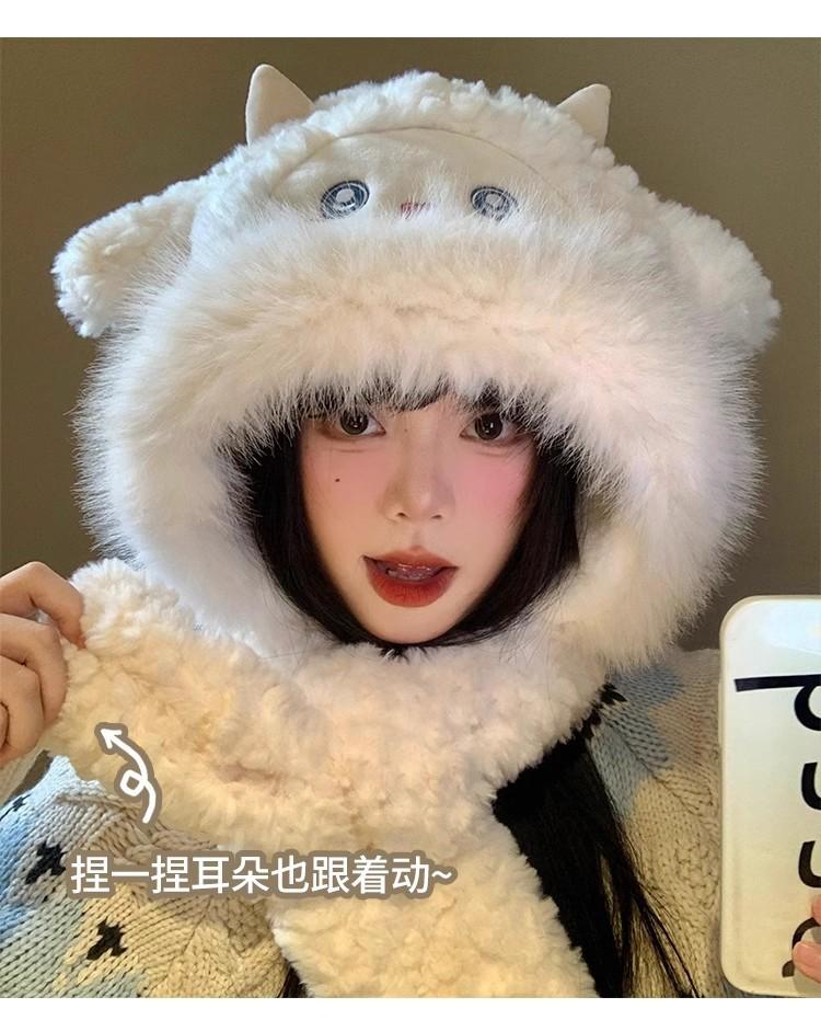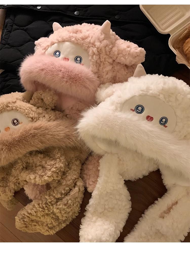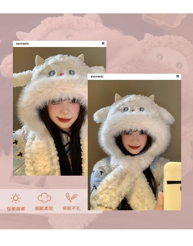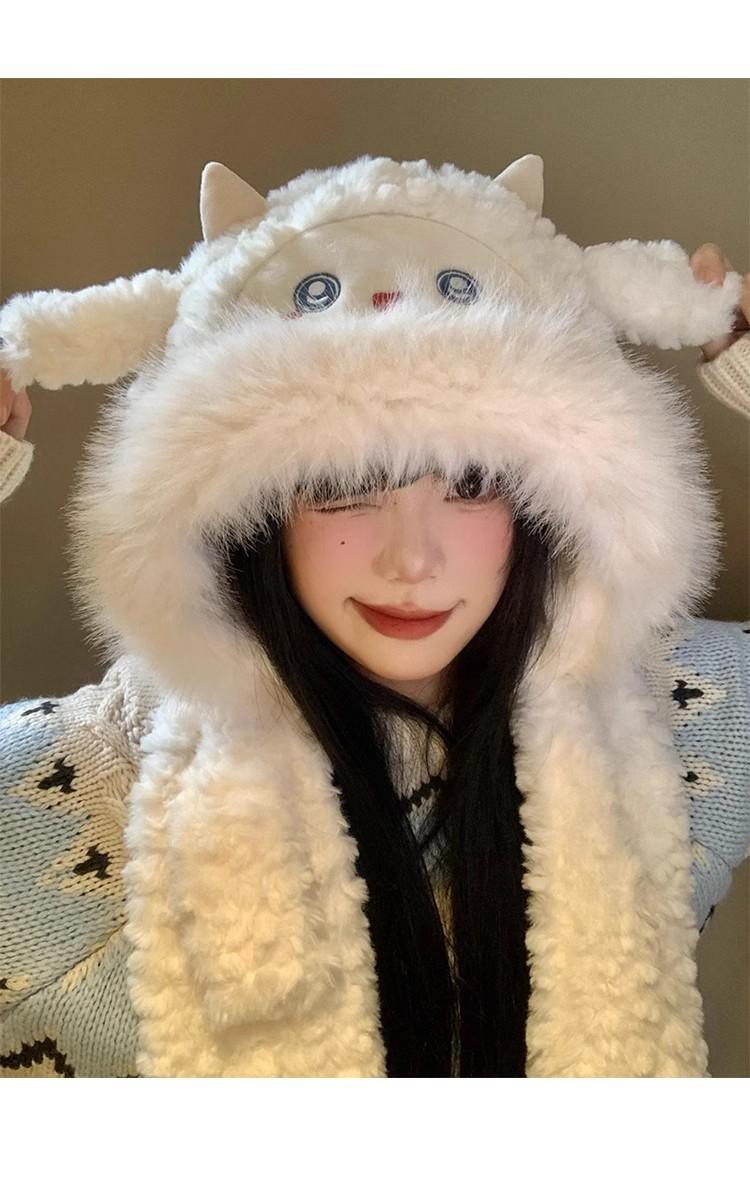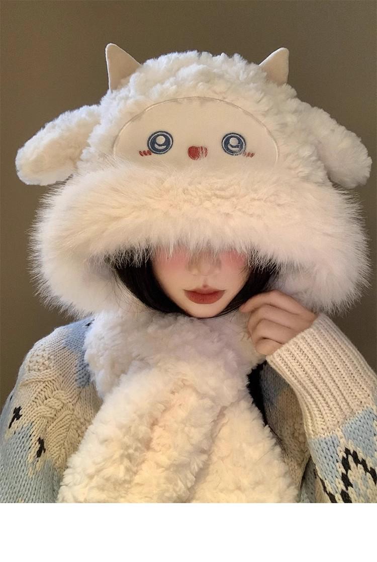 Gorro de oveja esponjoso para mujer, bonito gorro de invierno, cálido, resistente al frío, bufanda de una pieza, grueso, con protección para las orejas, gorro Lei Feng.
