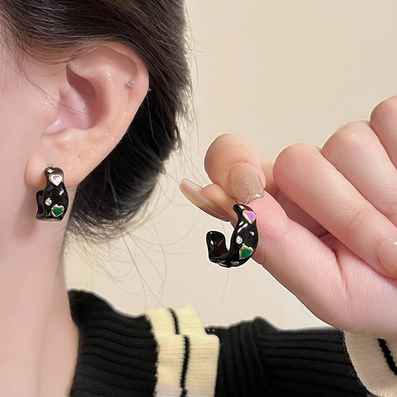 Red drop glaze c-shaped zircon earrings, Black dripping glaze c-shaped zircon earrings