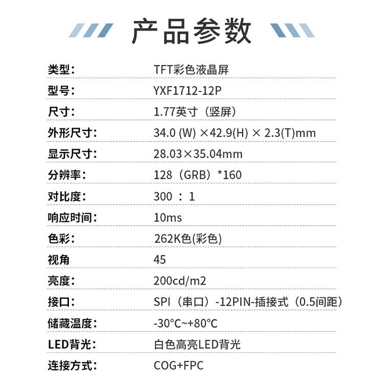 Pantalla LCD de 1.77 pulgadas Pantalla LCD Pantalla a color TFT Puerto serie SPI 12P Pantalla de instrumento de dispositivo portátil