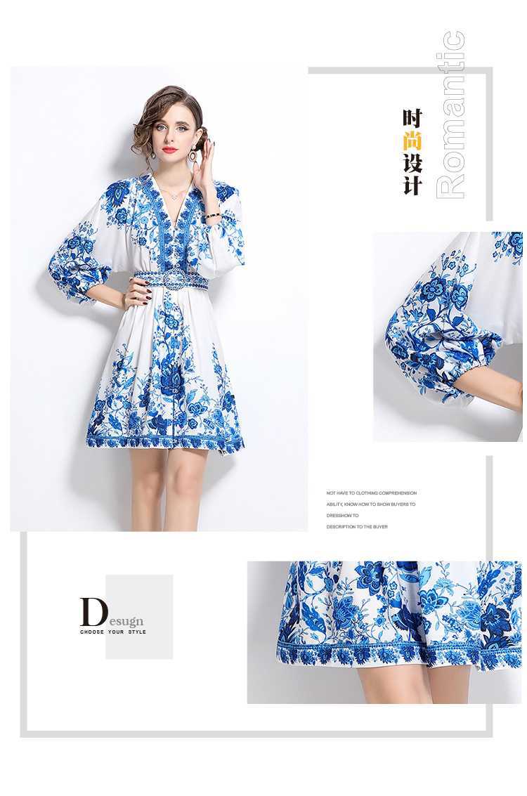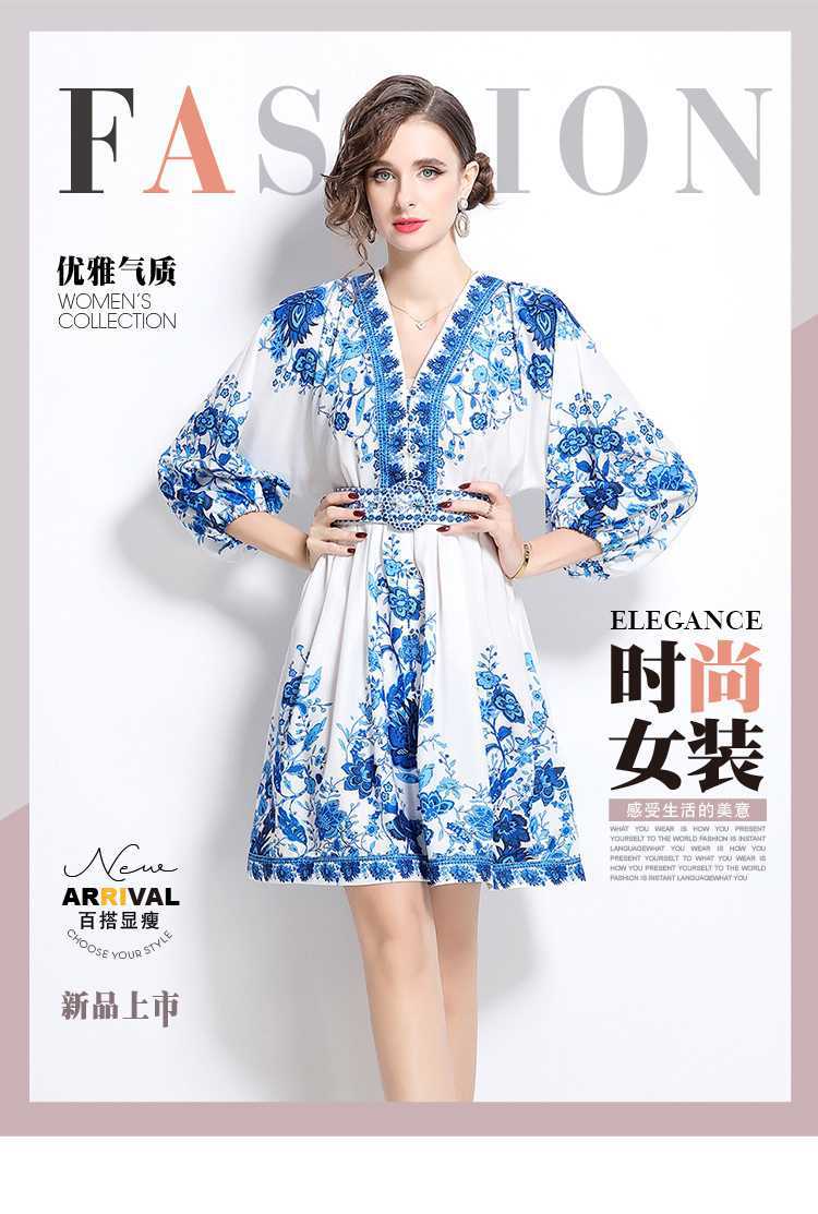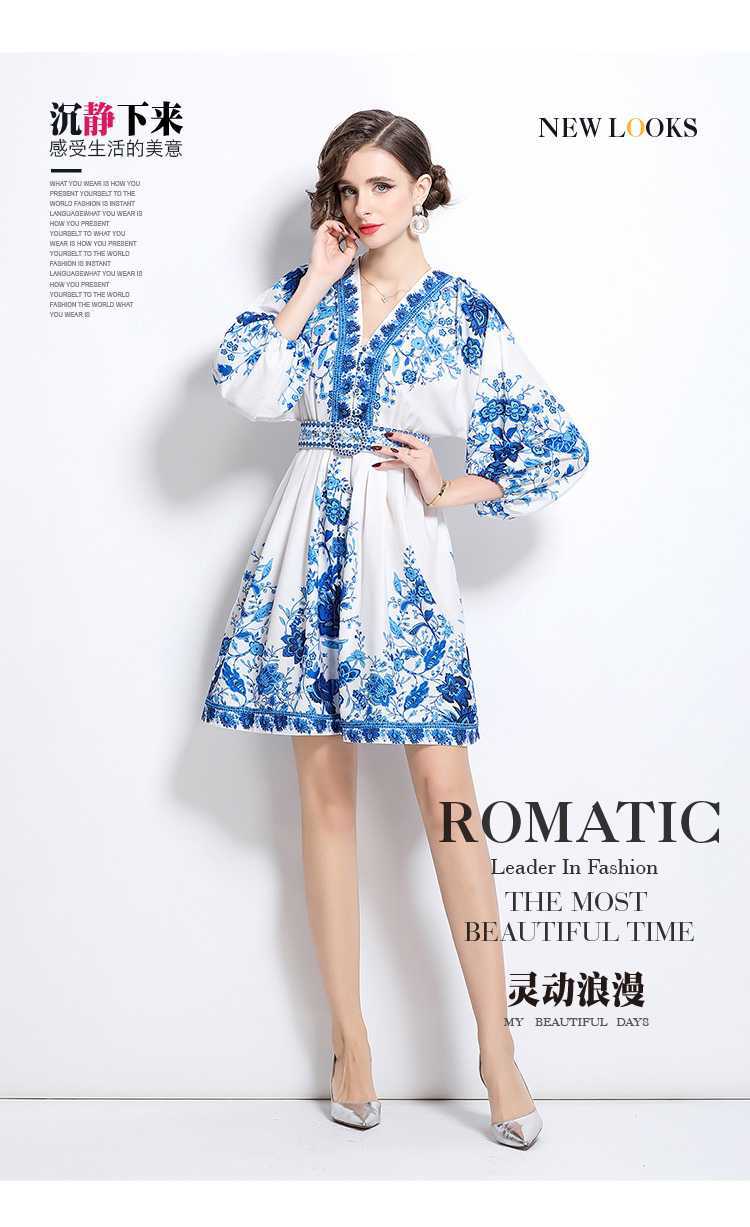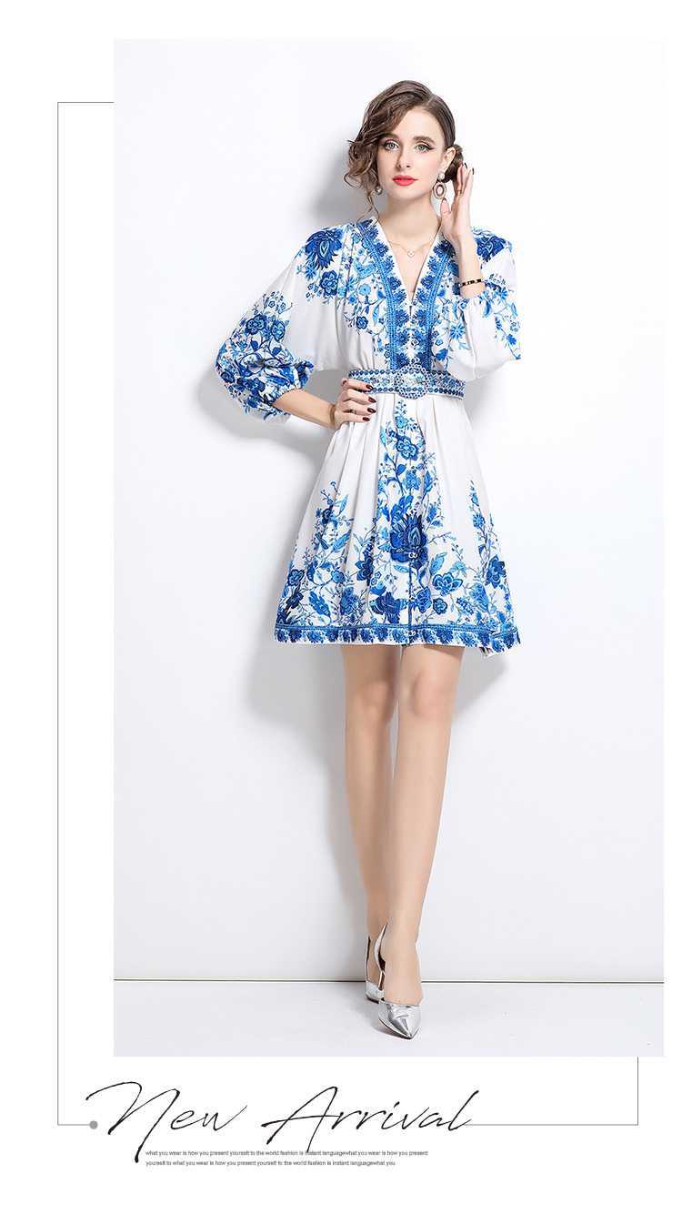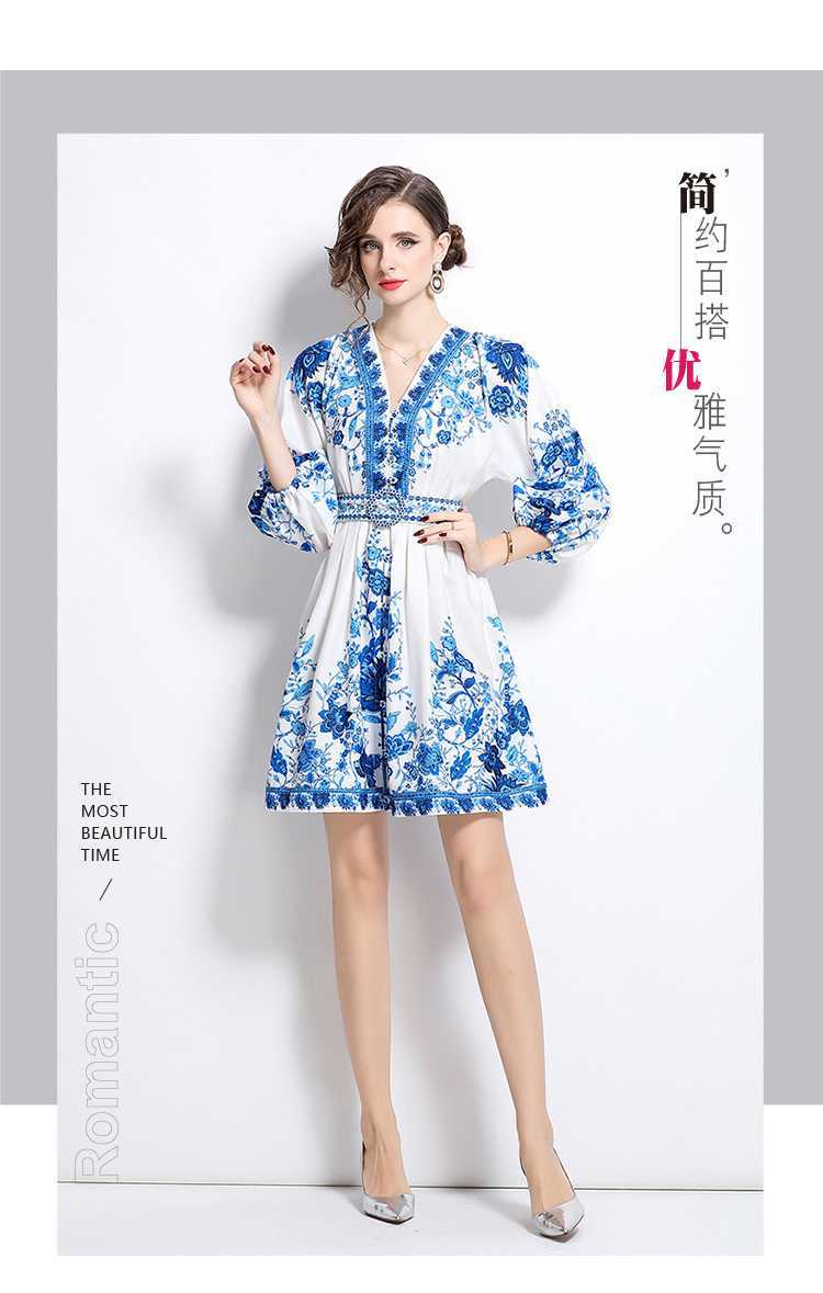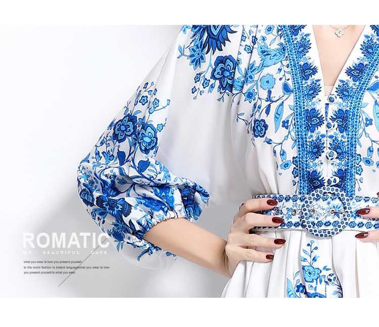 Foto Real en Stock - Estilo Palacio Retro Posicionamiento Estampado Manga Linterna Cuello V Cintura Adelgazante Look Vestido de un Solo Botón