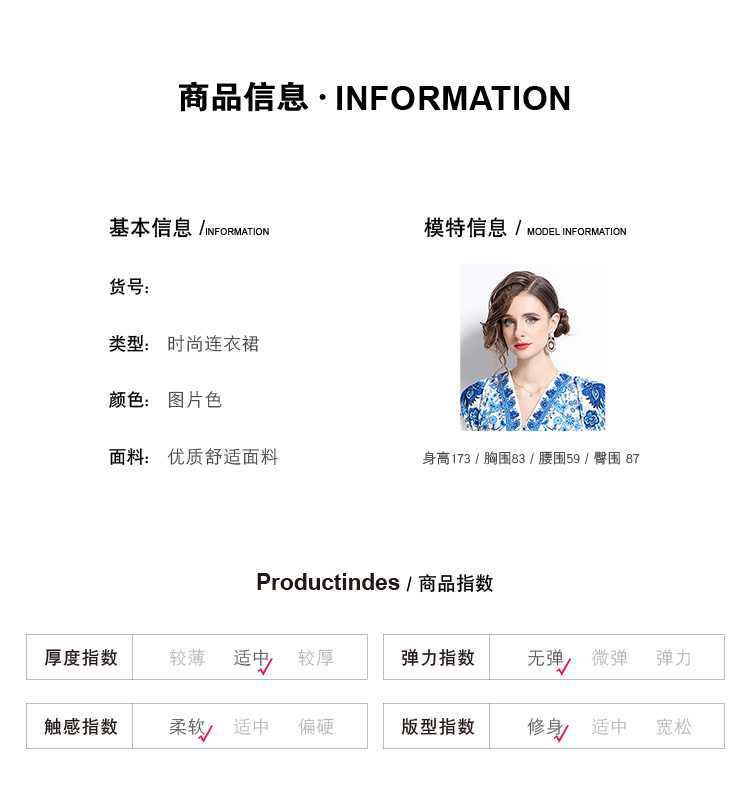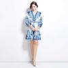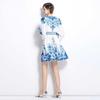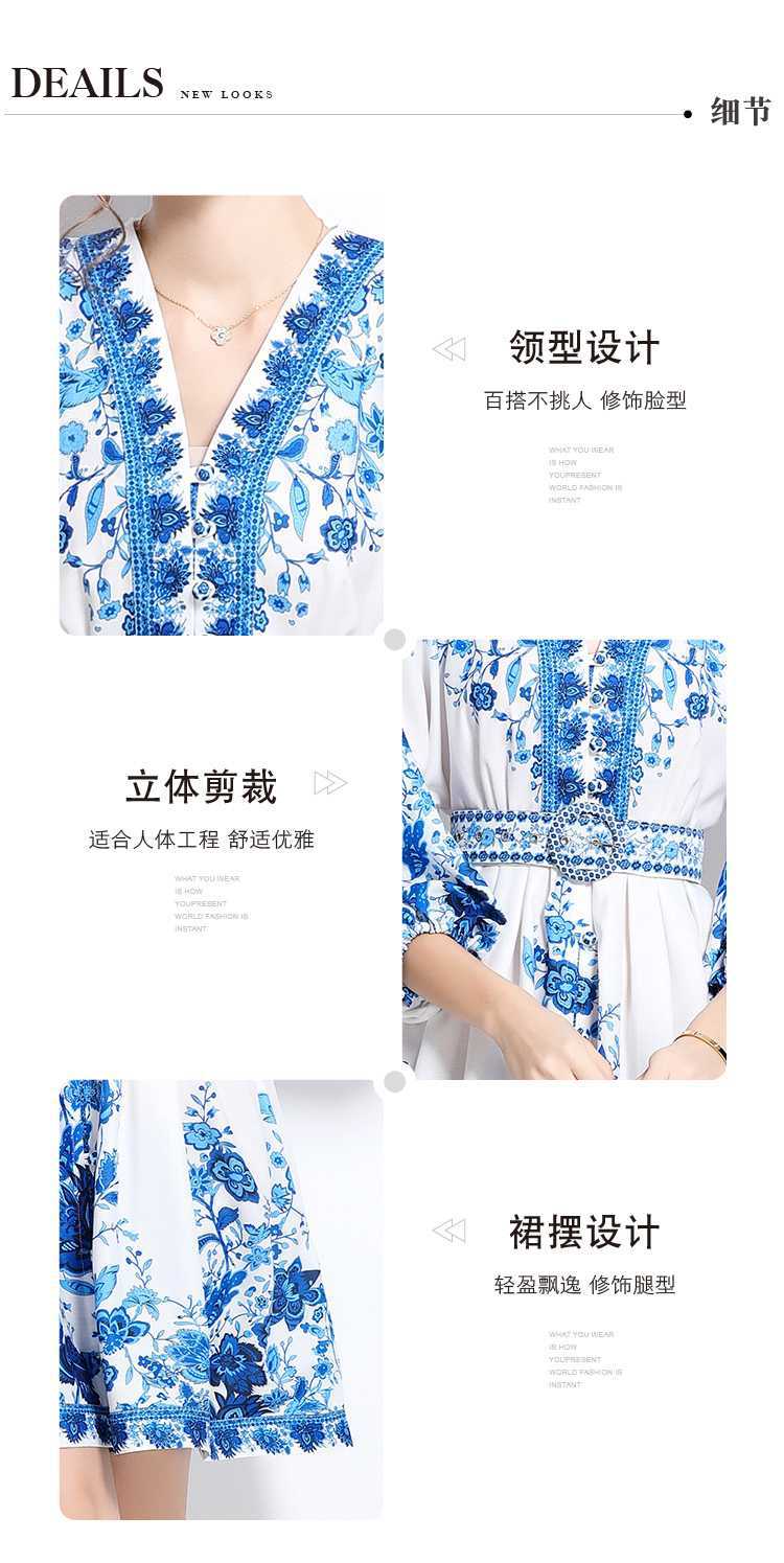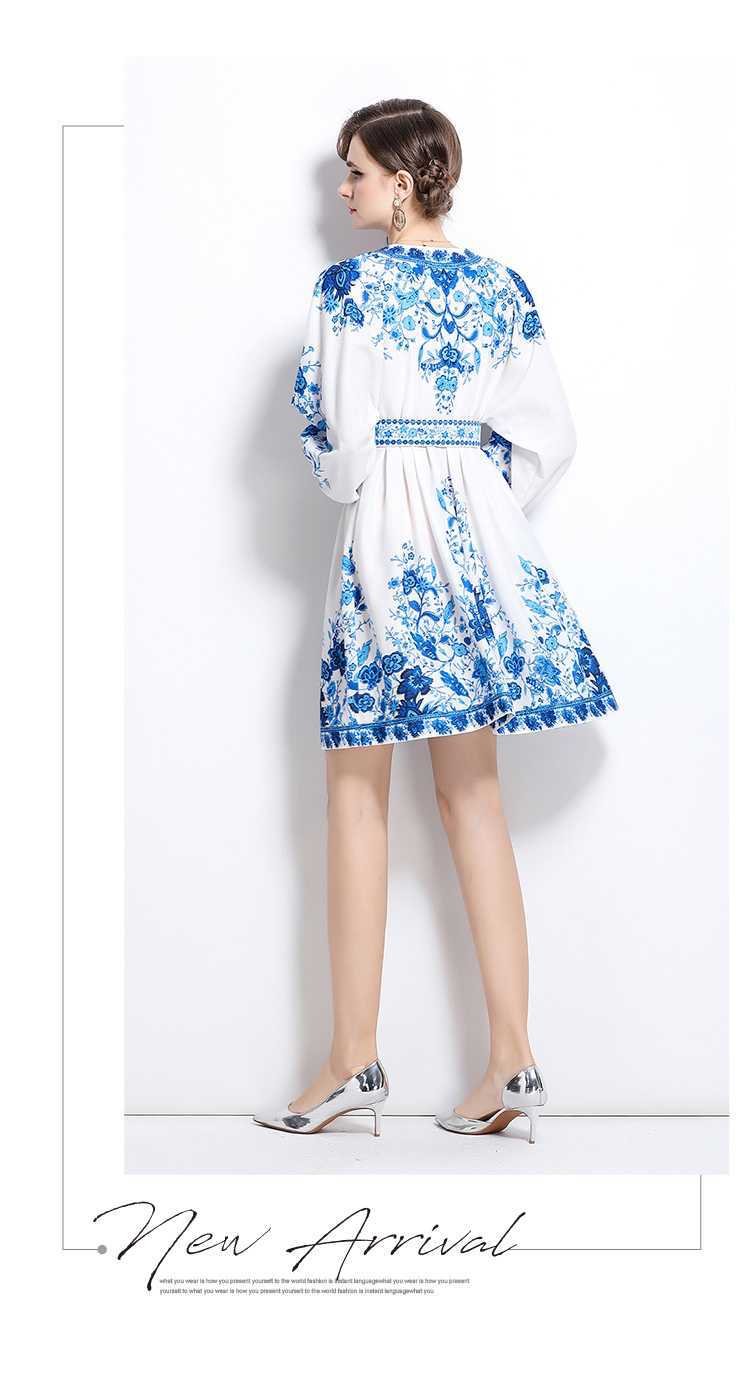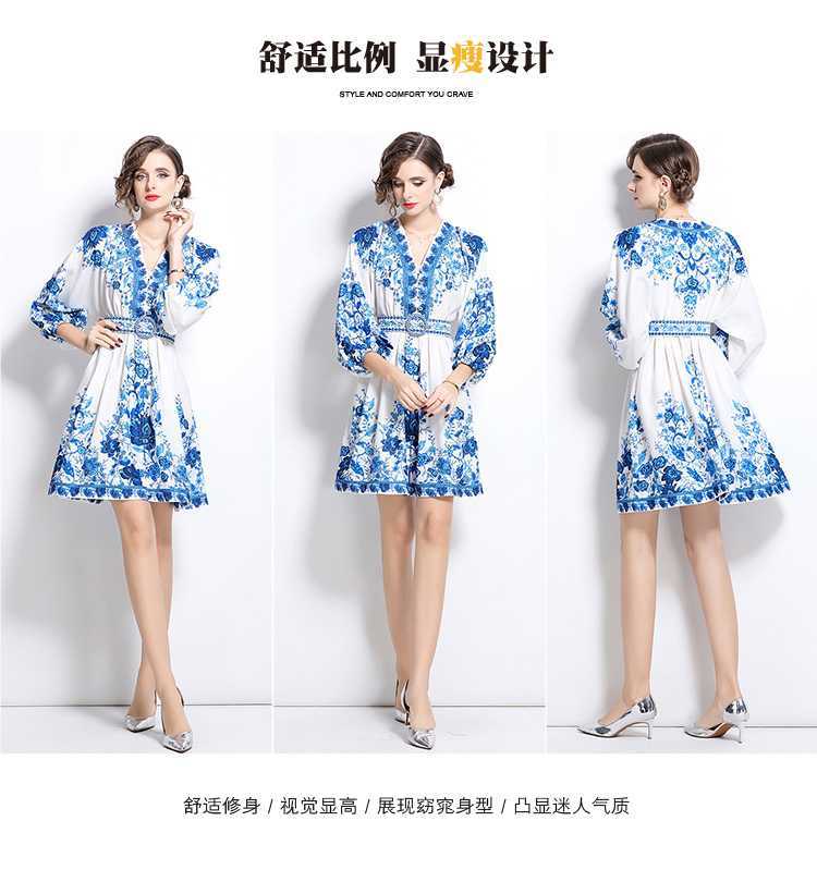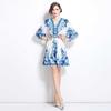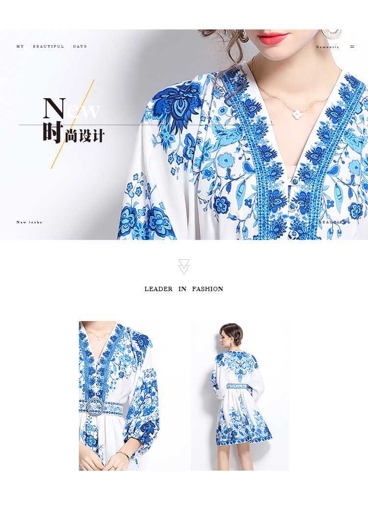 Foto Real en Stock - Estilo Palacio Retro Posicionamiento Estampado Manga Linterna Cuello V Cintura Adelgazante Look Vestido de un Solo Botón
