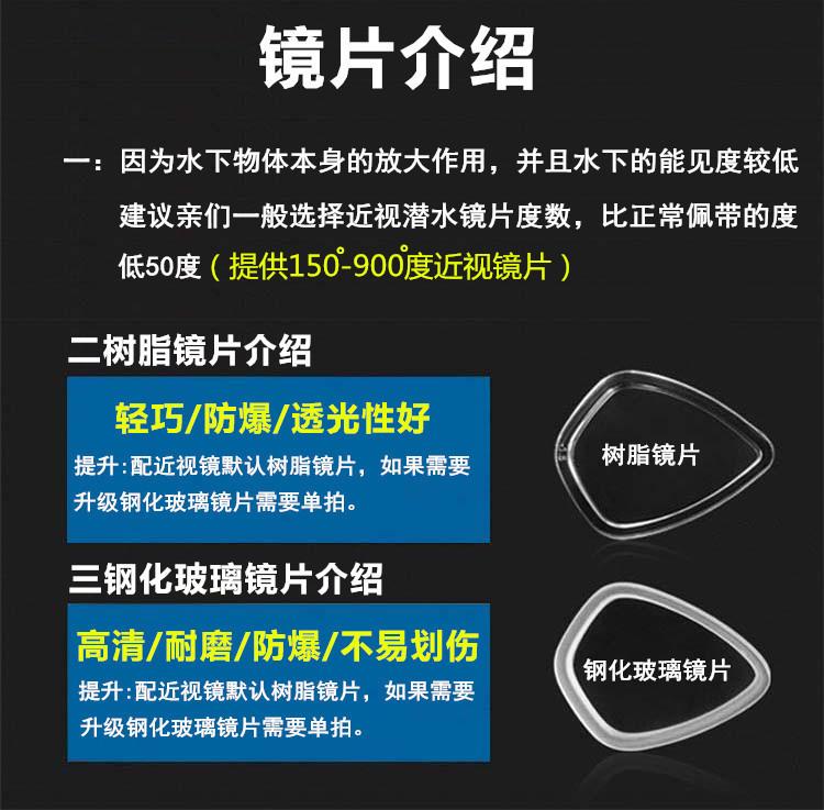 estepagoLa máscara puede equiparse con lentes de miopía a prueba de explosiones (150, 200, 250, 300.......700 grados, con un intervalo de 50 grados. Debido a la influencia del índice de refracción subacuático, se recomienda usar 50 grados menos que el grado de miopía real). Si necesita lentes de miopía, comuníquese con el cliente, indique el grado de miopía de ambos ojos y compense la diferencia en el precio de las lentes.。